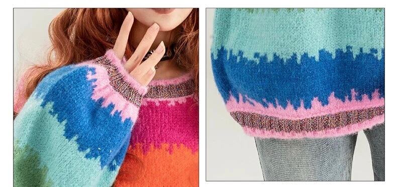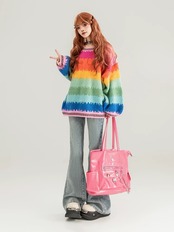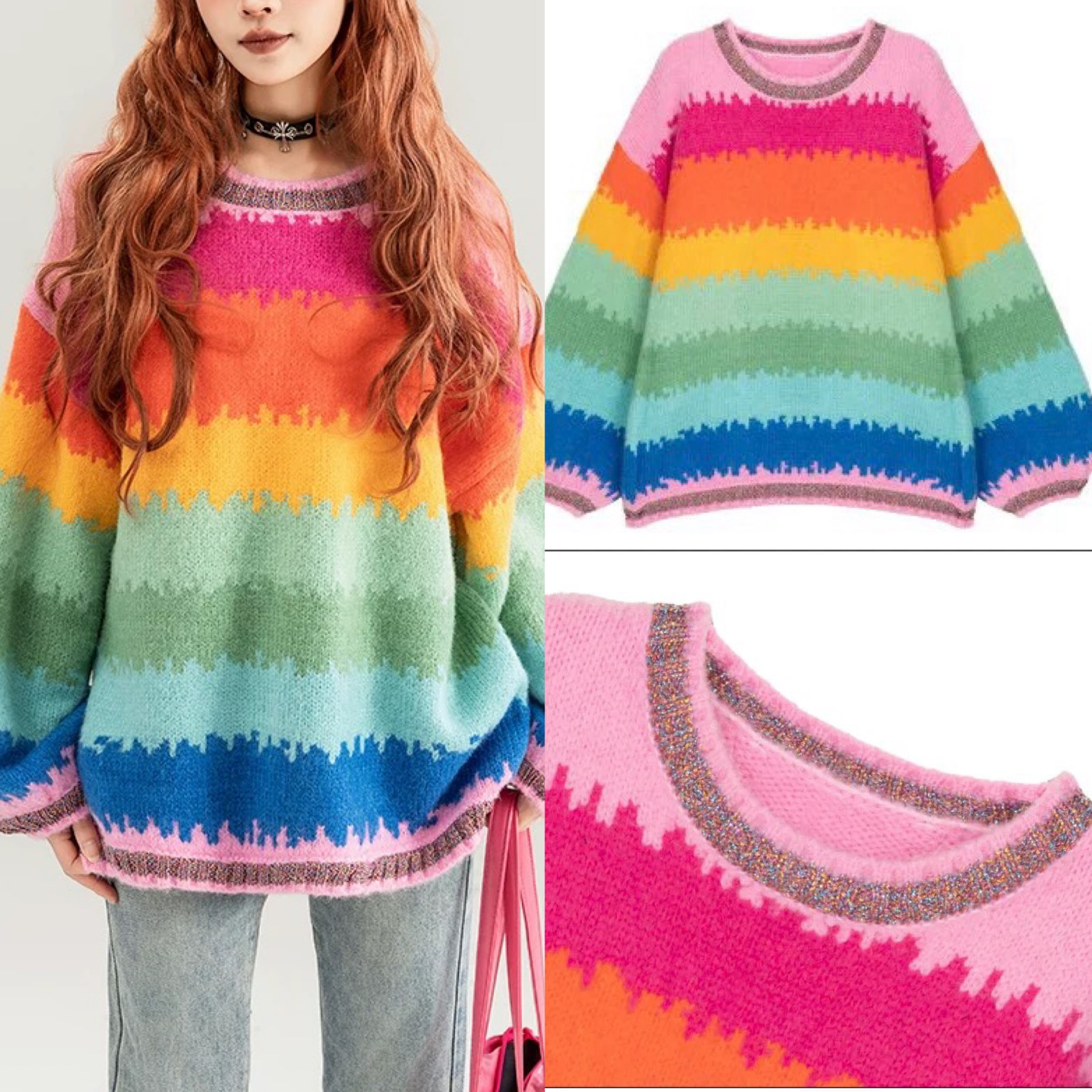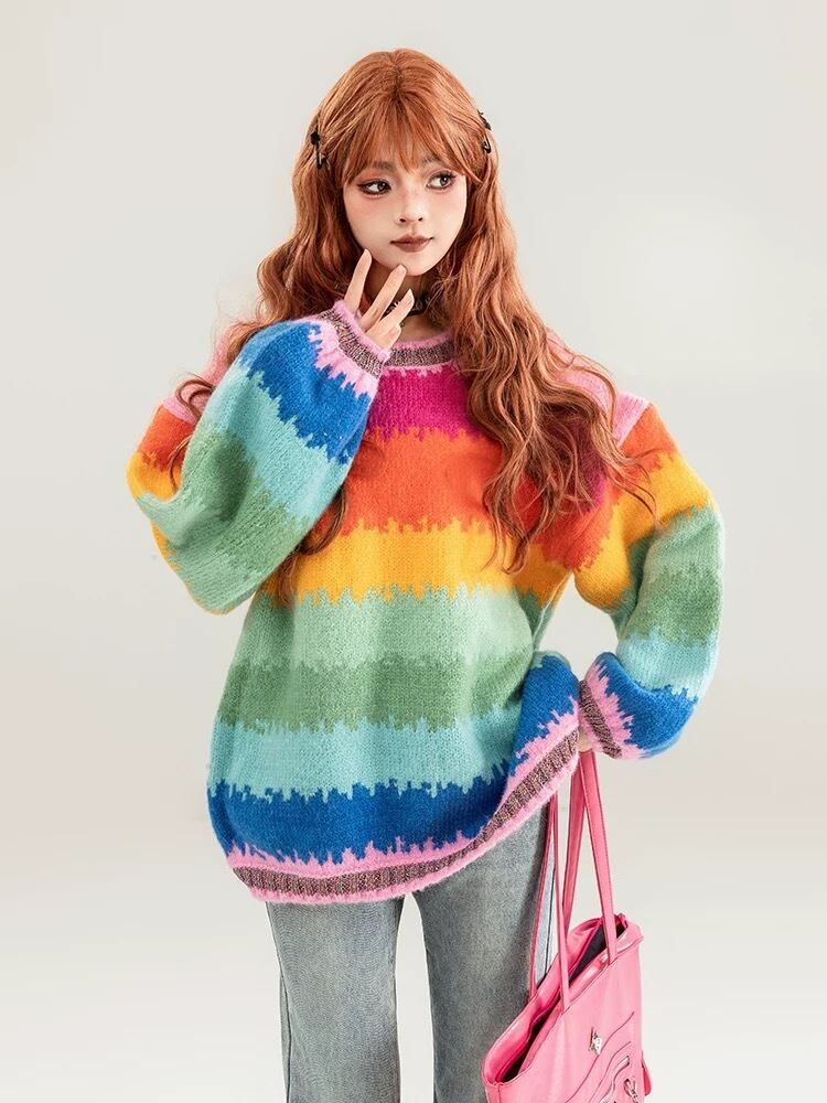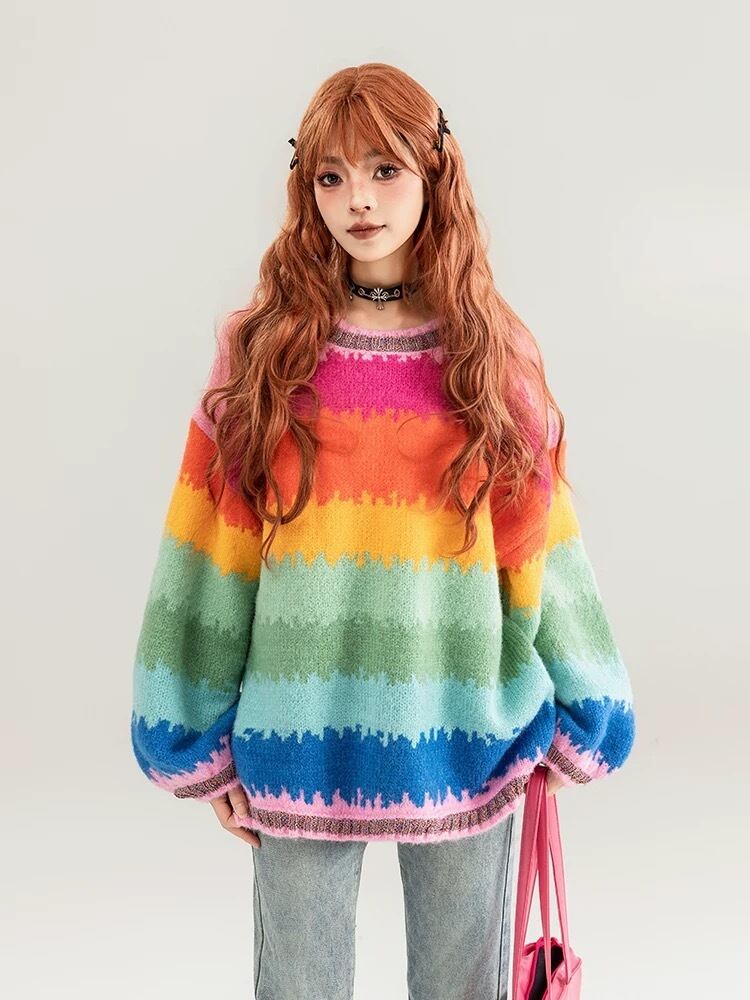 セーター カーディガン ボーダー レインボー ピンク オレンジ グリーン 虹 カジュアル オーバーサイズ