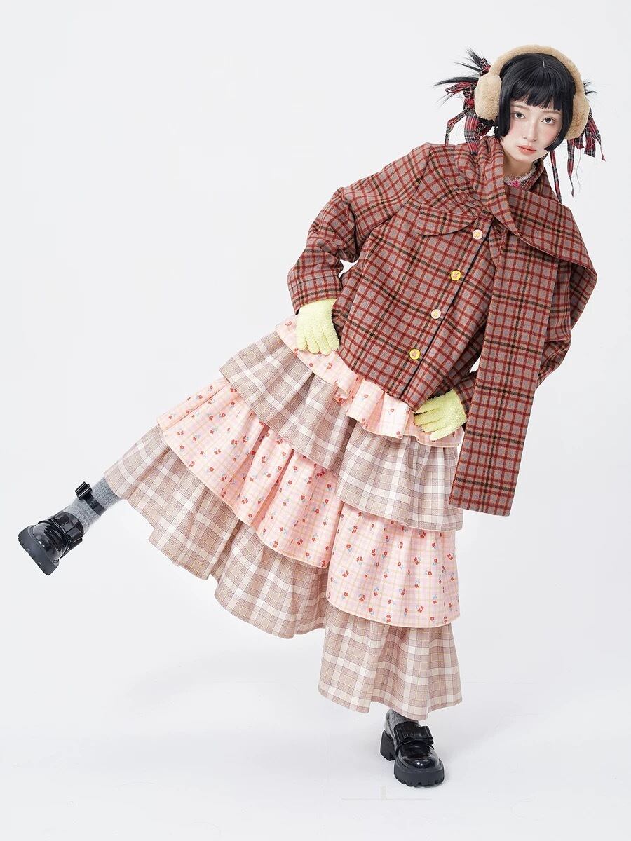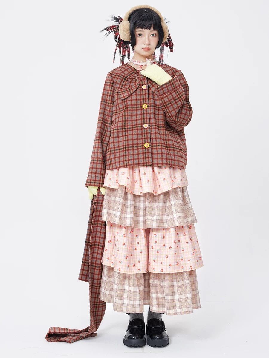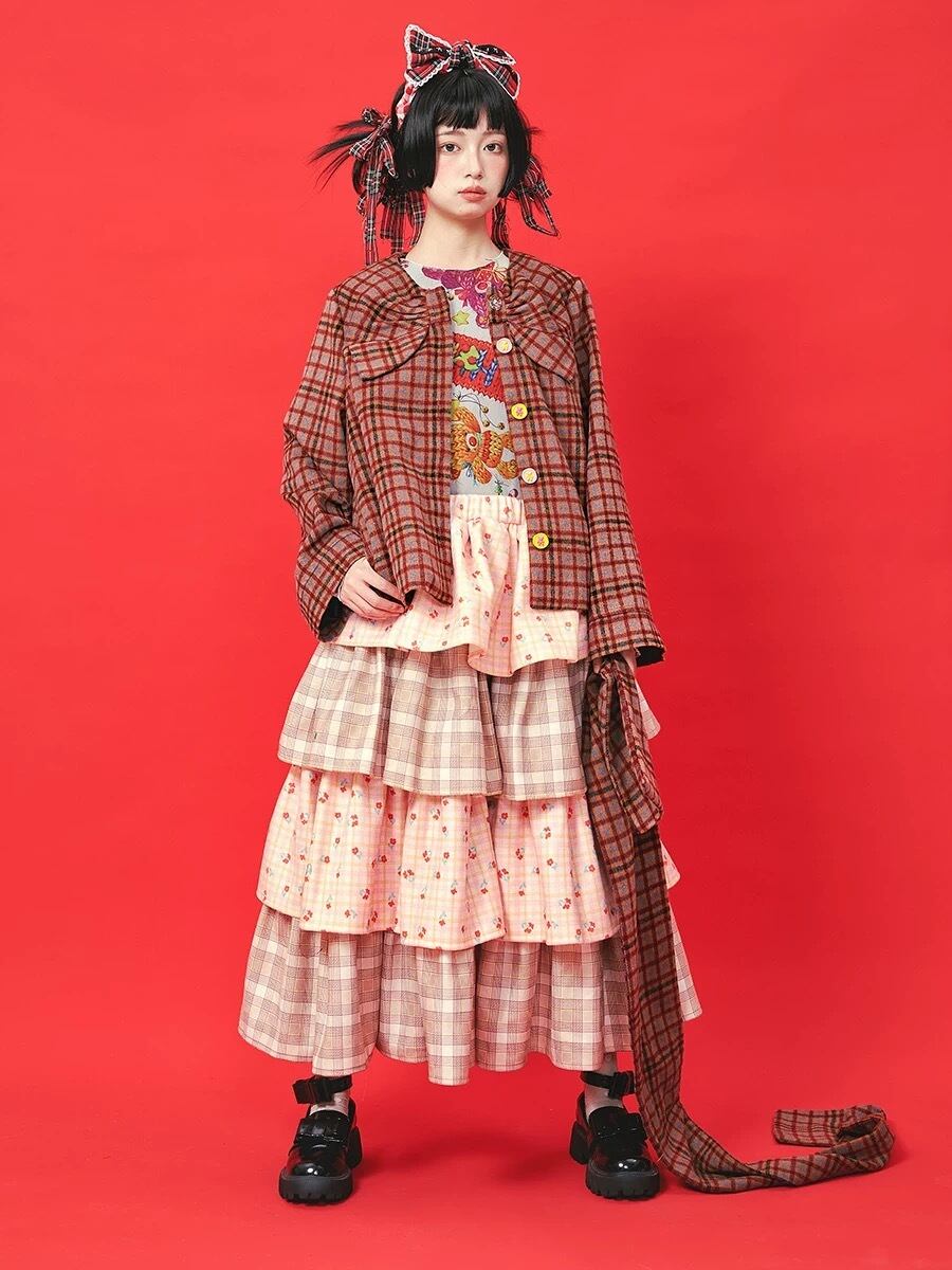 ジャケット アウター カーディガン チェックガーリー コート アウター 茶色 赤 黄色