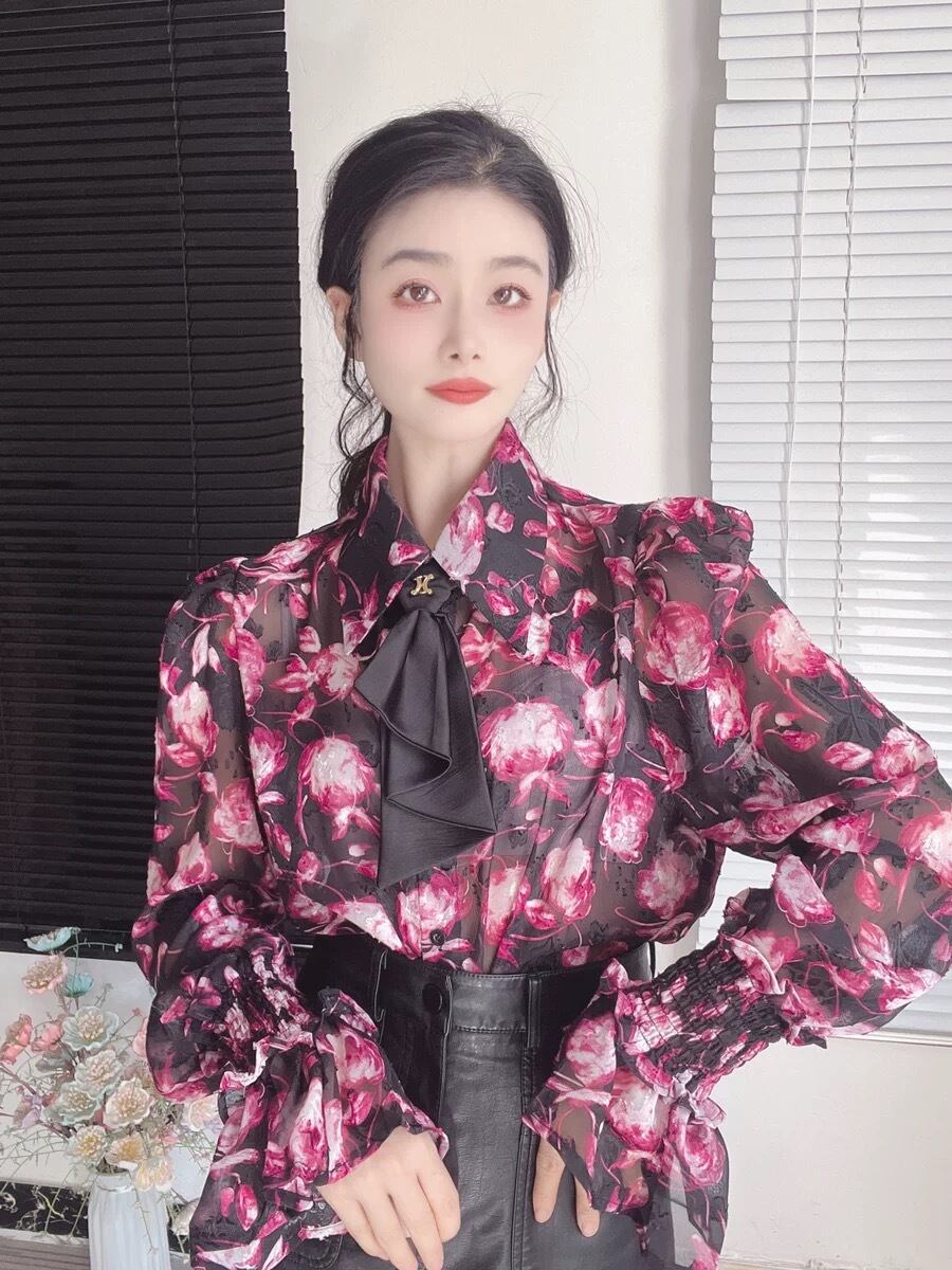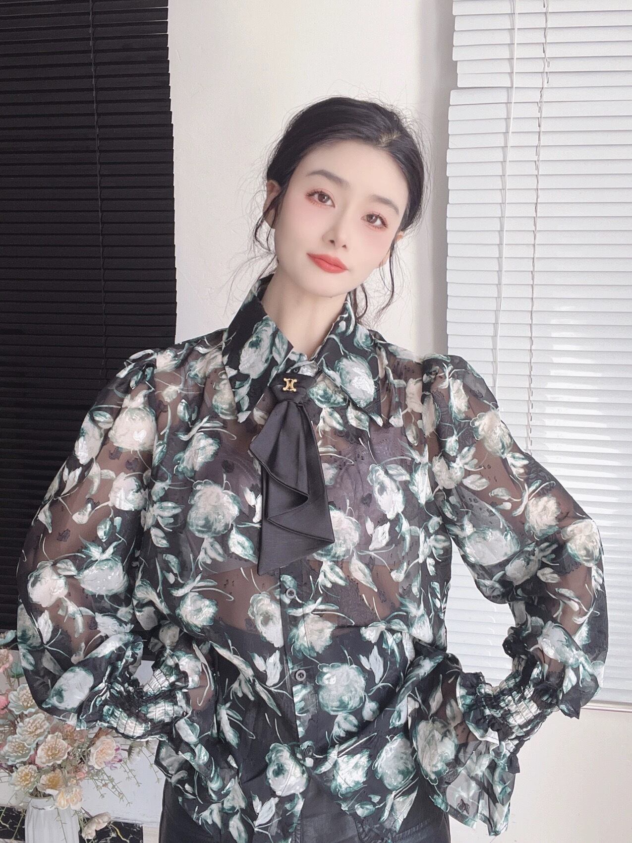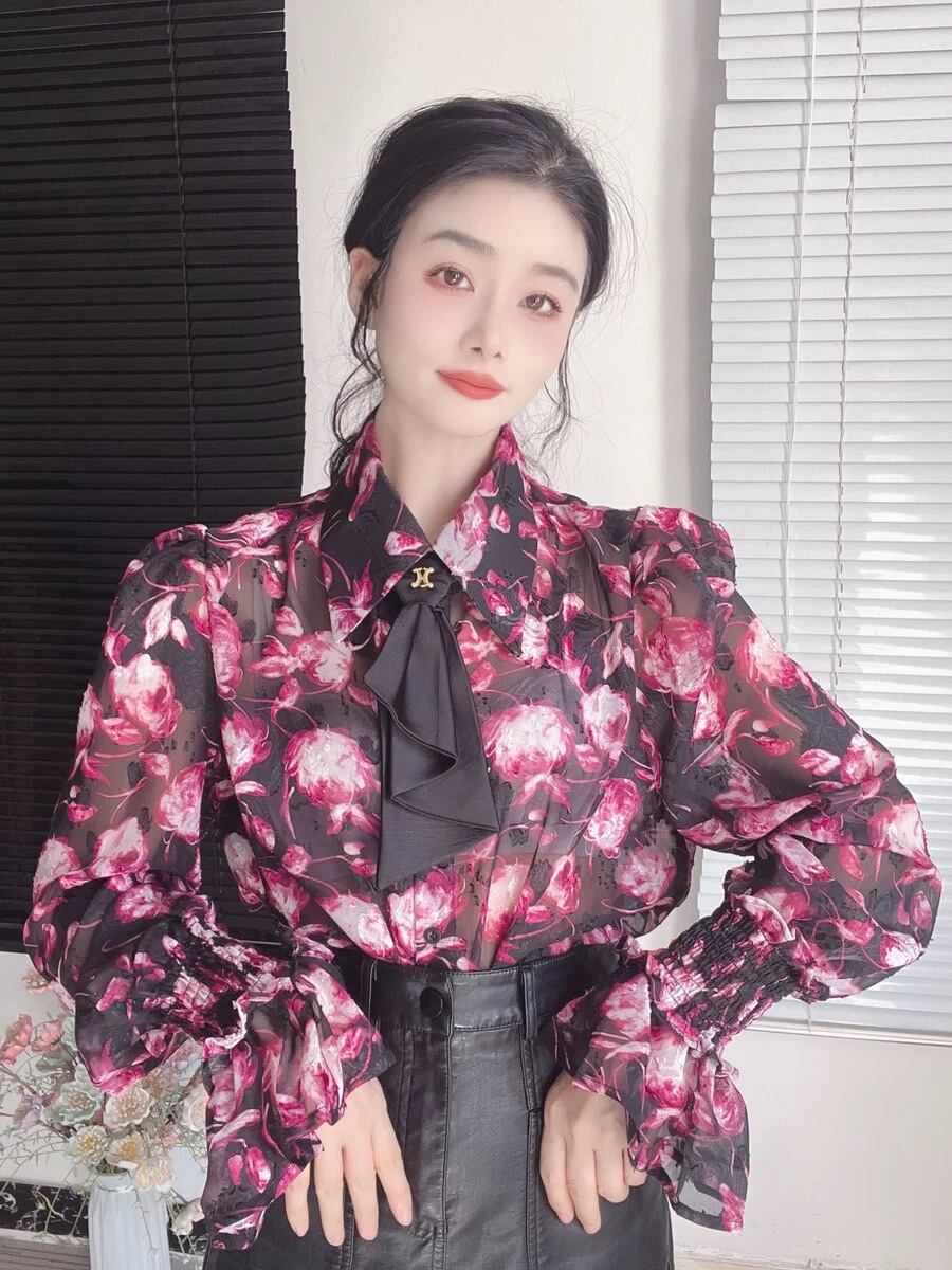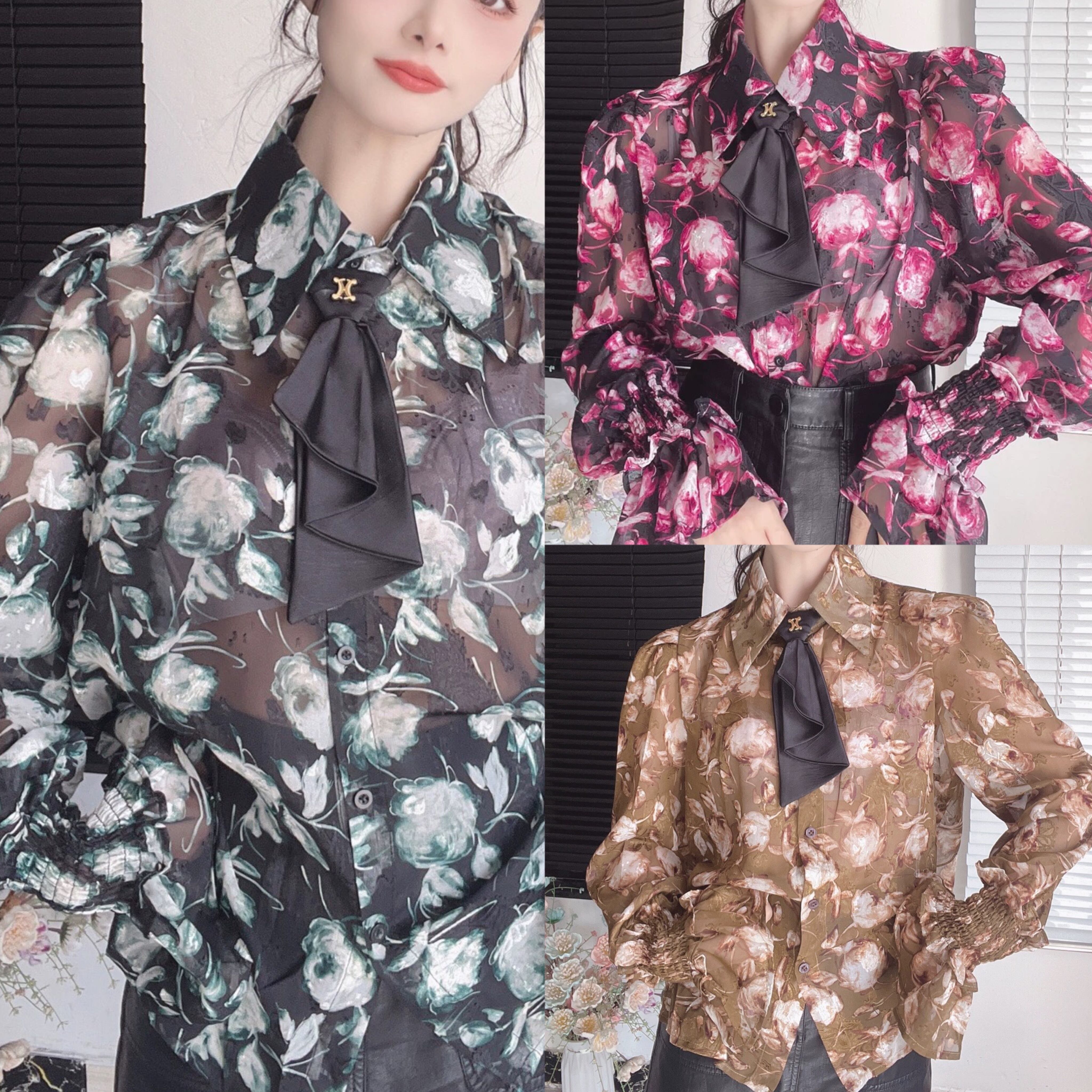 ブラウス 花柄 フラワー ピンク 緑 黒 トップス リボン ベージュ