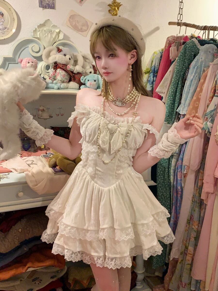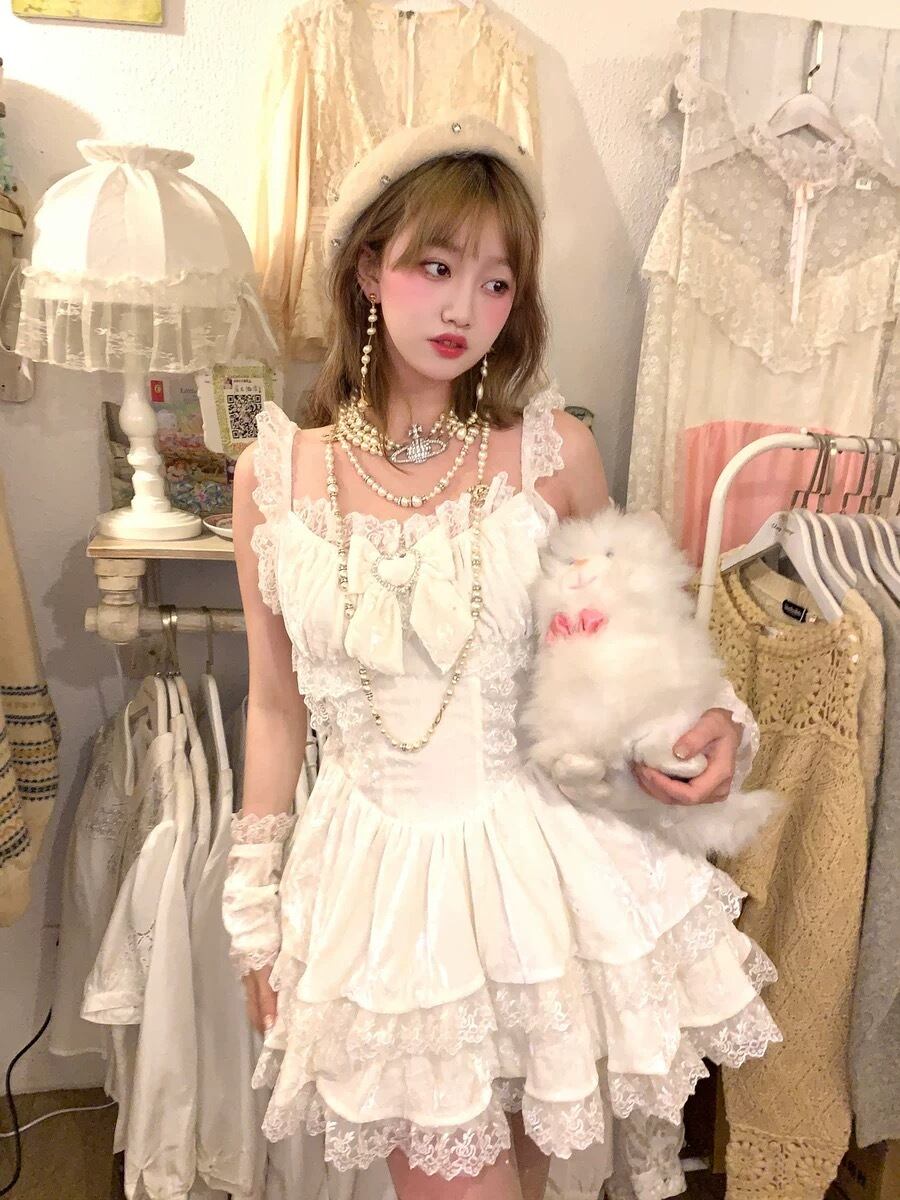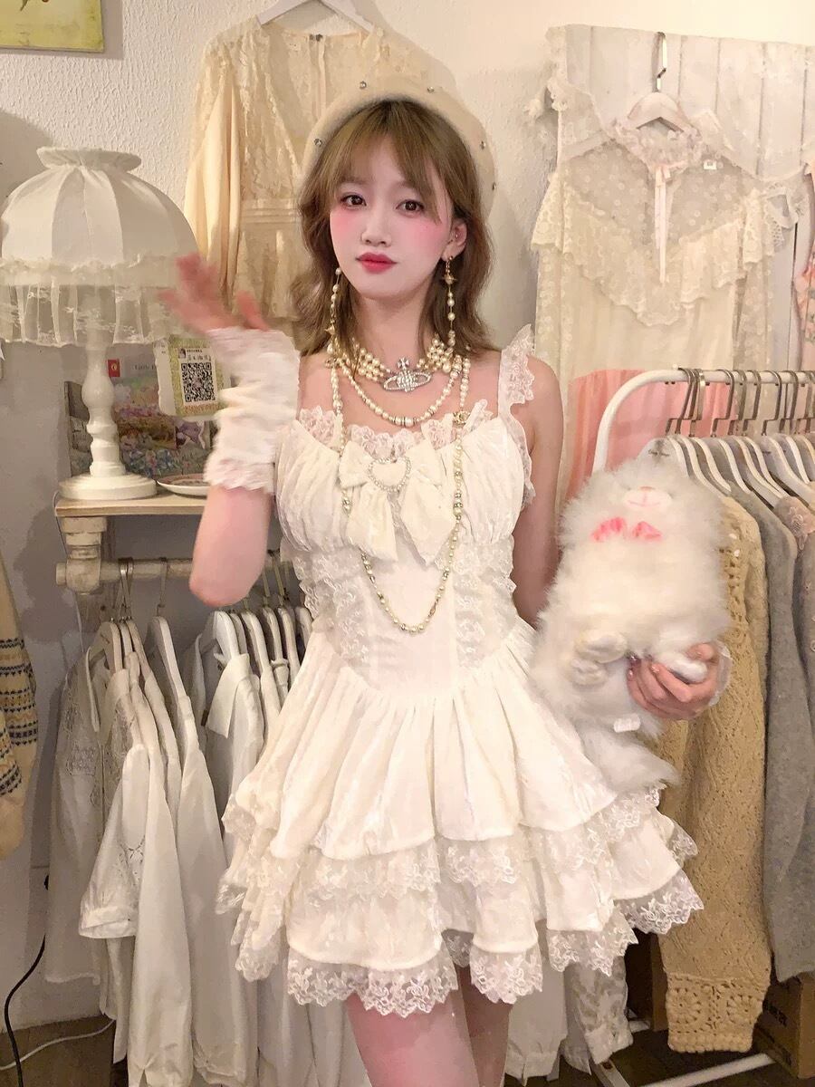 白 リボン フリル ワンピース 水玉 可愛い キャミソール 半袖 ガーリー 姫 ドット リボン ガーリー