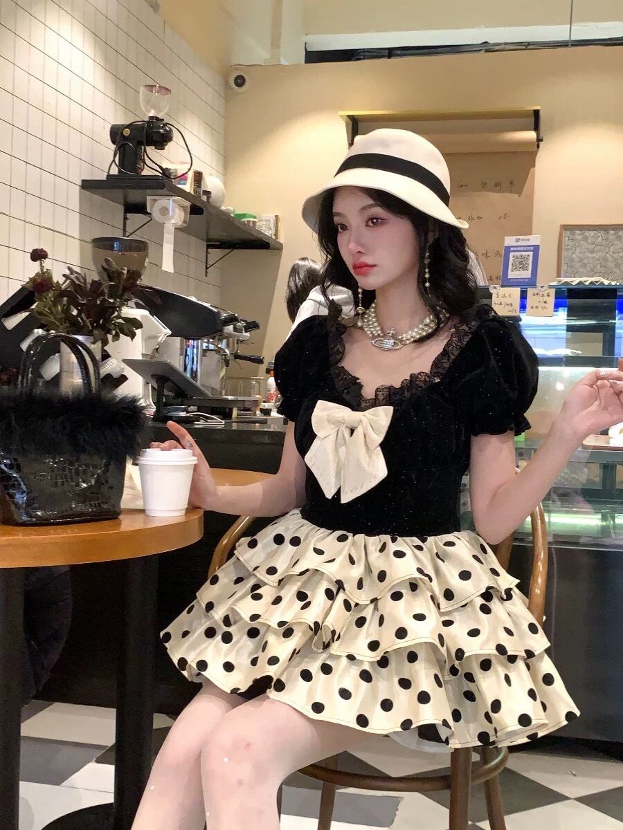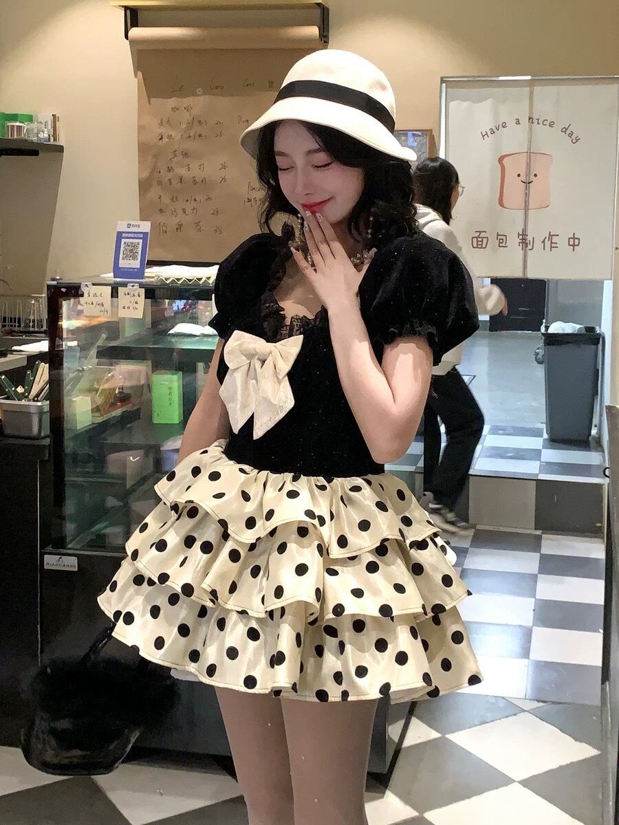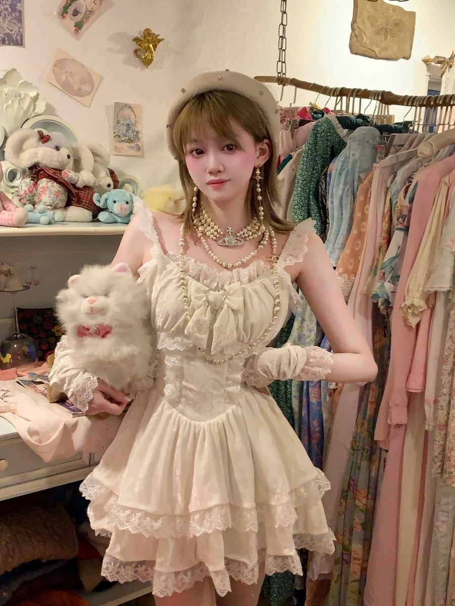 白 リボン フリル ワンピース 水玉 可愛い キャミソール 半袖 ガーリー 姫 ドット リボン ガーリー