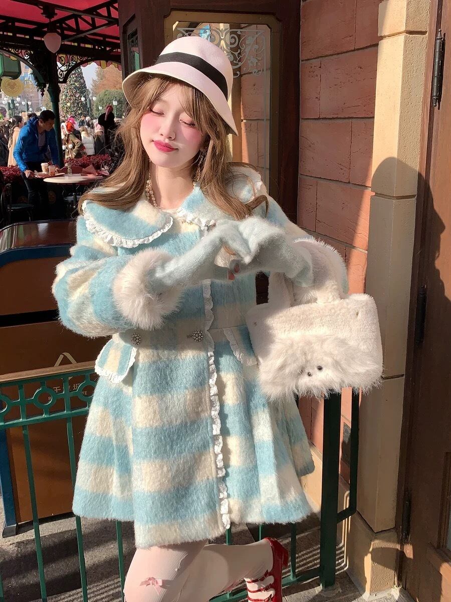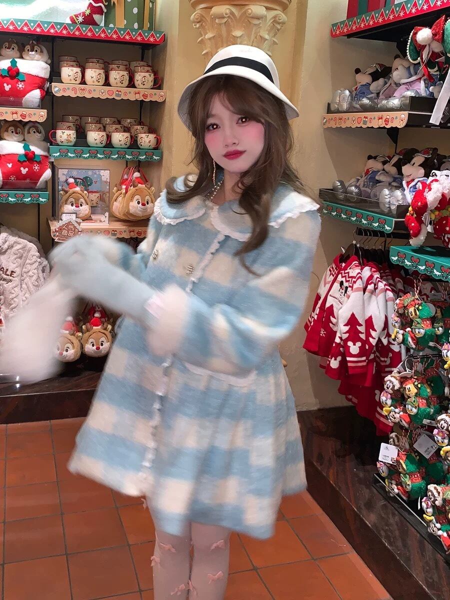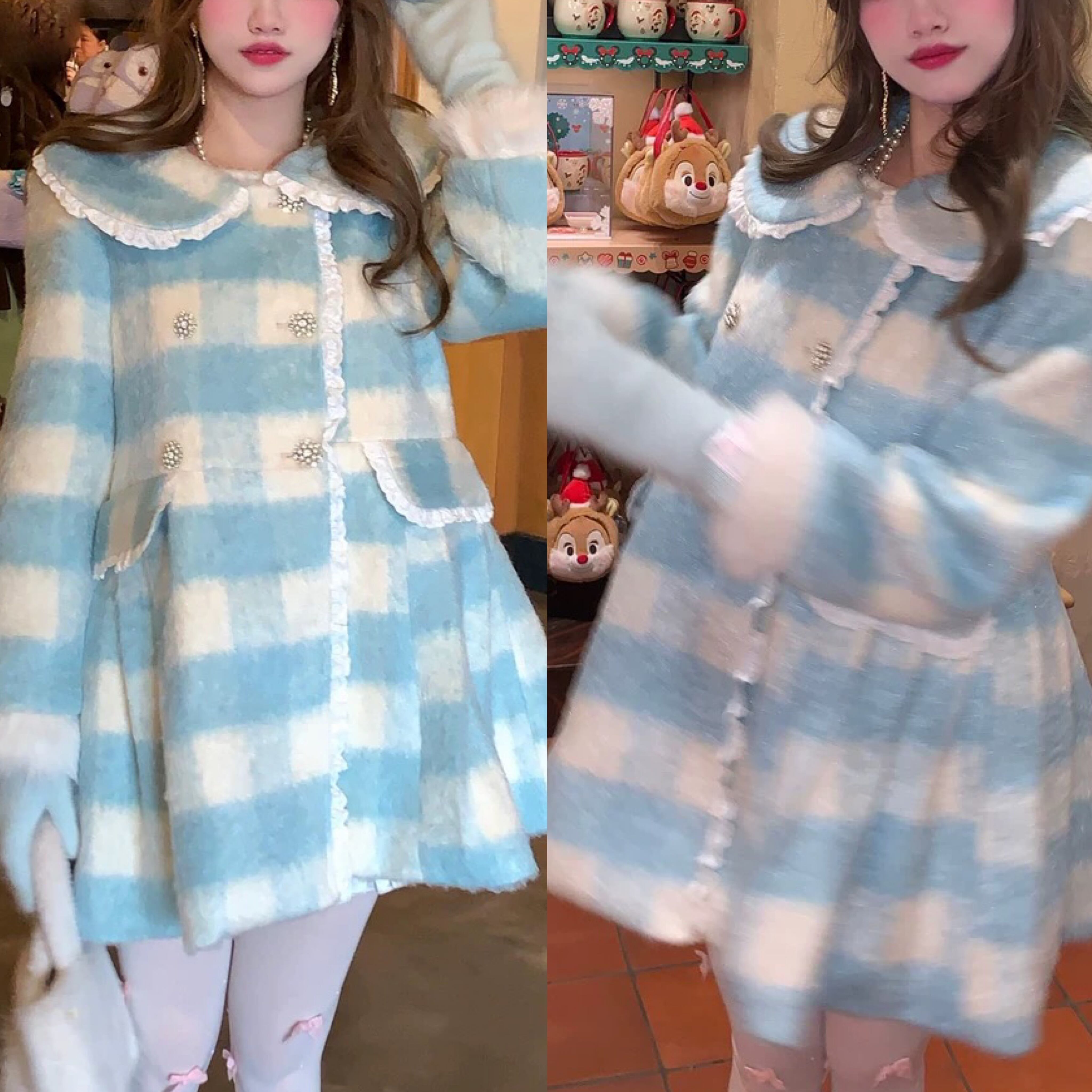 チェック 水色 丸襟 ガーリー ワンピース アウター コート 白 ガーリー 可愛い カーディガン