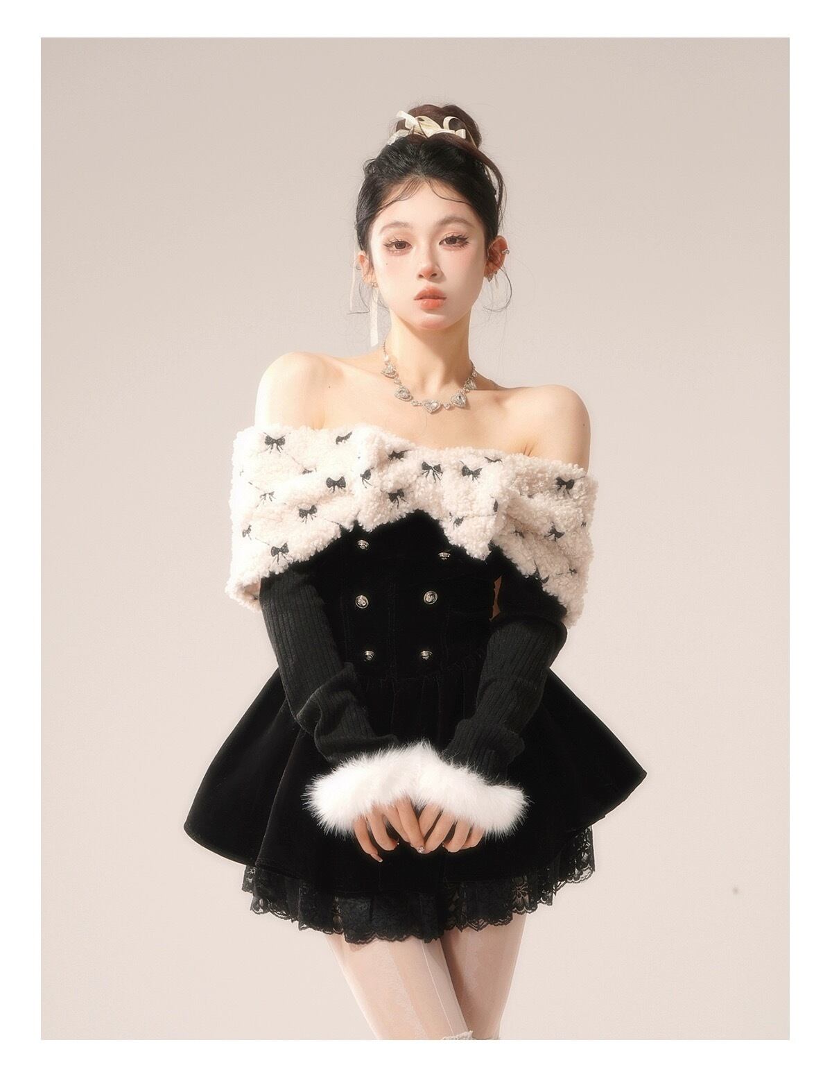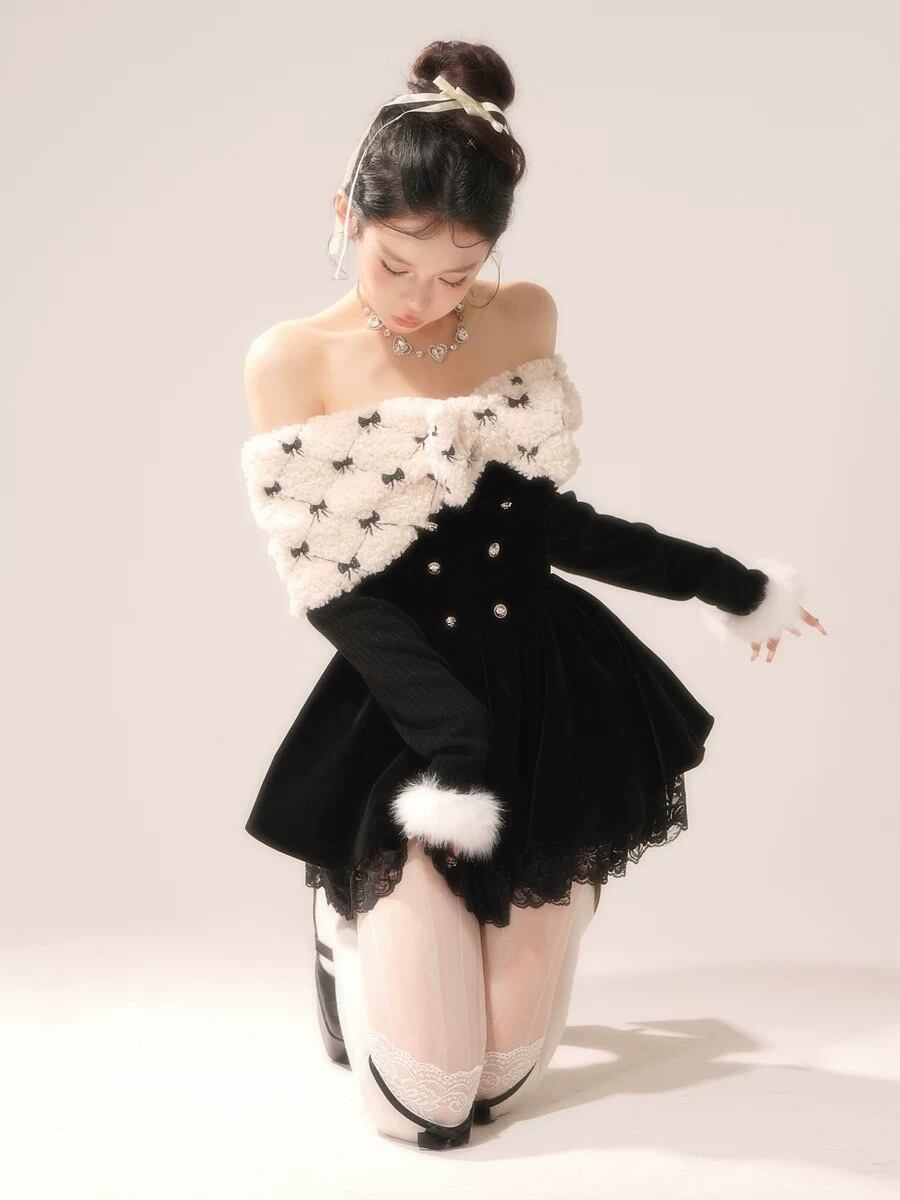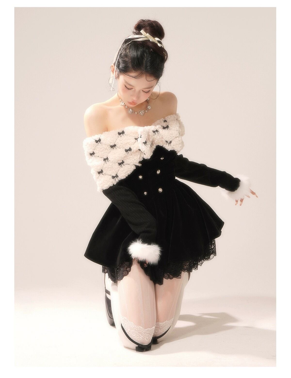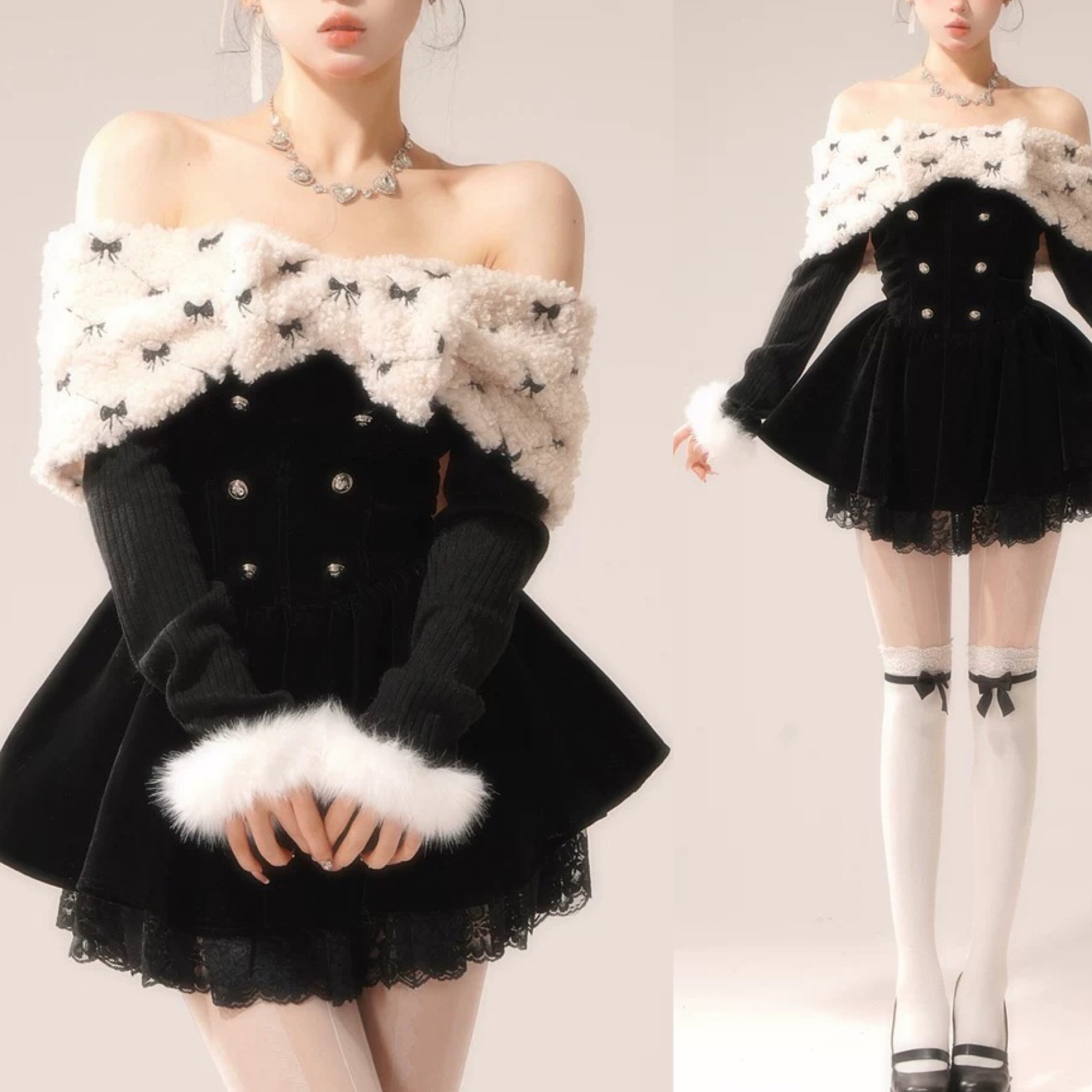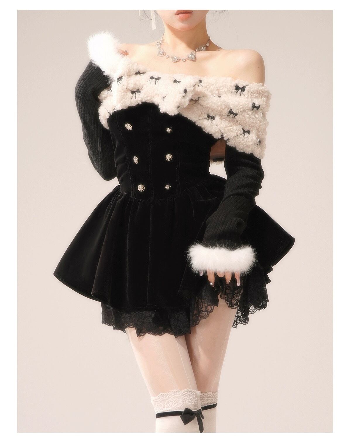 オフショルダー ワンピース 黒 ニット セーター ガーリー 姫 可愛い ドレス