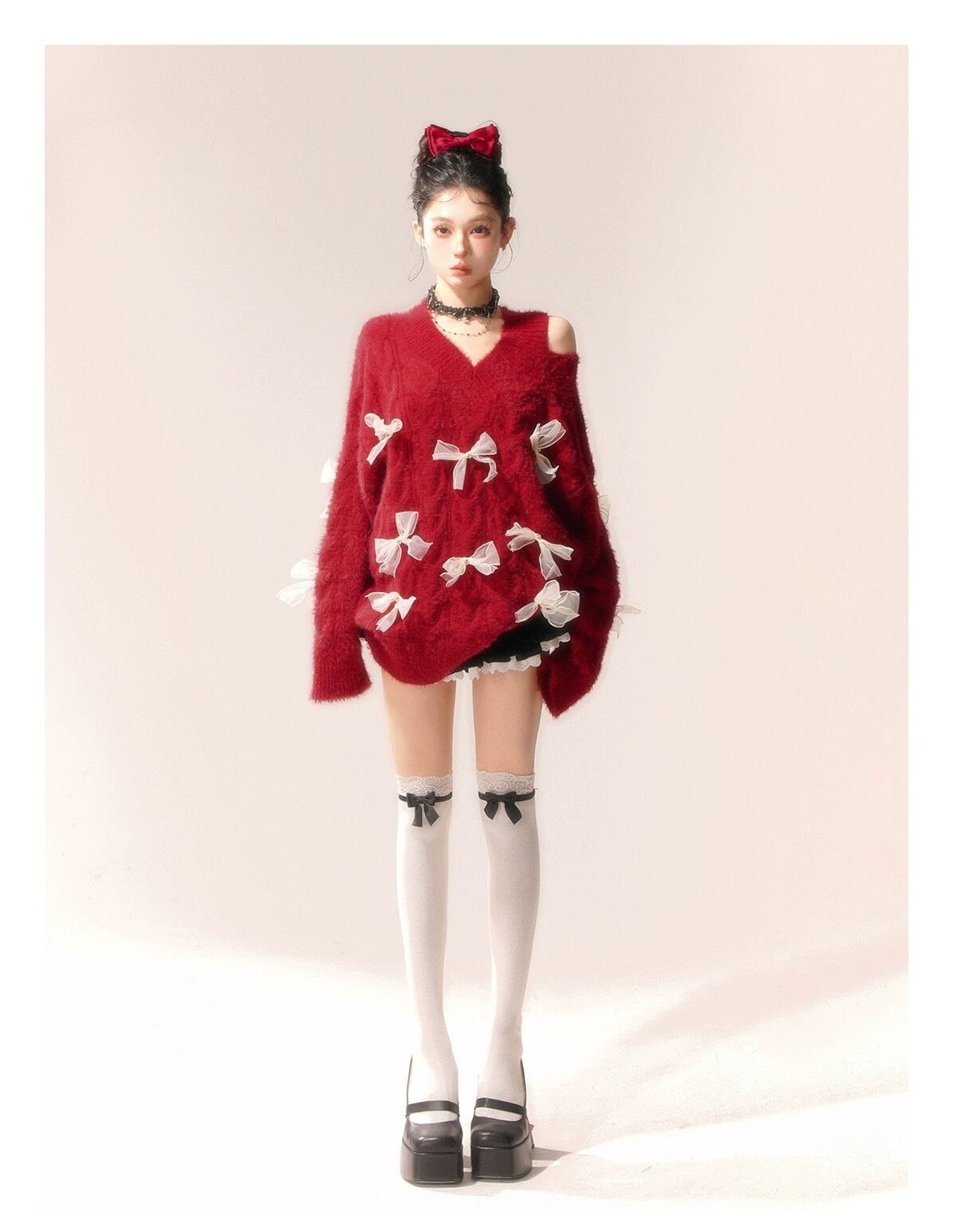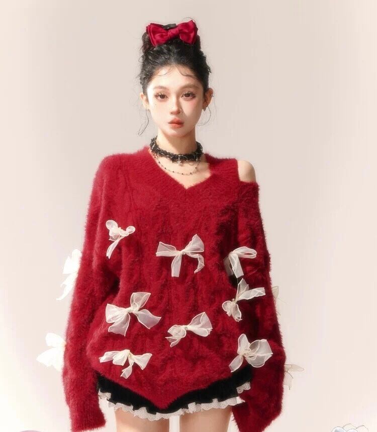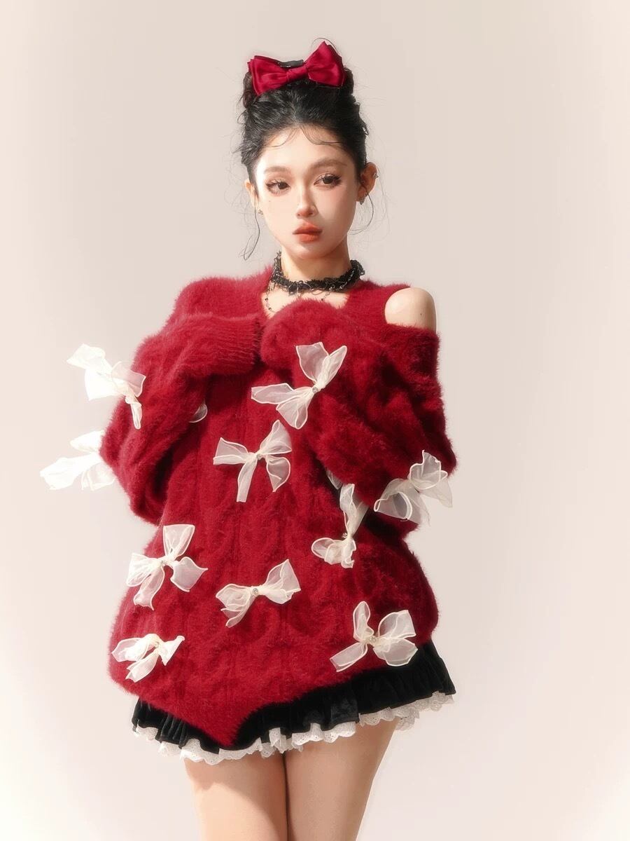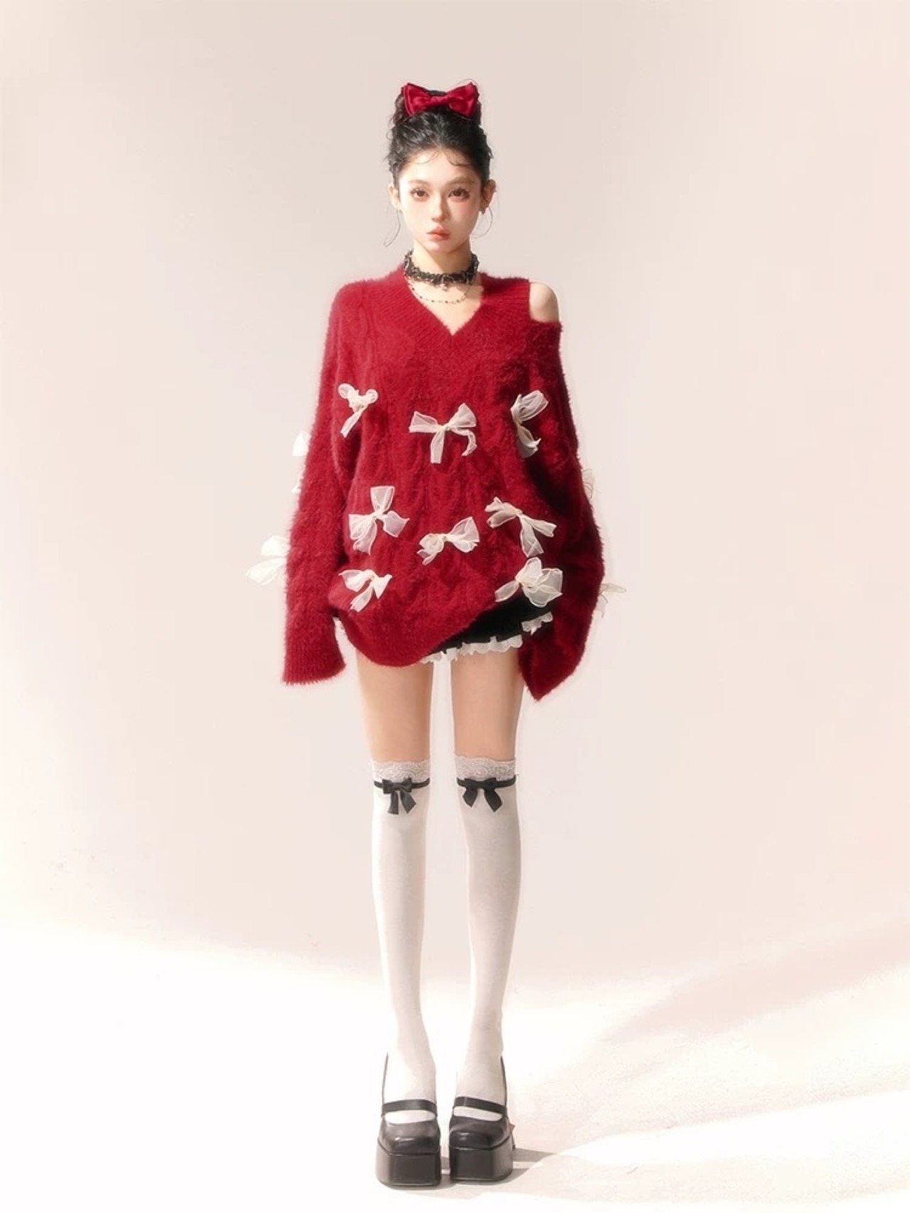 セーター オフショルダー 黒 赤 ニット カーディガン リボン