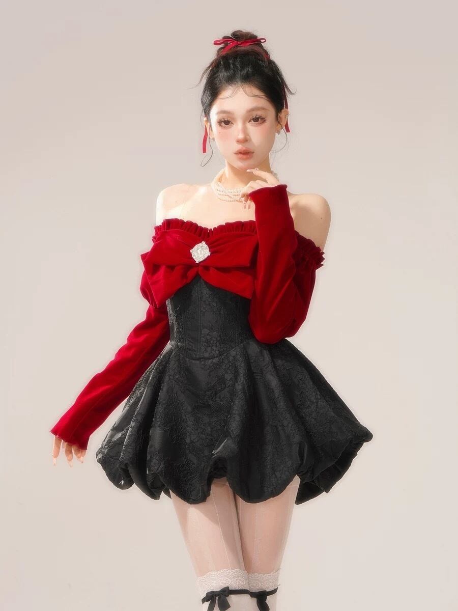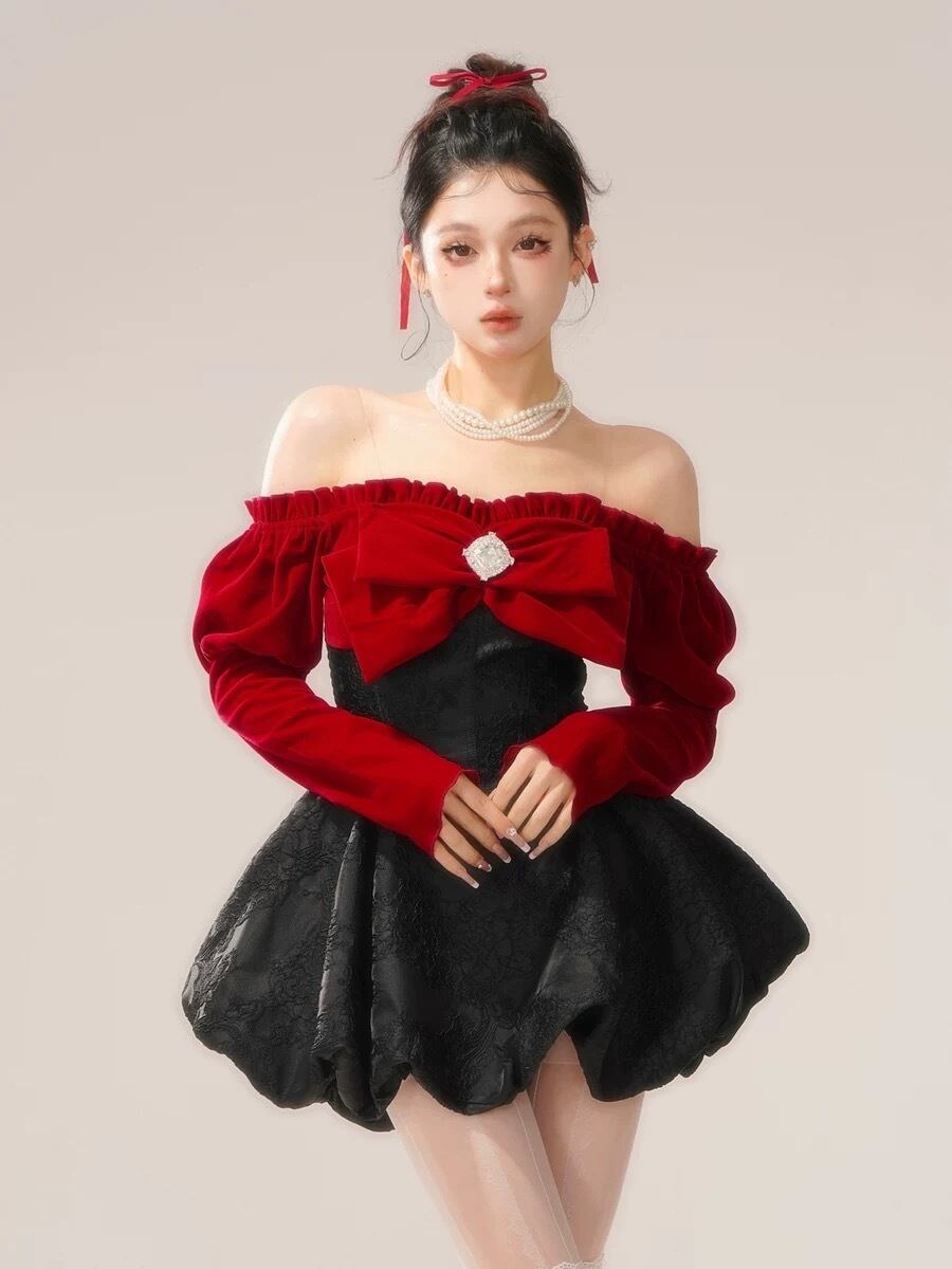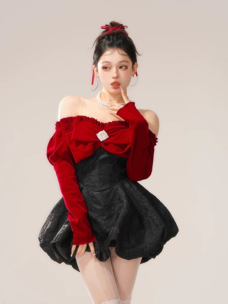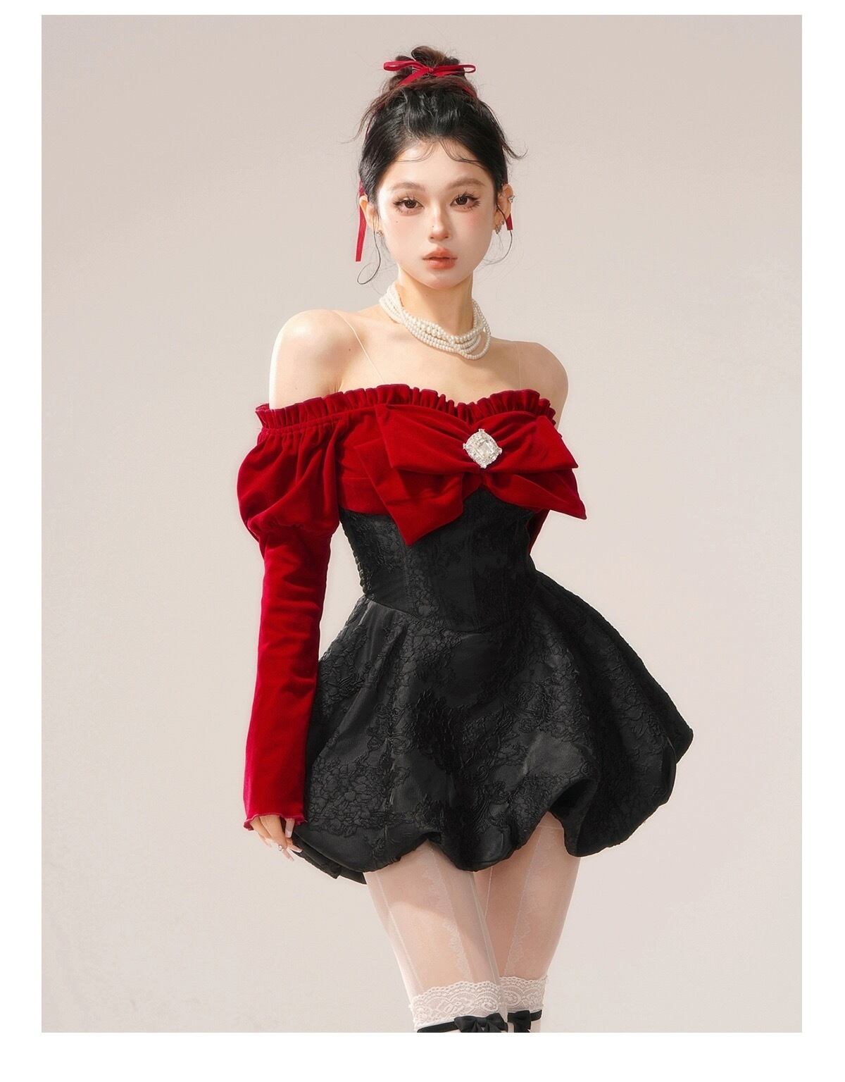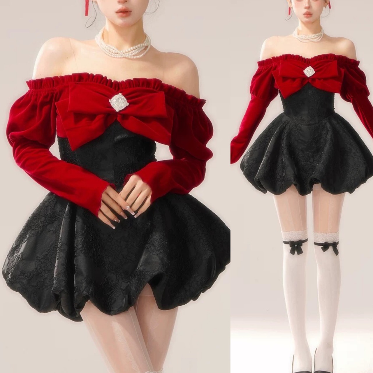 ワンピース オフショルダー ガーリー エレガント 姫 ドレス リボン 赤