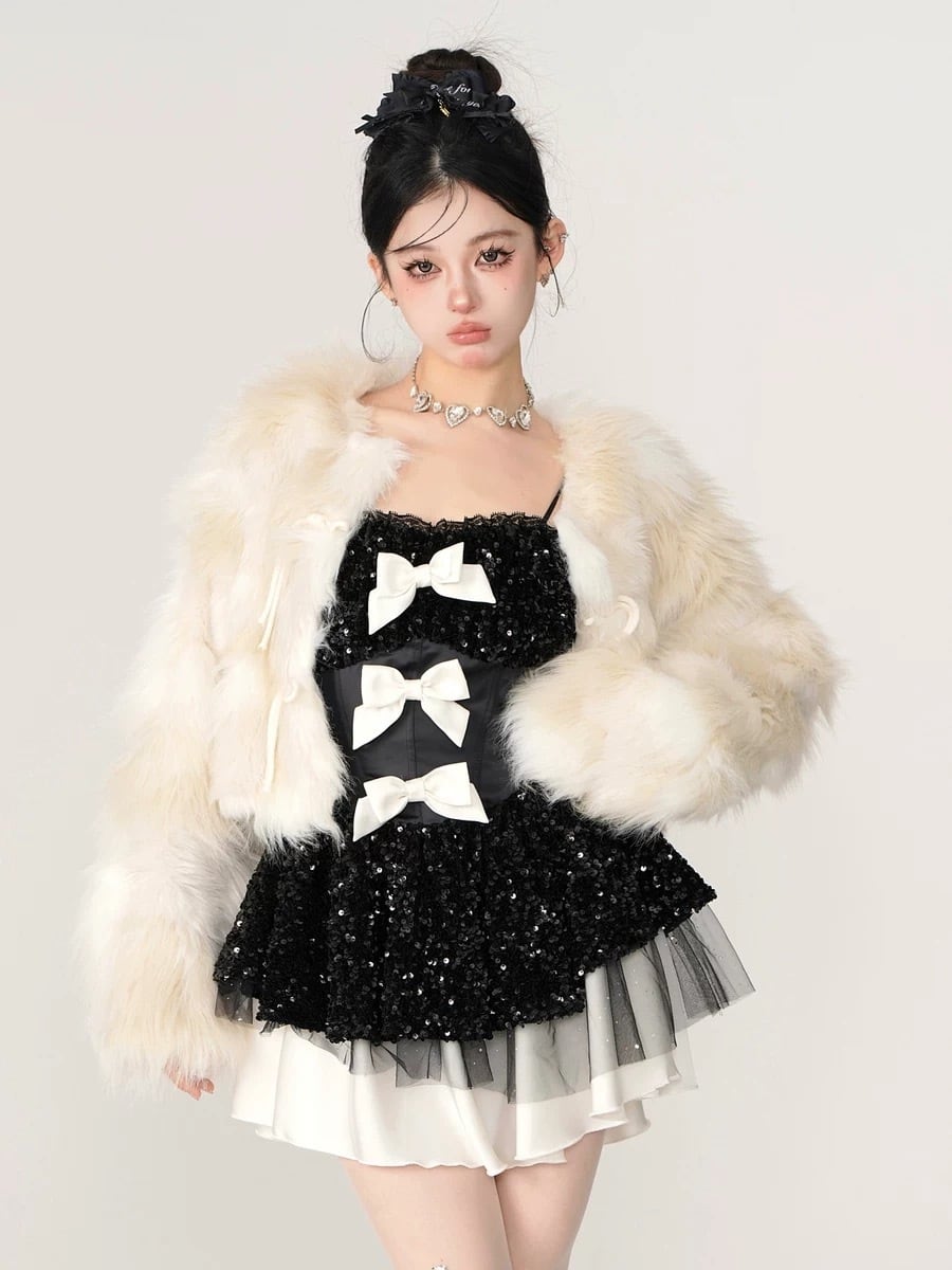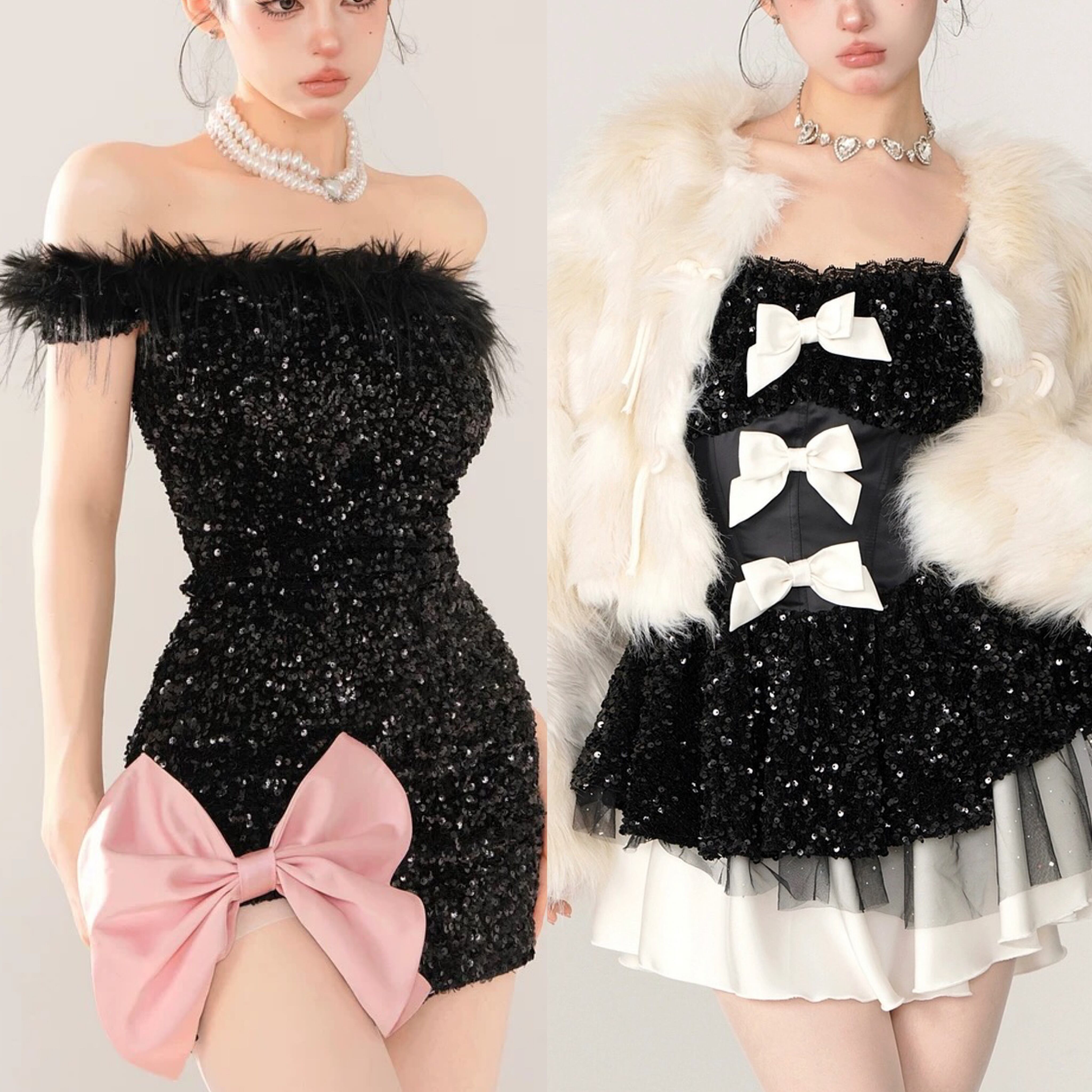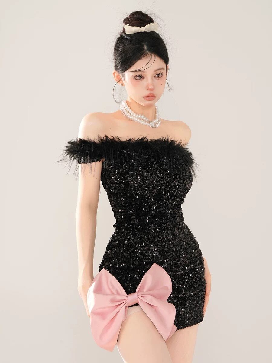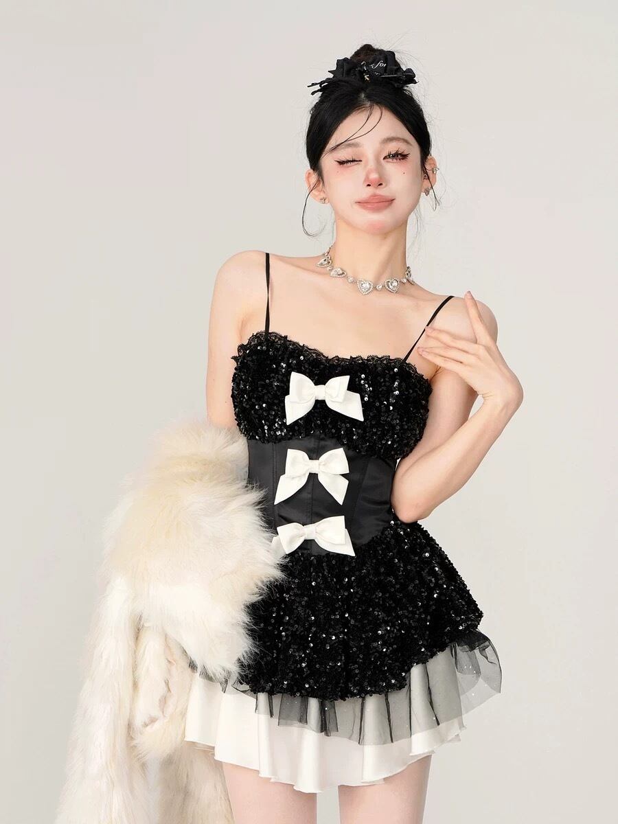 ワンピース スパンコール キラキラ リボン 黒 リボン 白 ピンク キラキラ パーティー ドレス
