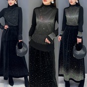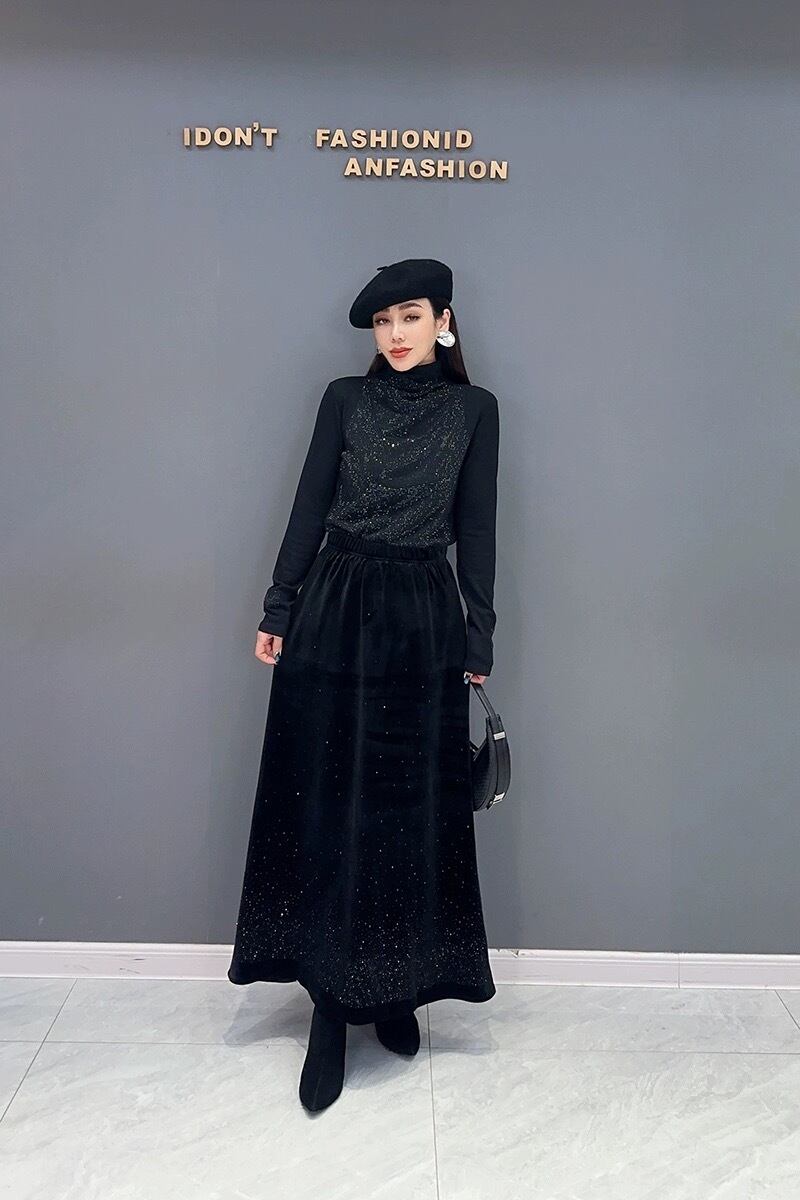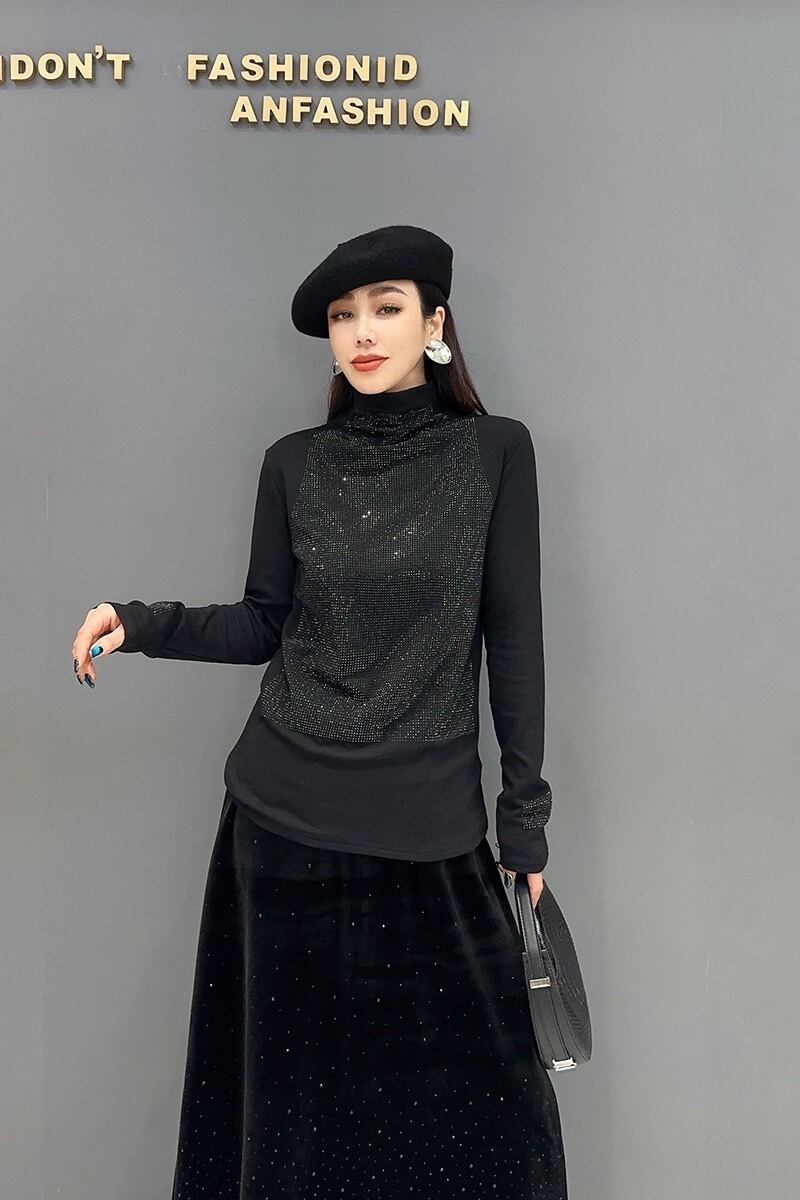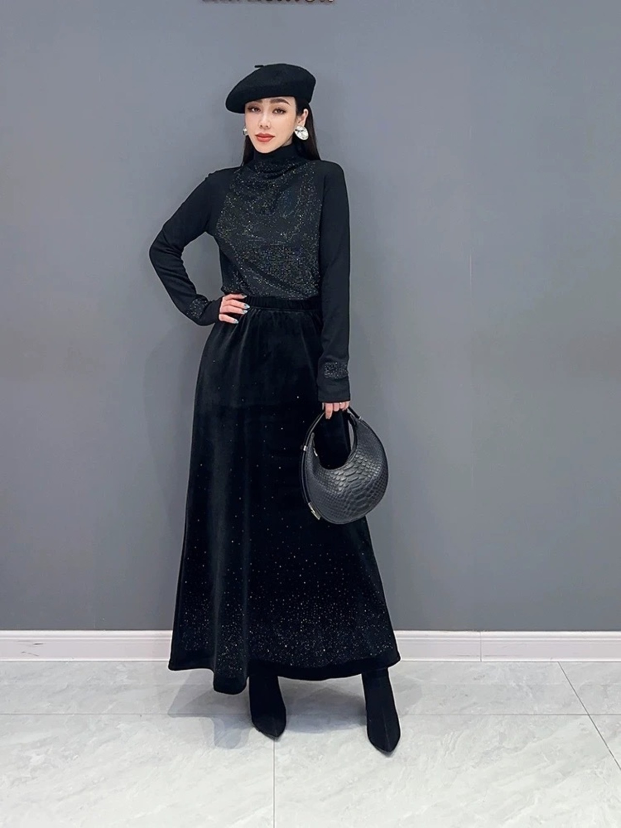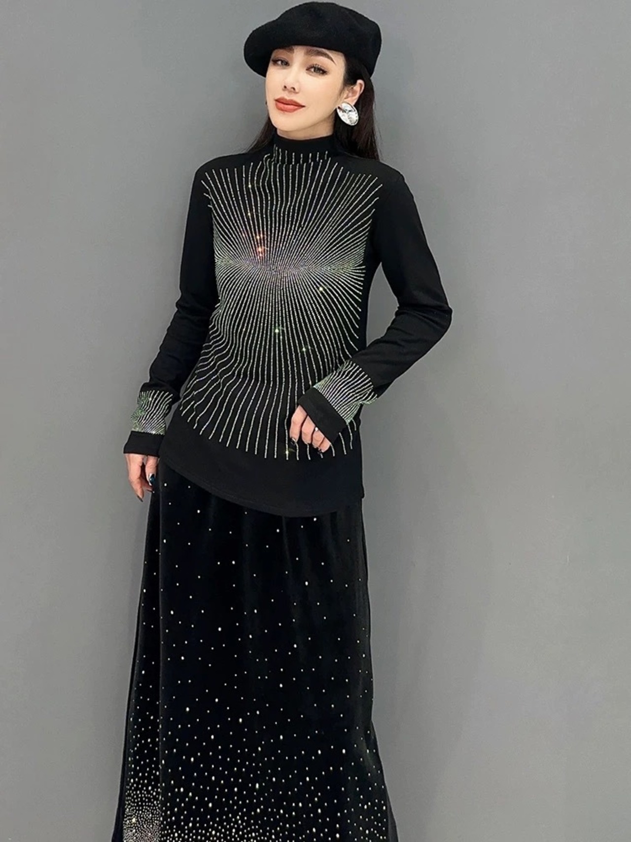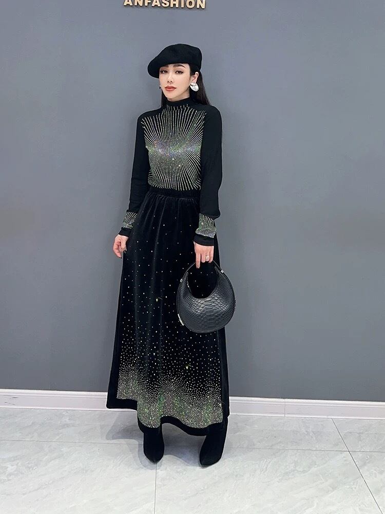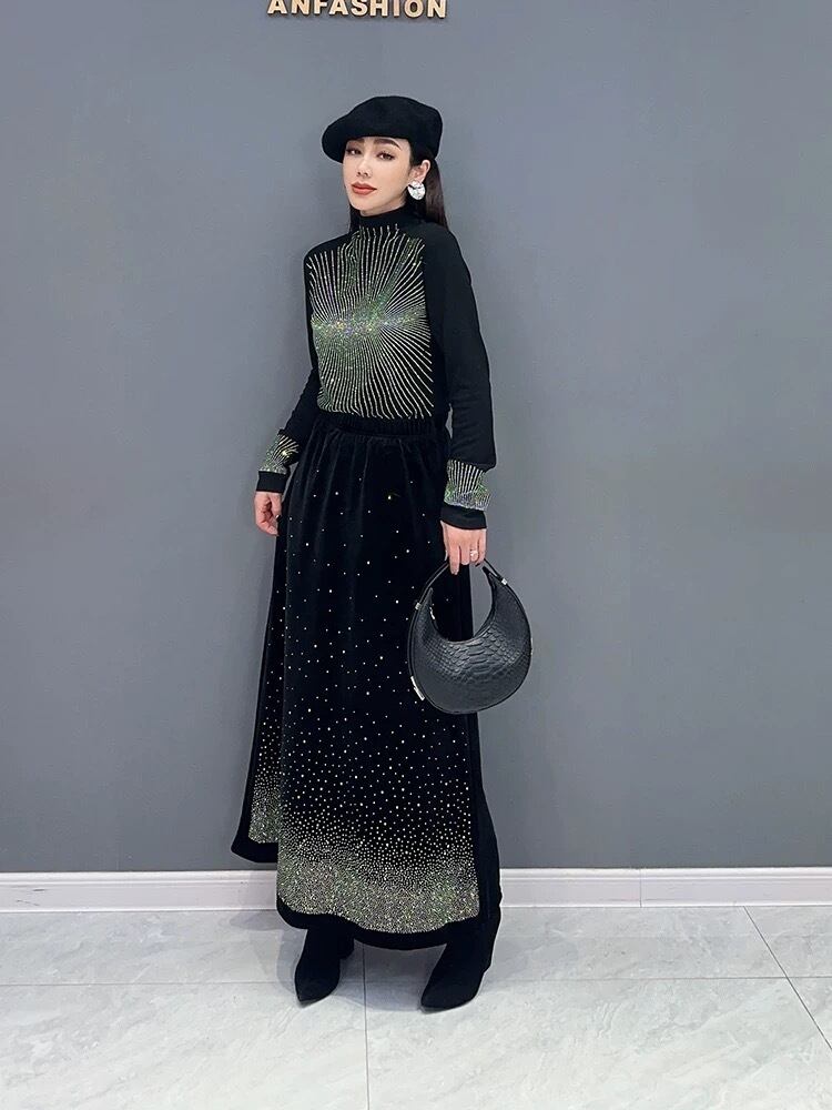 【セットアップ】黒 ラインストーン キラキラ ハイネック スカート ワンピース エレガント XL ツーピース キラキラ