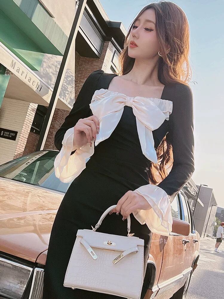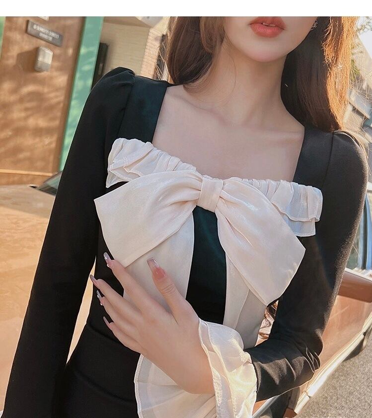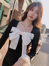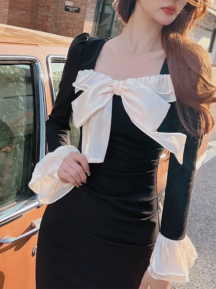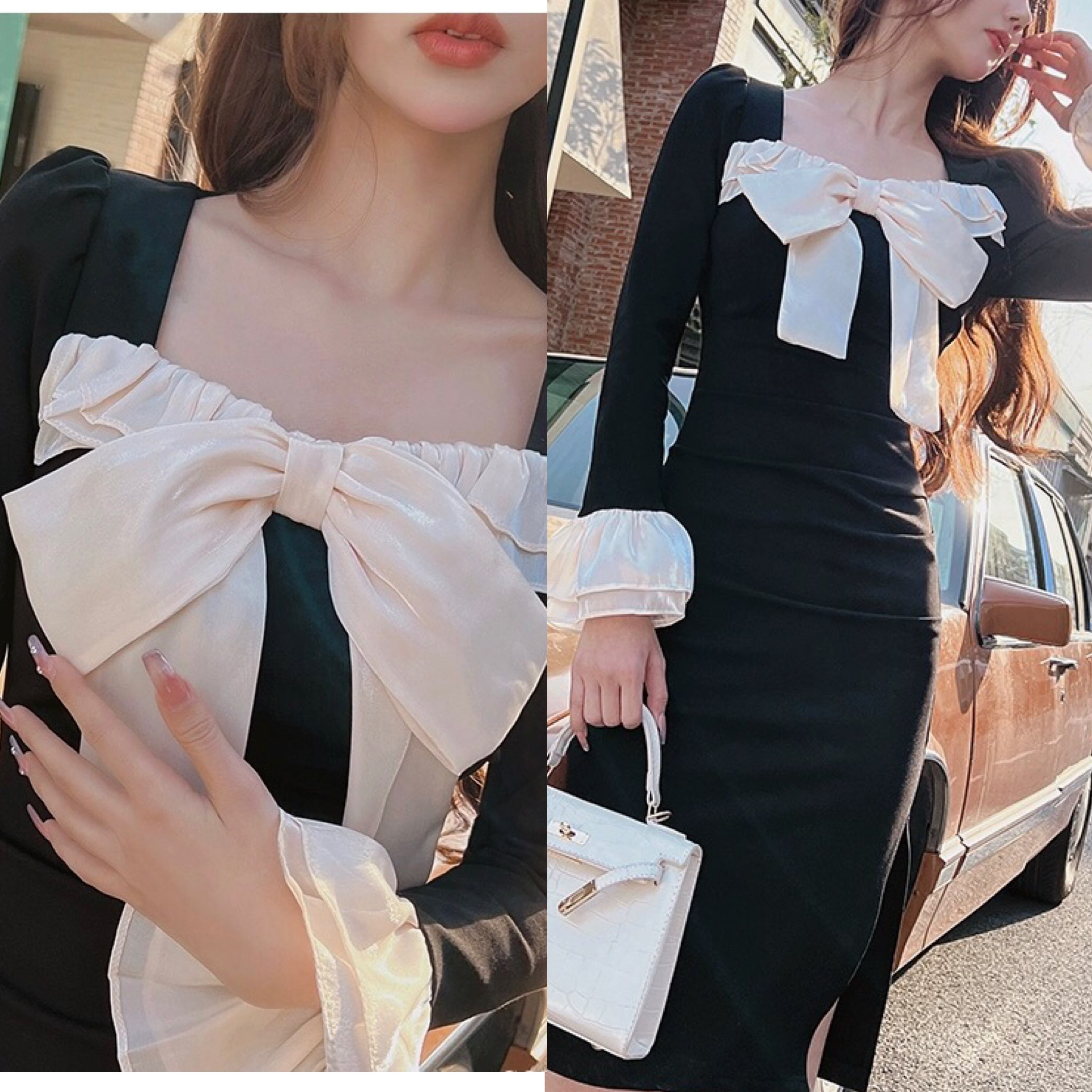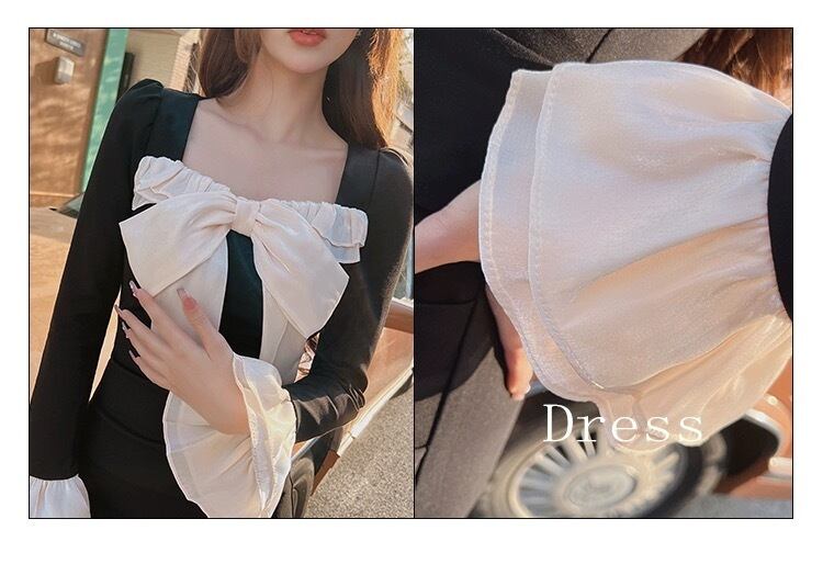 ワンピース エレガント マーメイド ブラウス リボン 可愛い お嬢様 ベージュ トップス スカート 黒