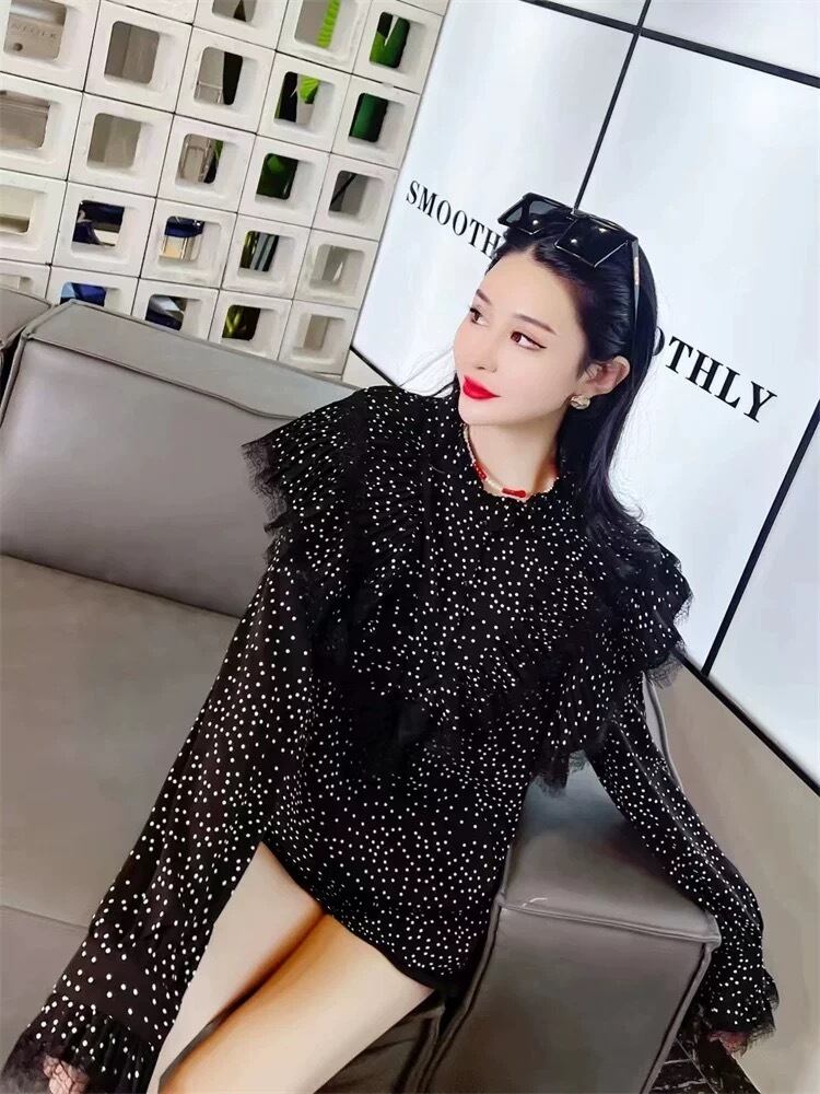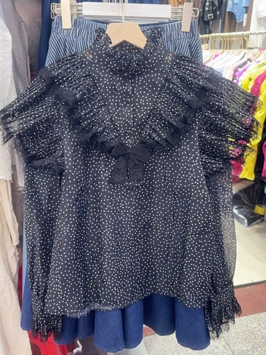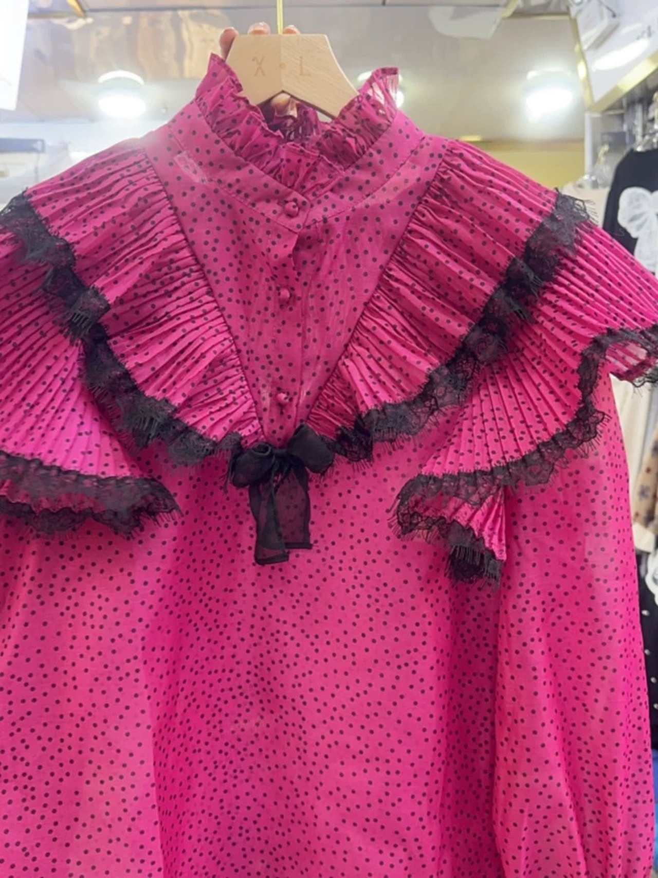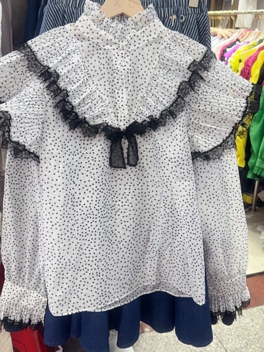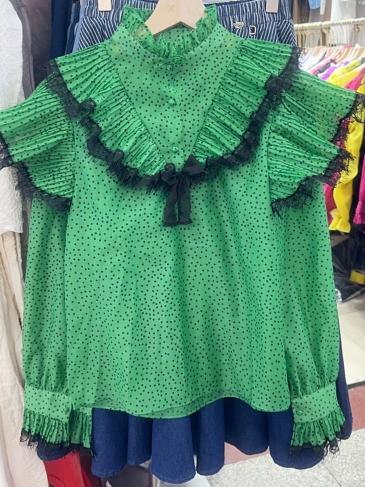 ブラウス 水玉 ドット 黒 緑 ピンク 白 トップス フリル リボン ガーリー
