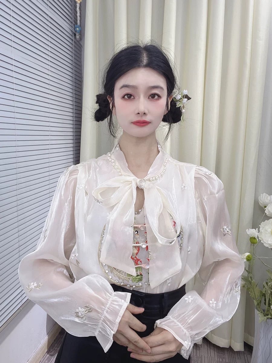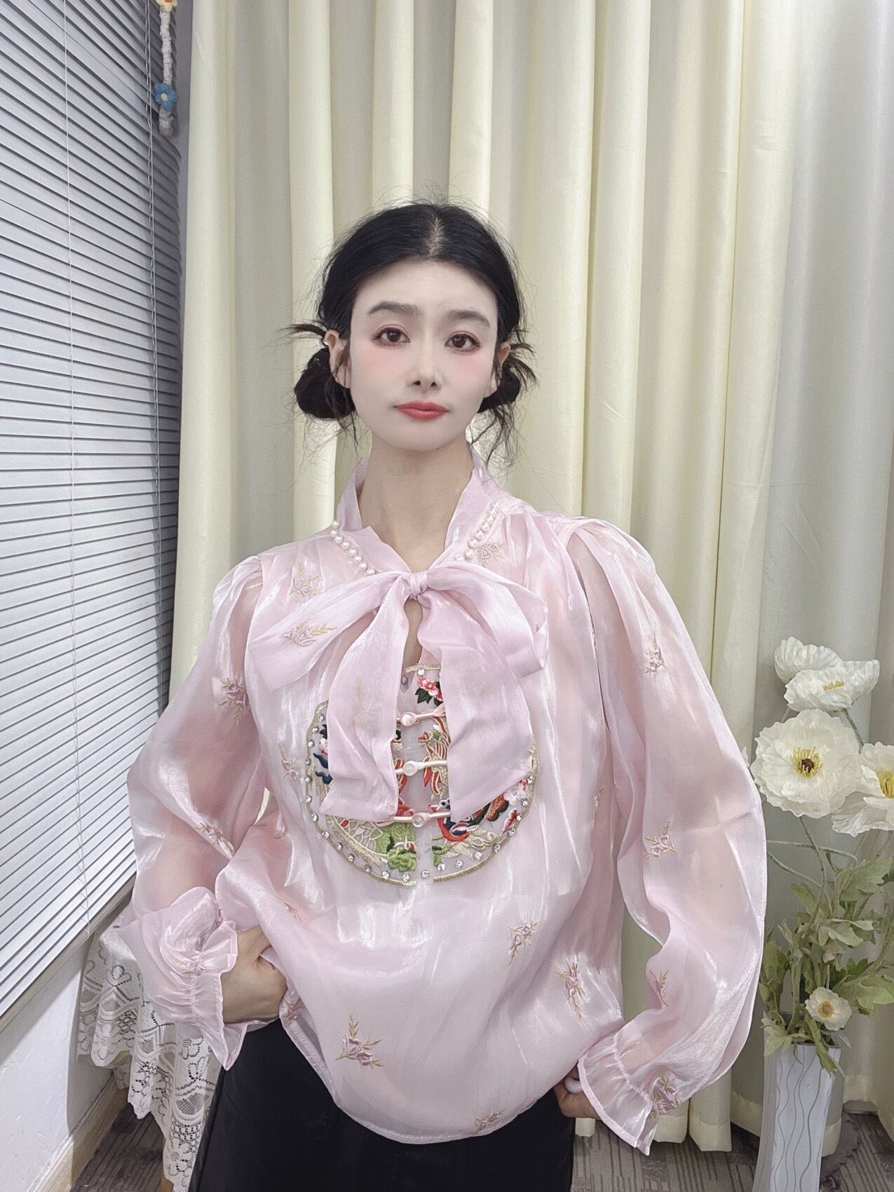 リボン 刺繍 花柄 フラワー 白 刺繍 花柄 黒 レース ブラウス ガーリー シャツ トップス エレガント お嬢様 カジュアル 花柄 ピンク 白 リボン フリル 可愛い シンプル トップス レース 紫 ピンク チャイナ服 コスプレ
