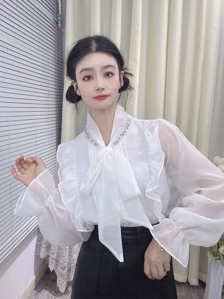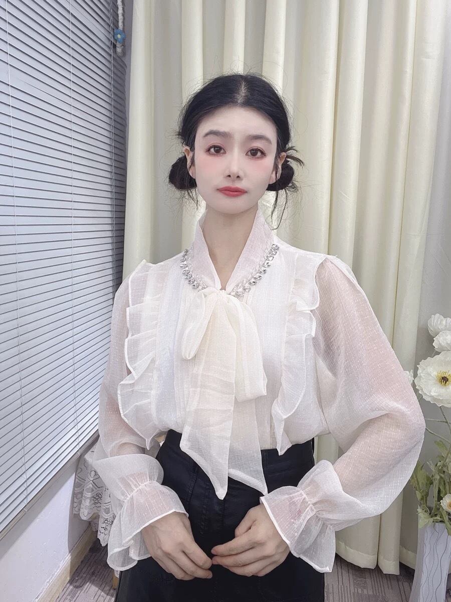 白 アイボリー フリル ラインストーン 白 刺繍 花柄 黒 レース ブラウス ガーリー シャツ トップス エレガント お嬢様 カジュアル 花柄 ピンク 白 リボン フリル 可愛い シンプル トップス レース 紫