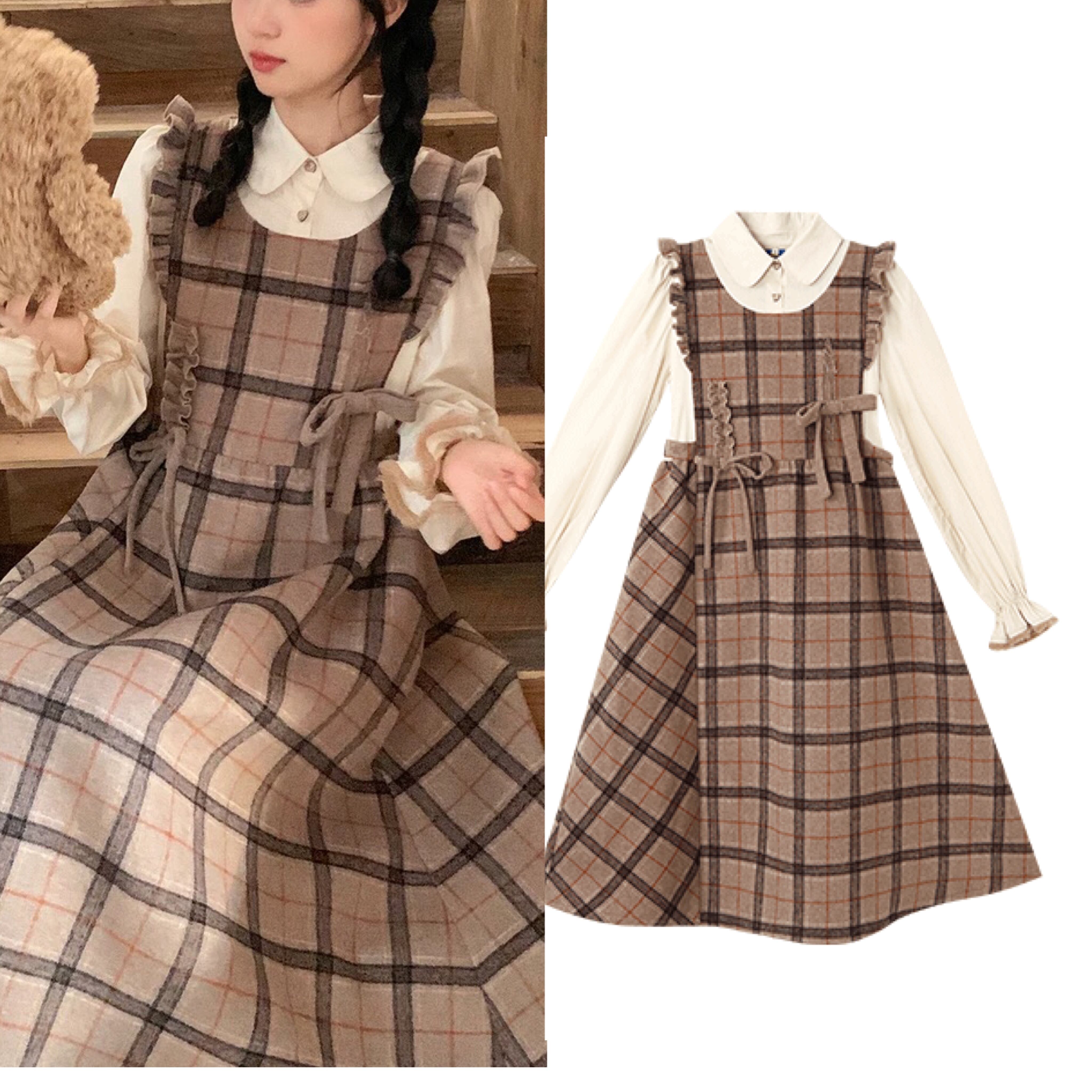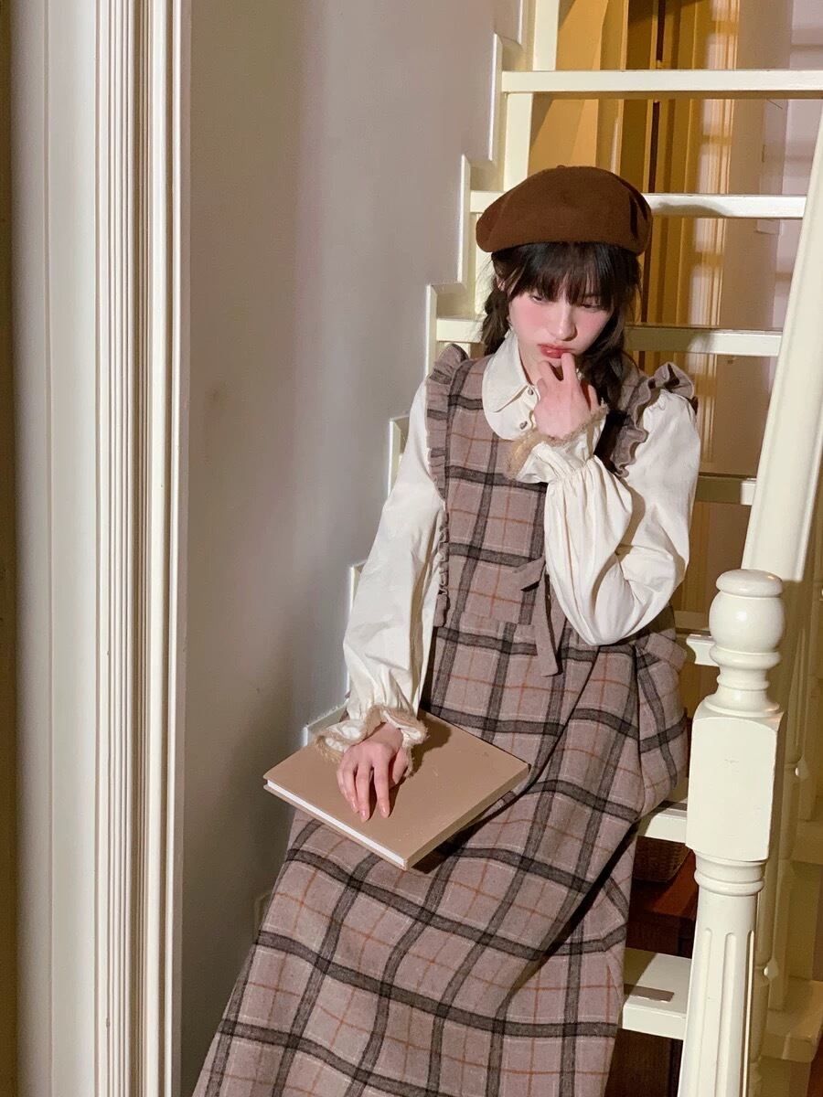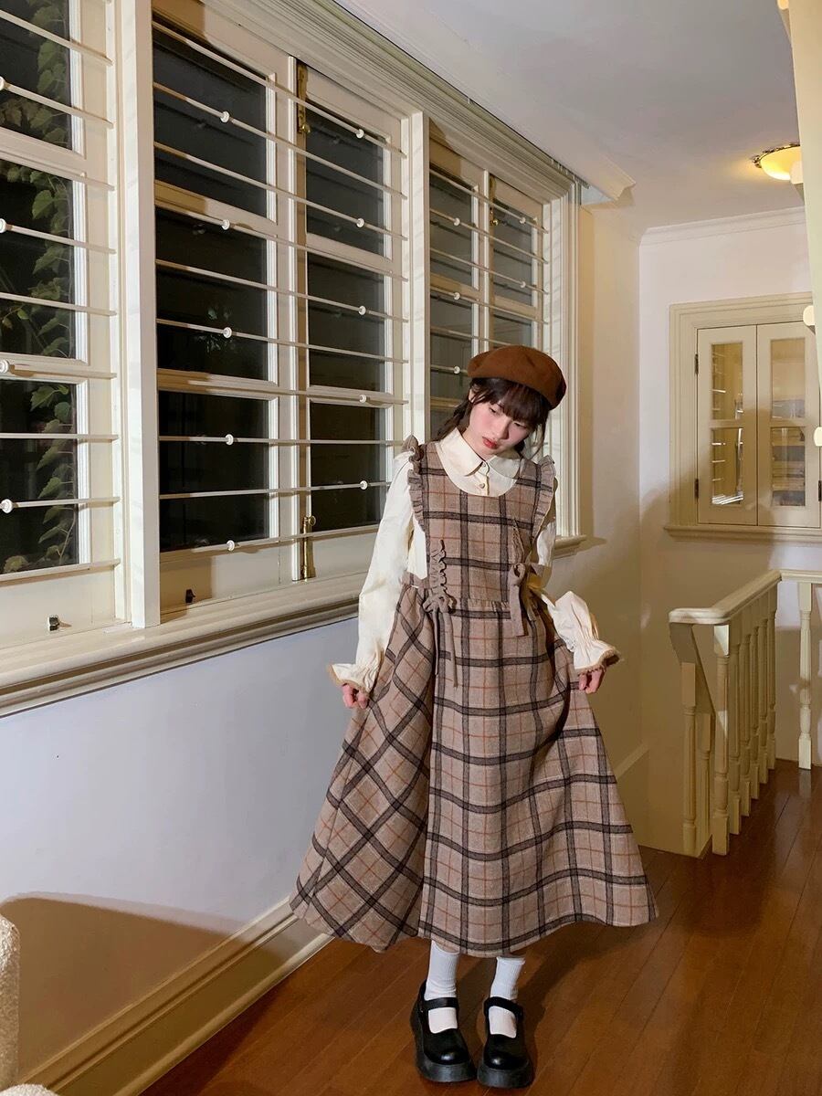 ブラウス チェック 茶色 ベージュ ワンピース ガーリー リボン 原宿 ゆったり