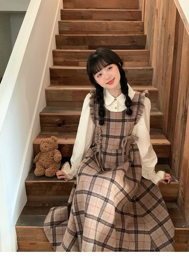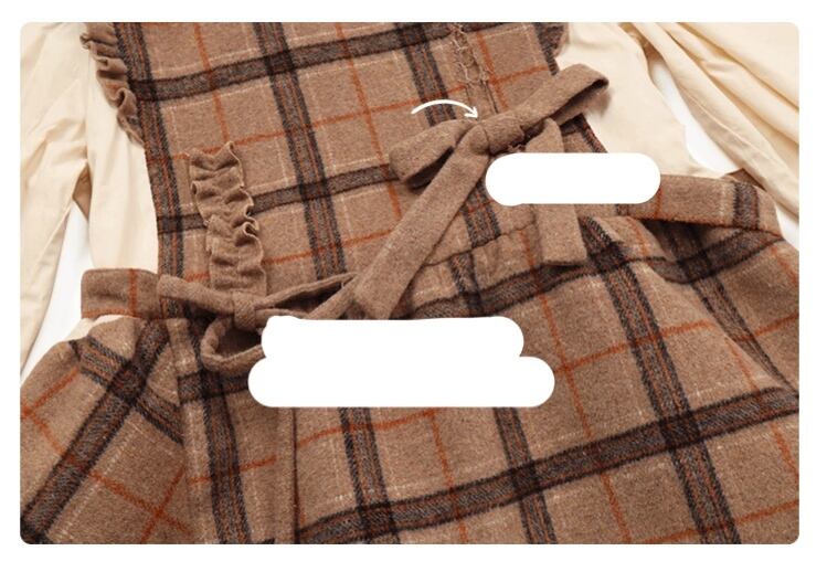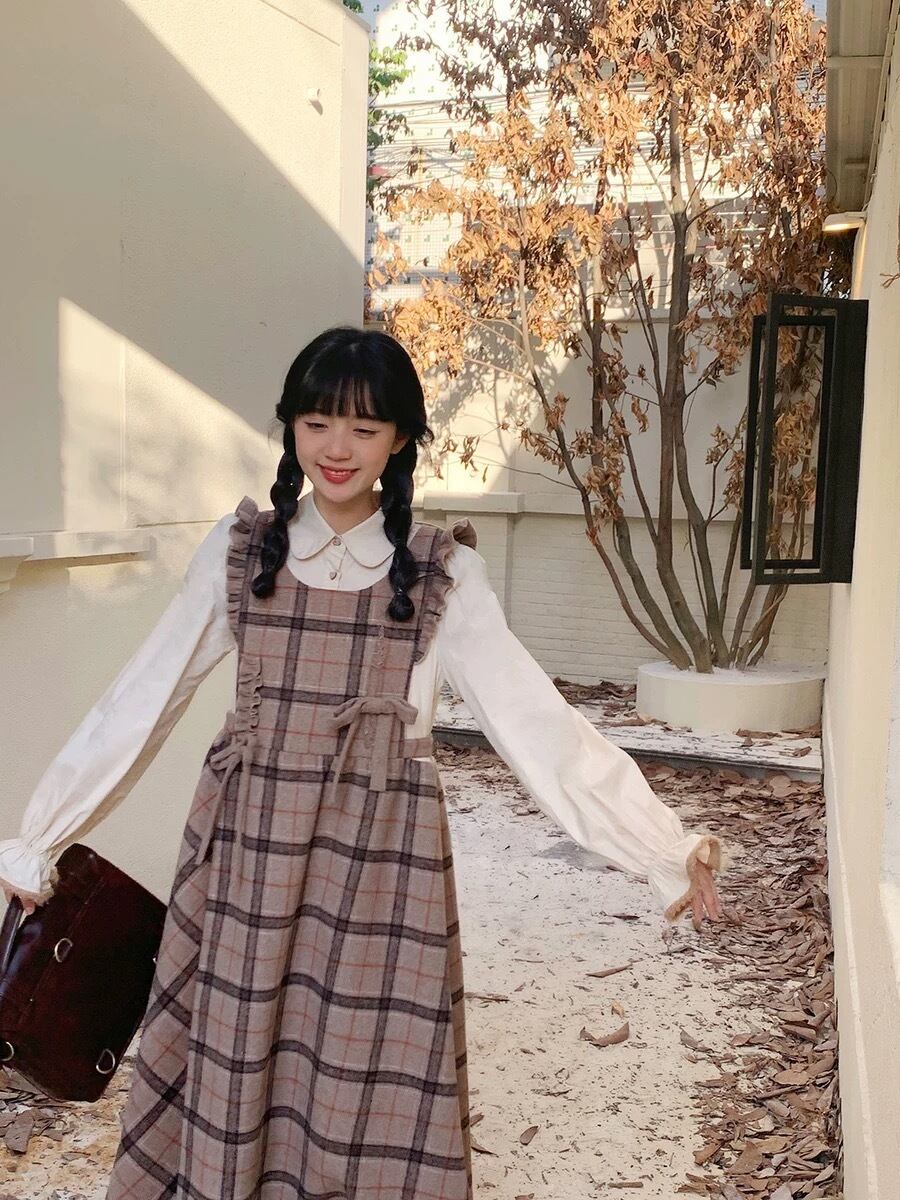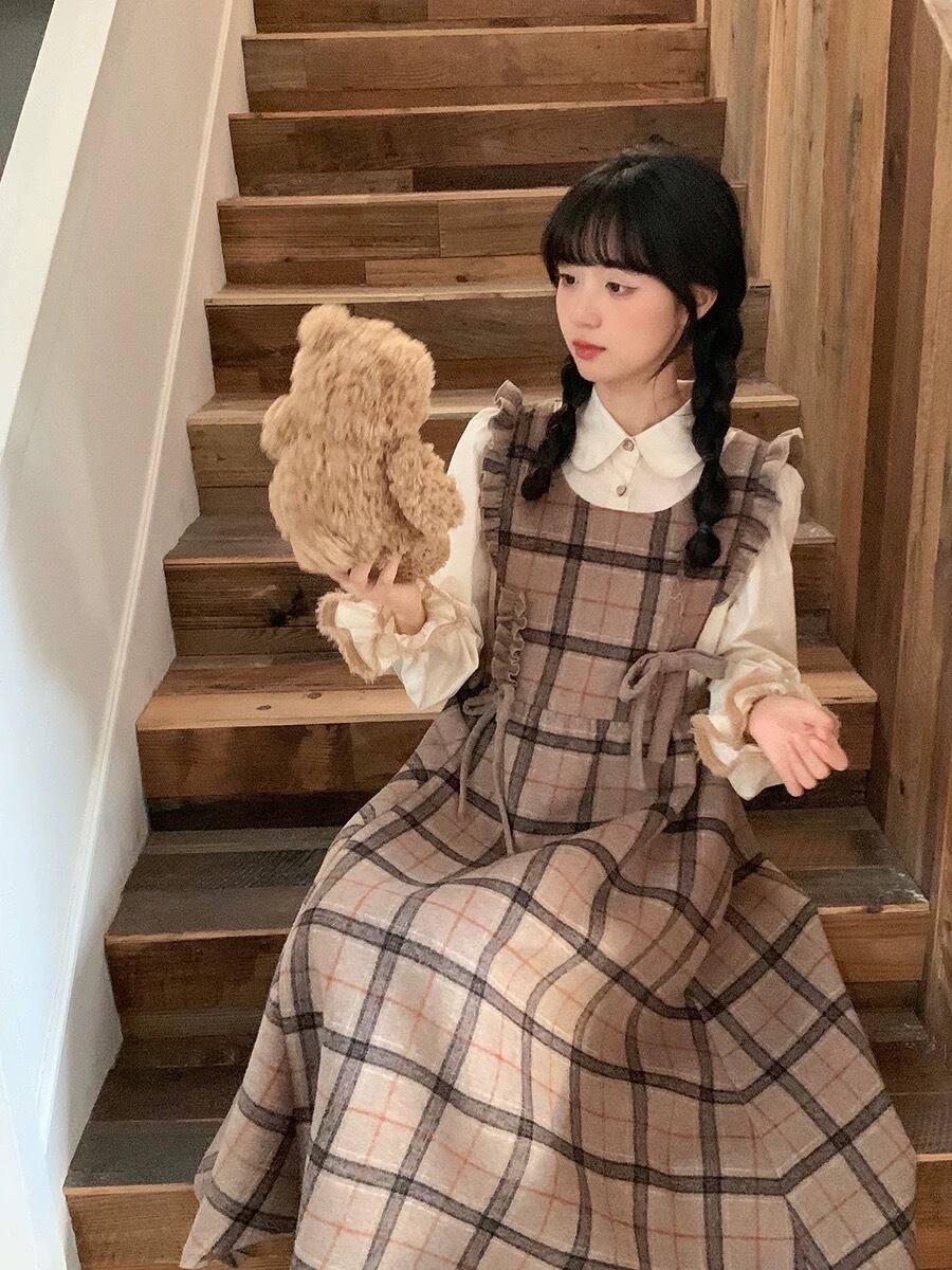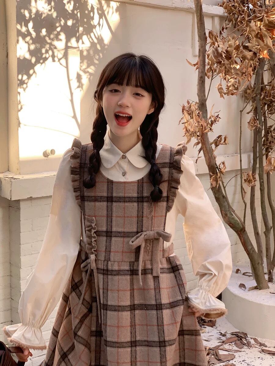 ブラウス チェック 茶色 ベージュ ワンピース ガーリー リボン 原宿 ゆったり