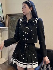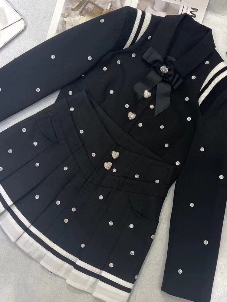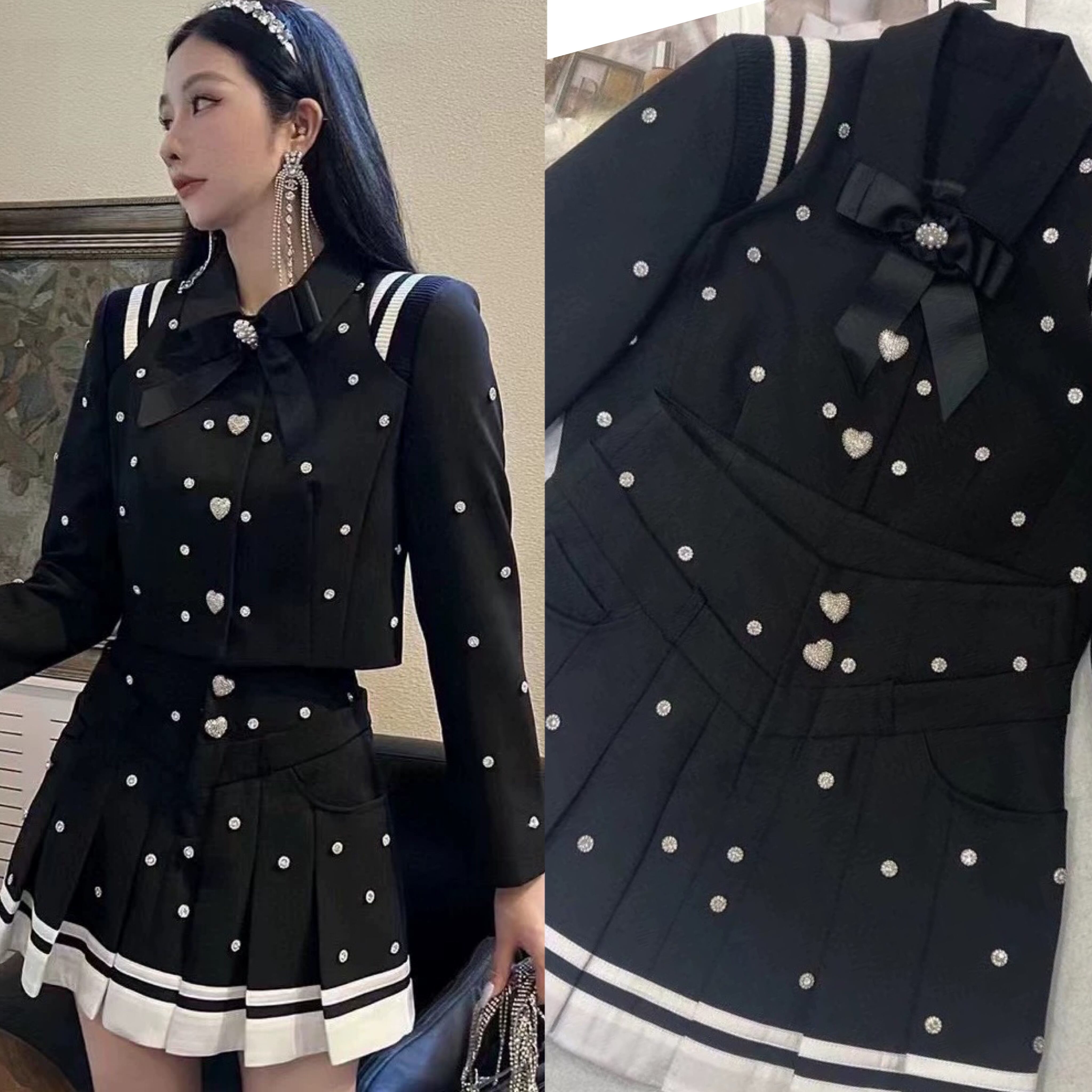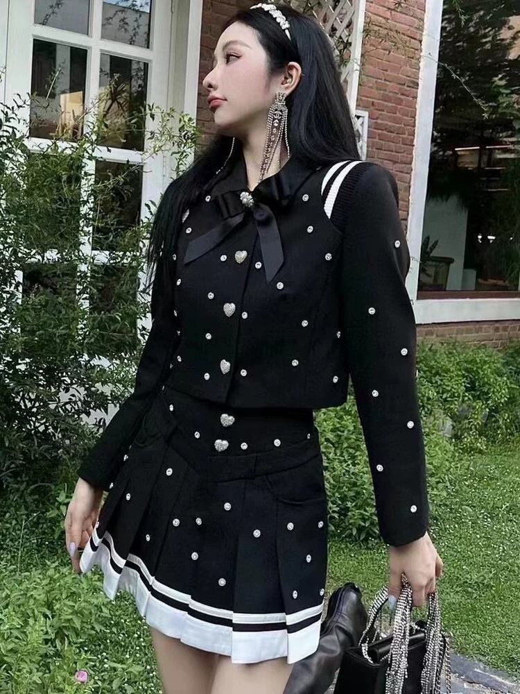【XLまで】【セットアップ】黒 ガーリー お嬢様 スーツ ツーピース セットアップ リボン ガーリー 原宿 渋谷 ミニスカート ジャケット カーディガン アウター ジャケット ブルゾン 水玉 ドット