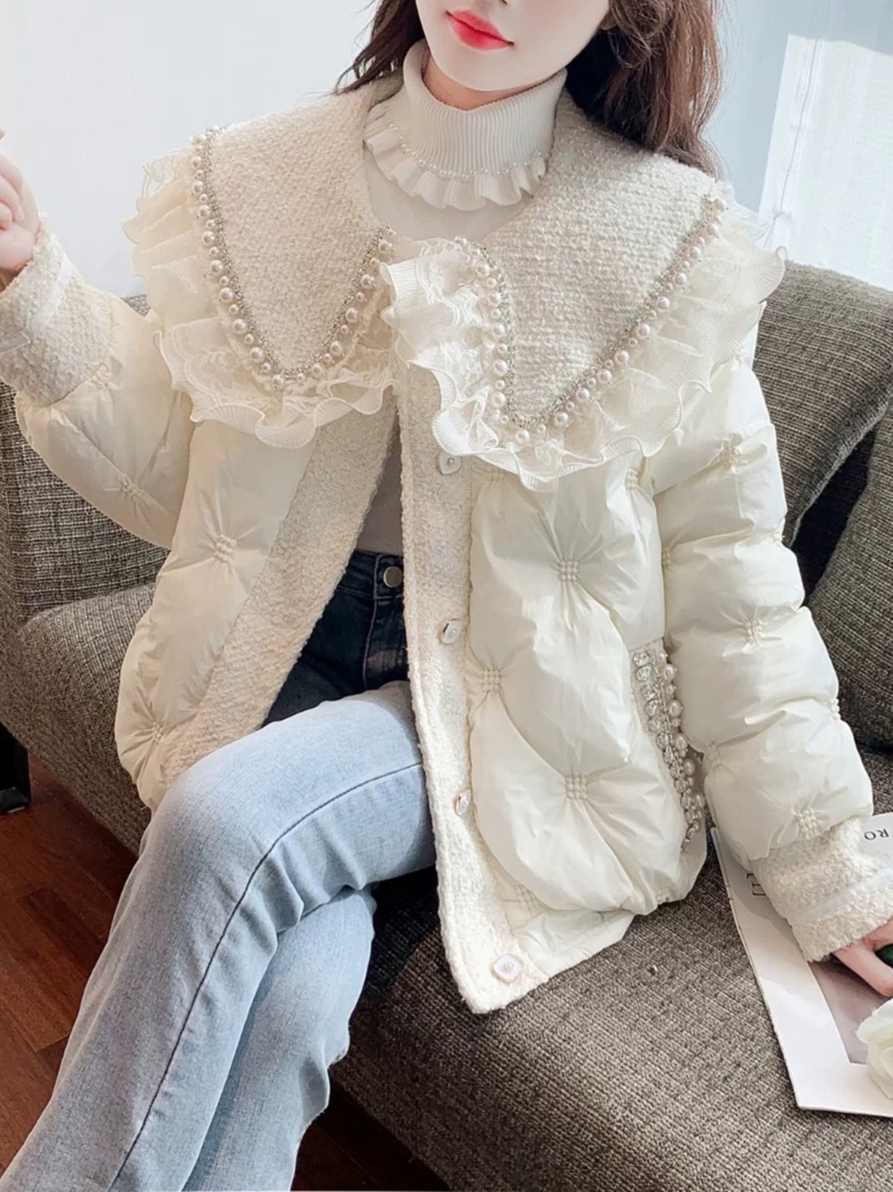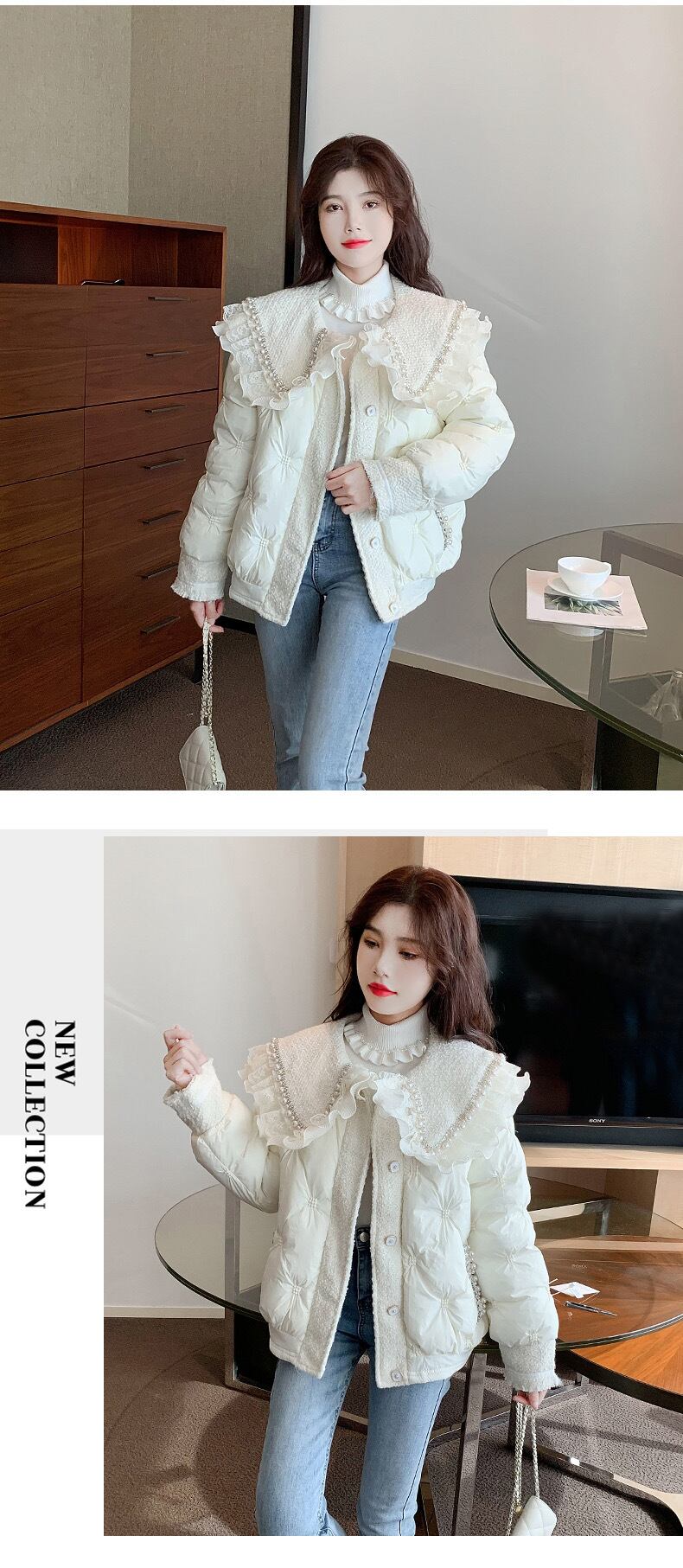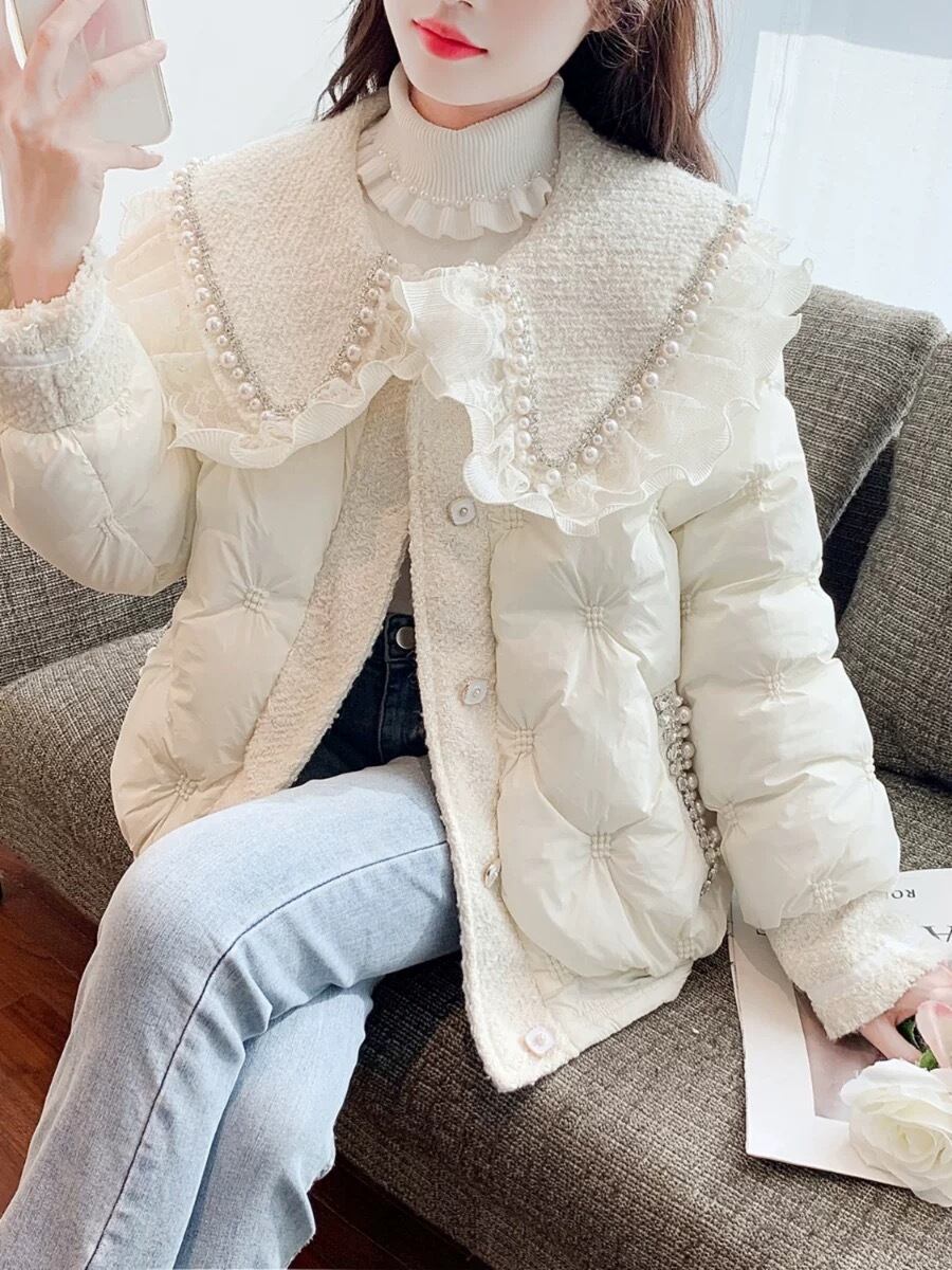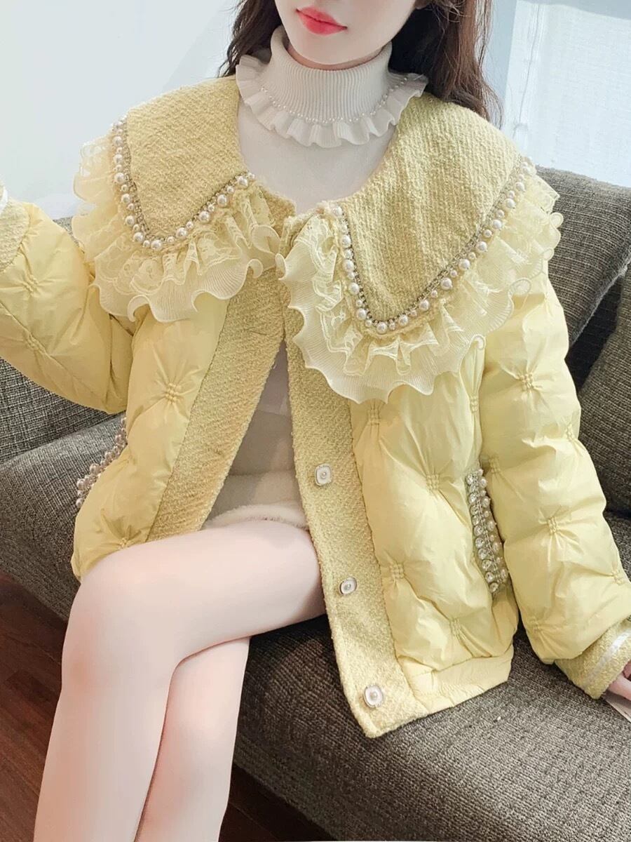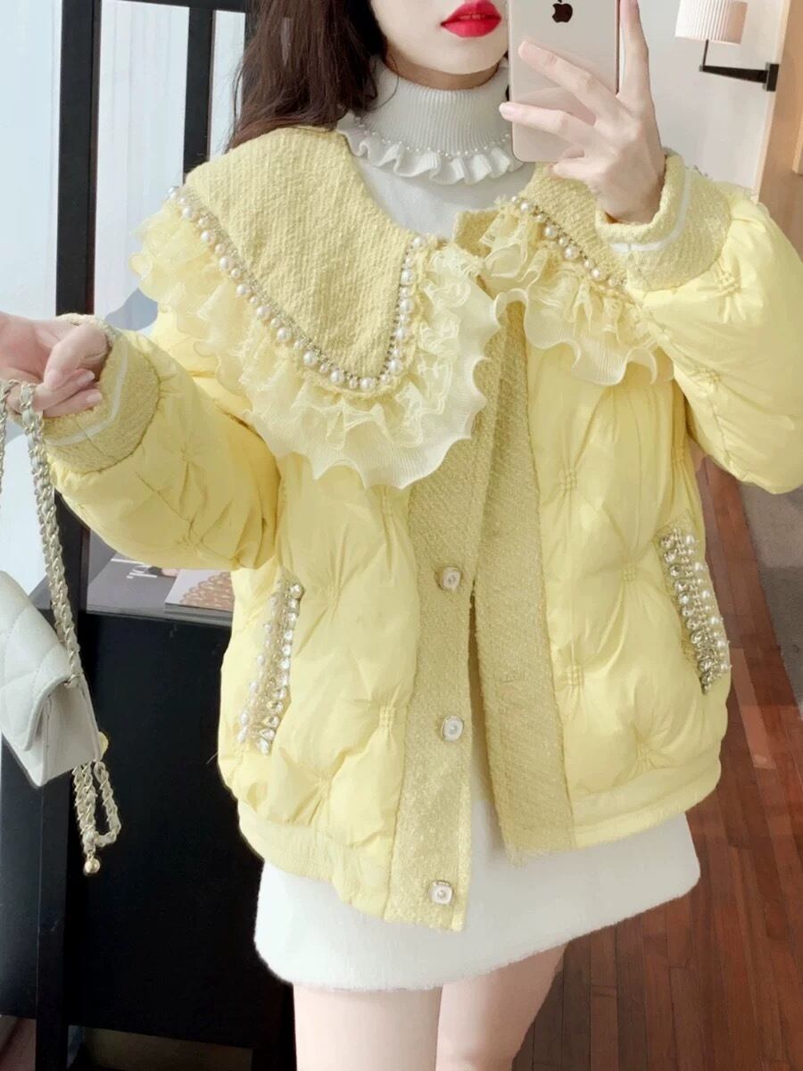 黄色 アウター カーディガン XL ジャケット コート 丸襟 黄色 白 パール ダウン ジャケット ガーリー