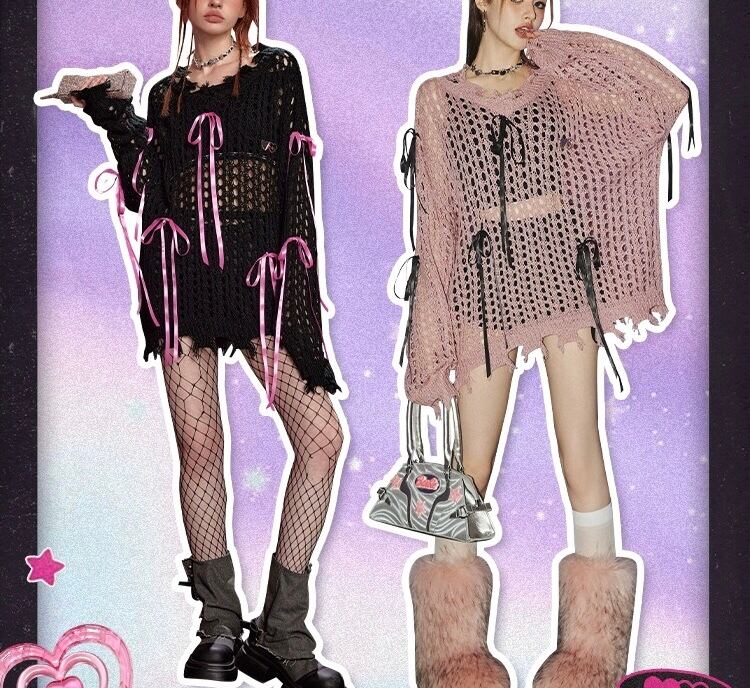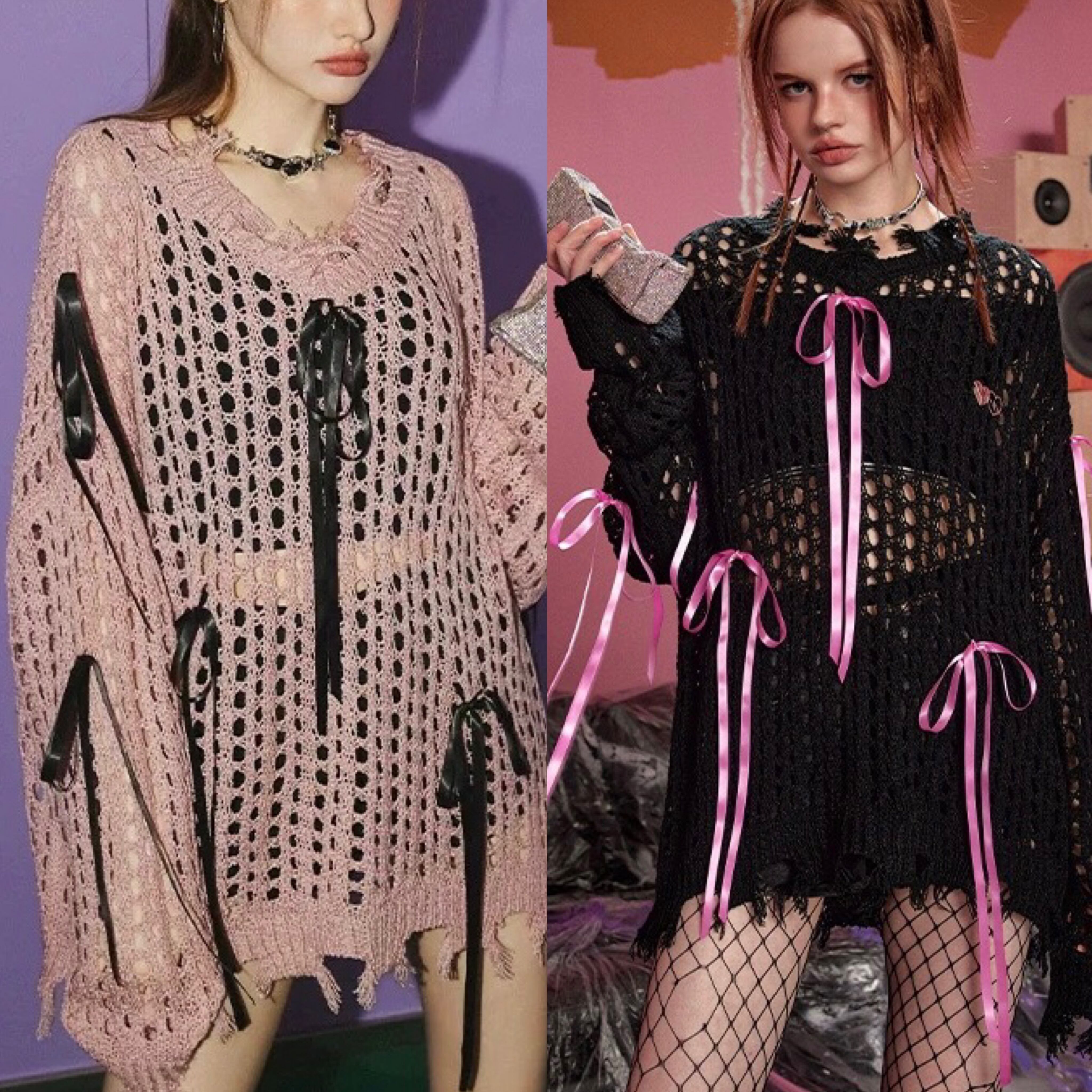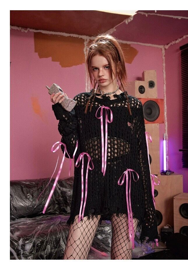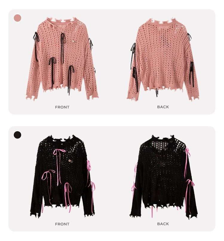 ニット 黒 ピンク リボン カジュアル メッシュ カーディガン セーター
