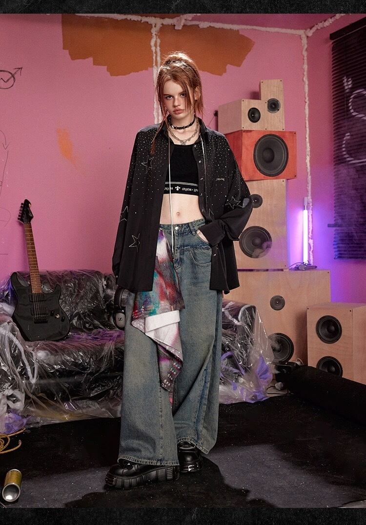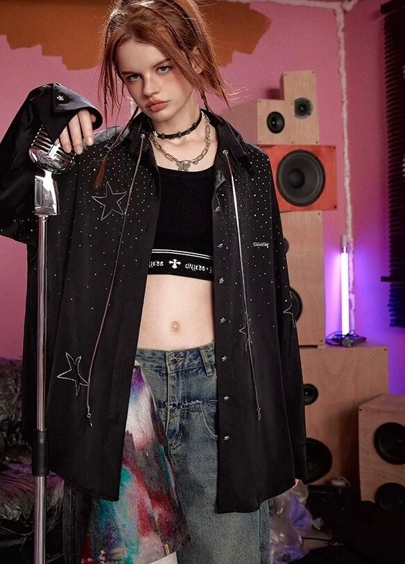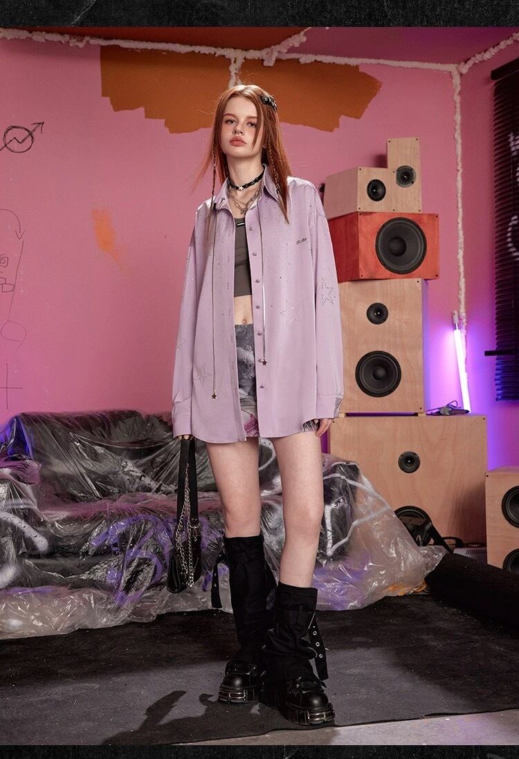 ラインストーン 紫 ピンク 黒 星 キラキラ ワンピース ブラウス ガーリー ゆったり ストリート