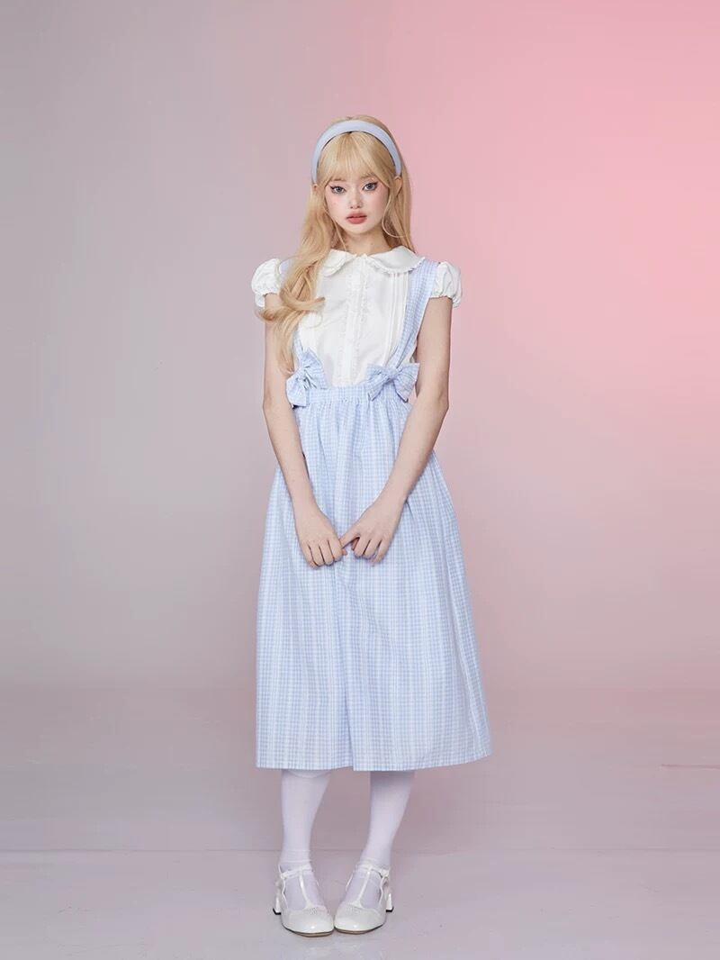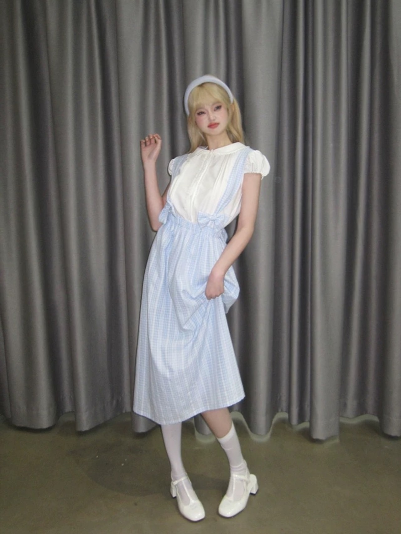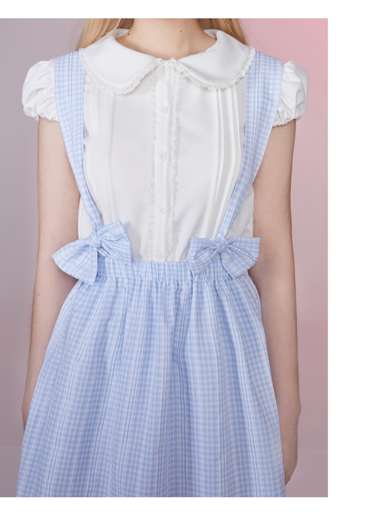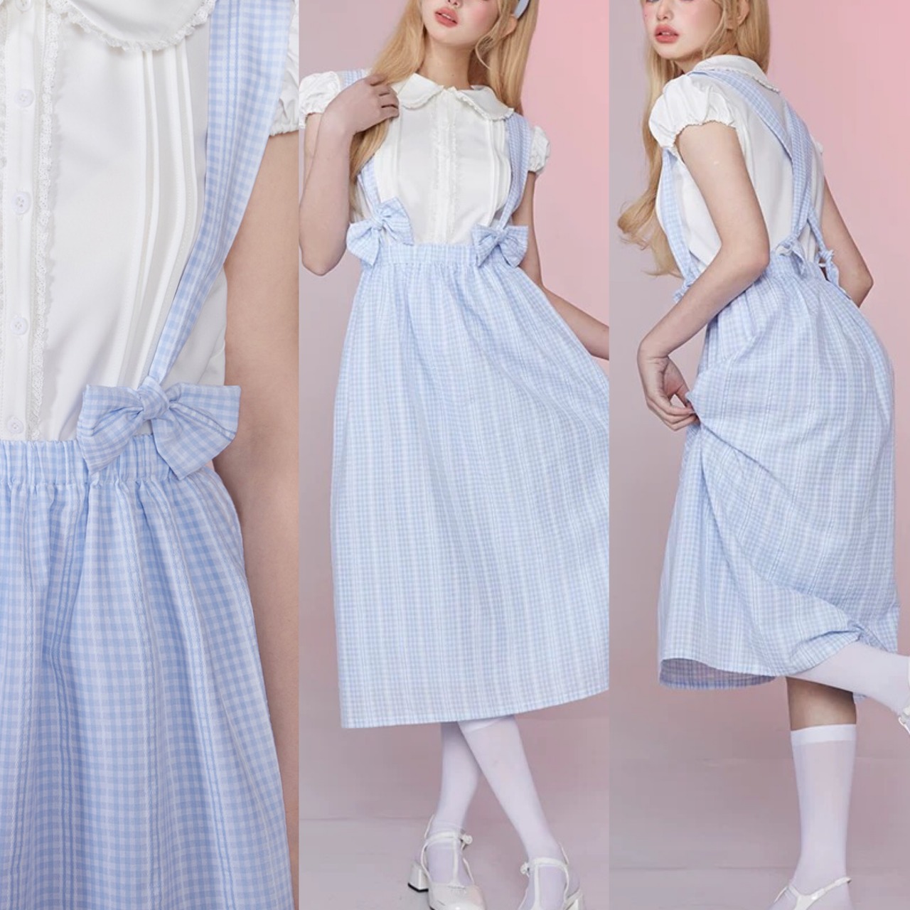 水色 チェック ワンピース リボン ジャンパースカート ボトムス