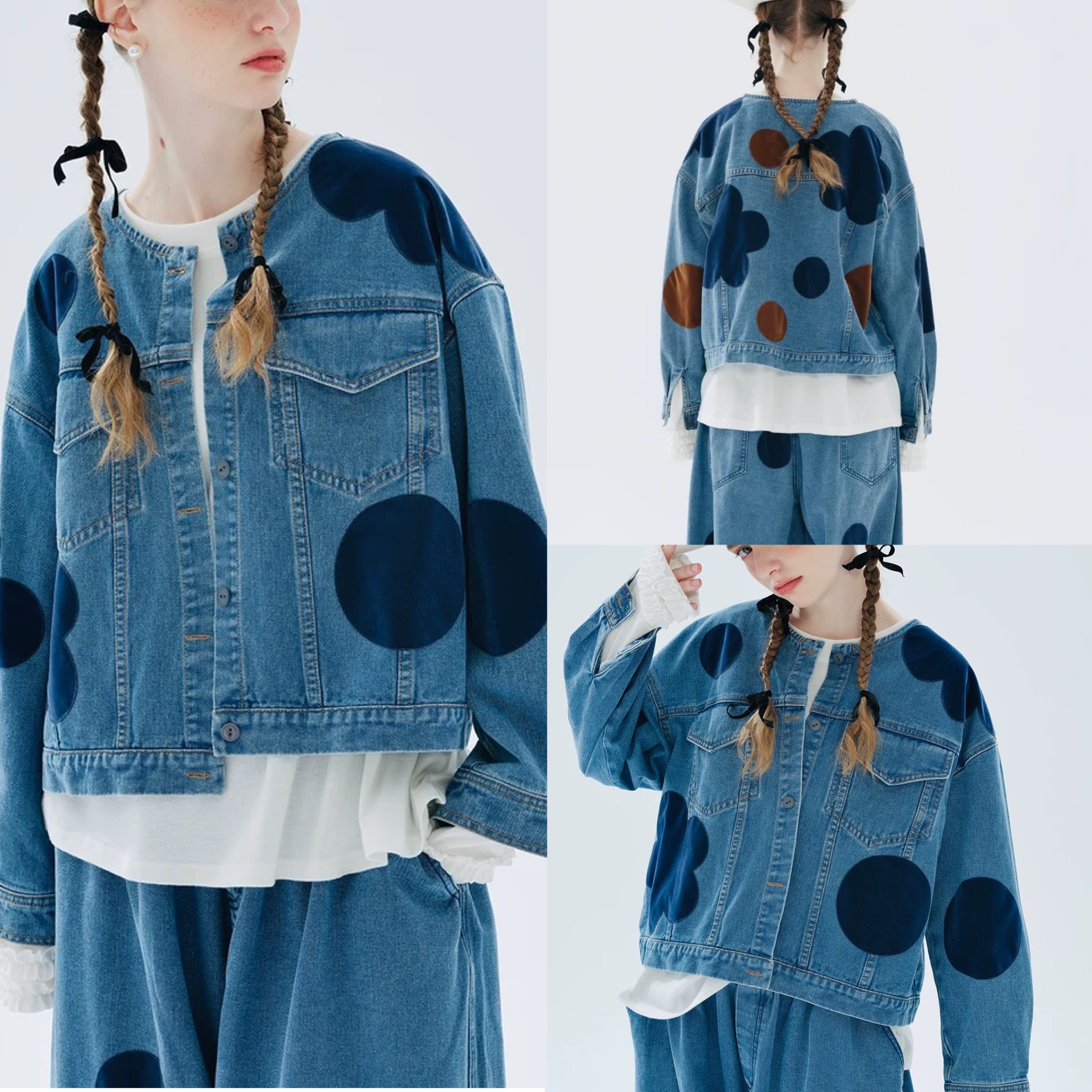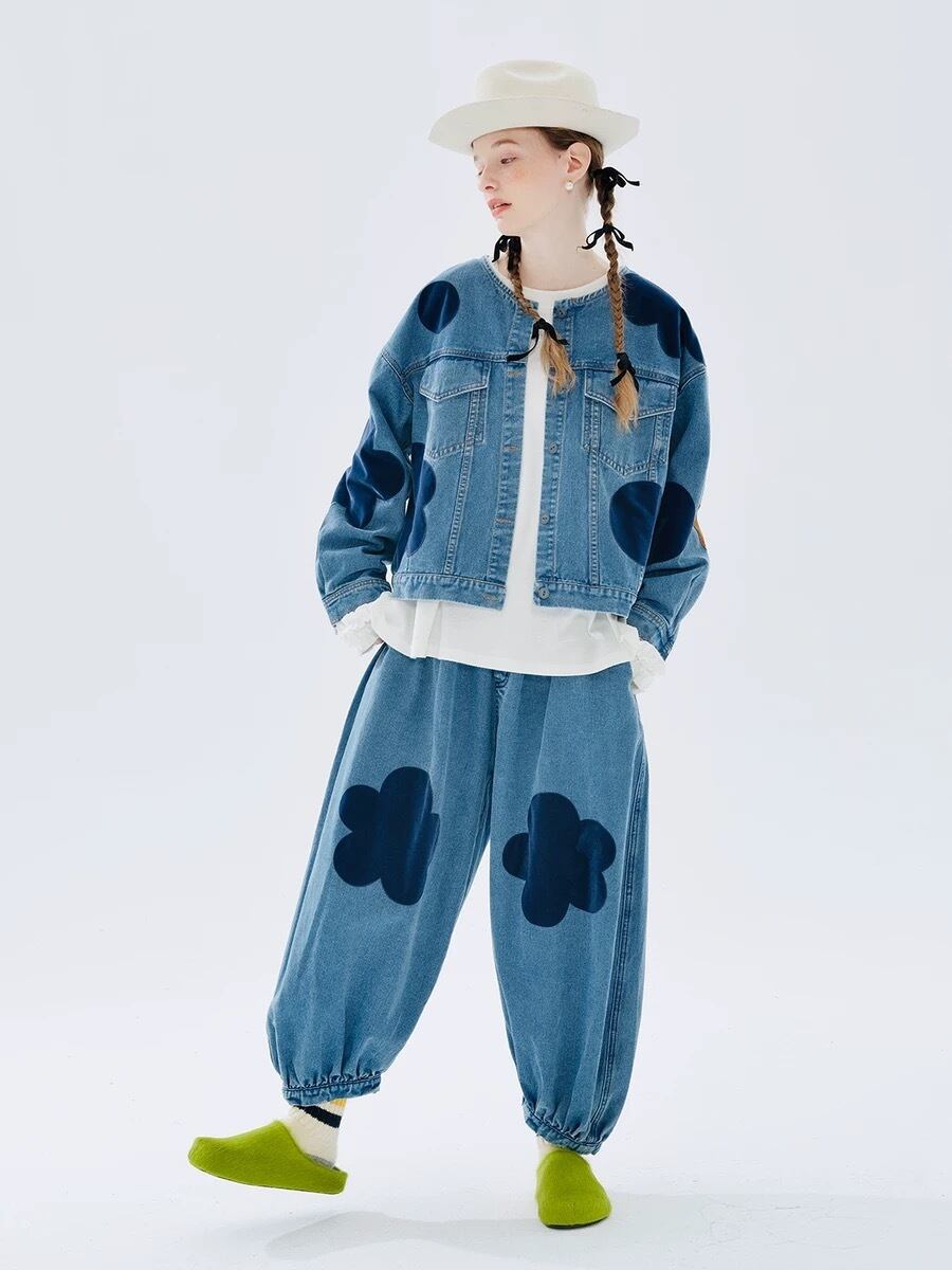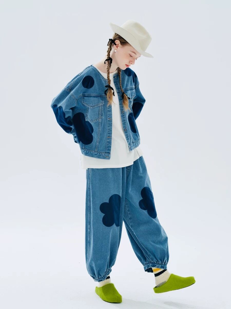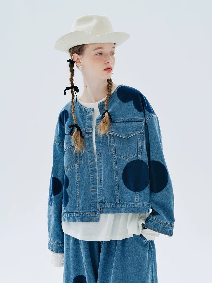 ジージャン デニム ジャケット カジュアル カーディガン アウター コート 水玉 水色 スウェット ストリート ドット フラワー
