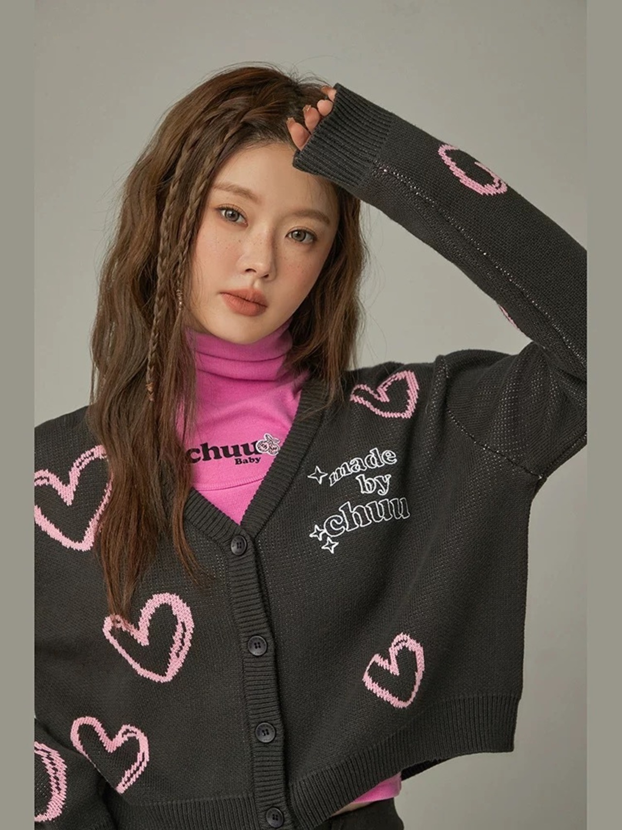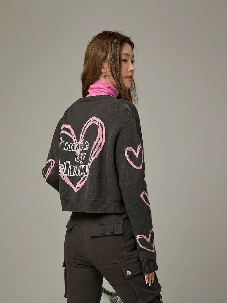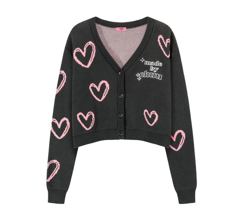 ハート カーディガン グレー 落書き ピンク カジュアル セーター に