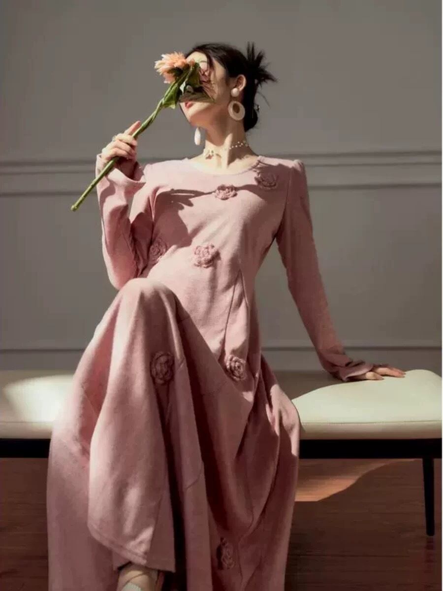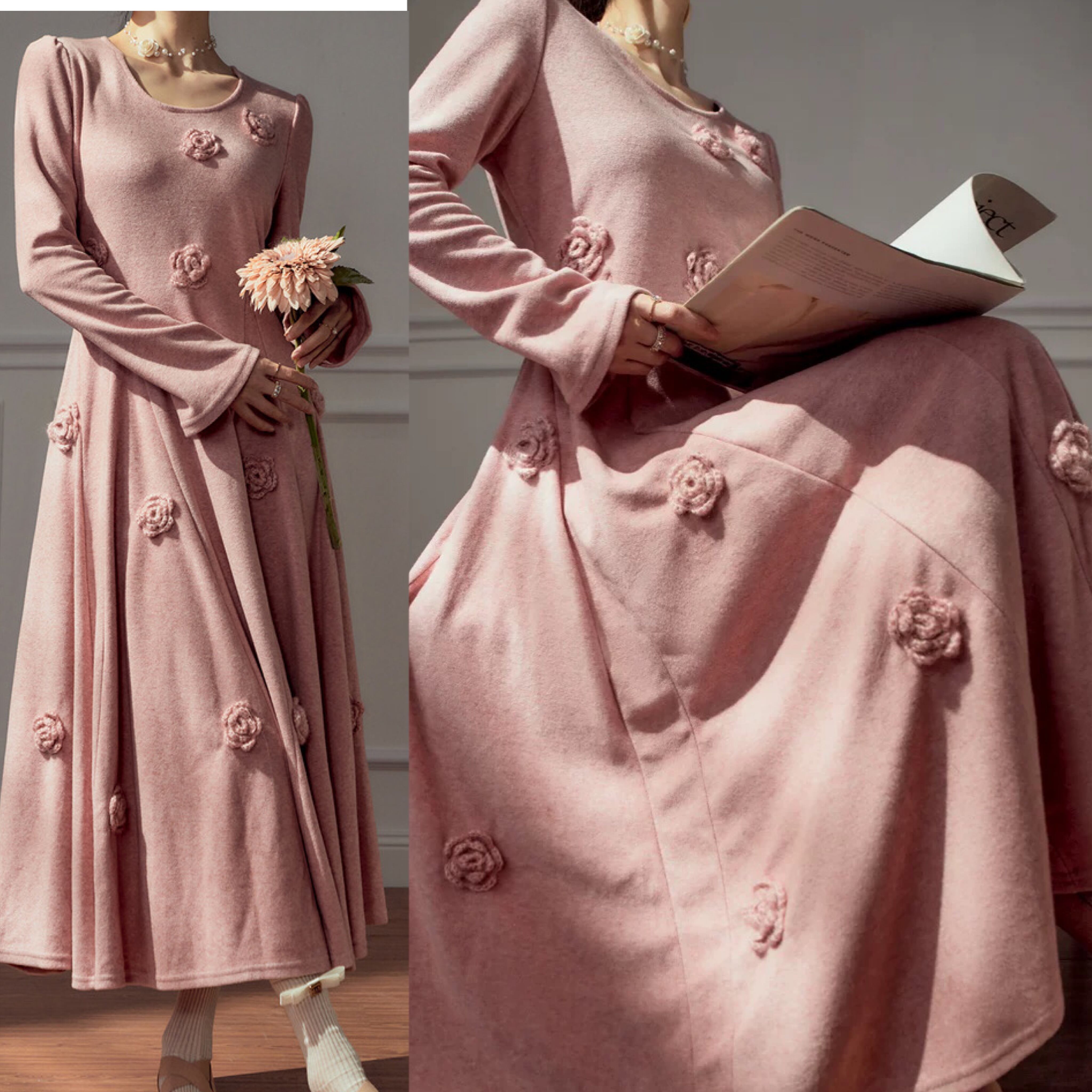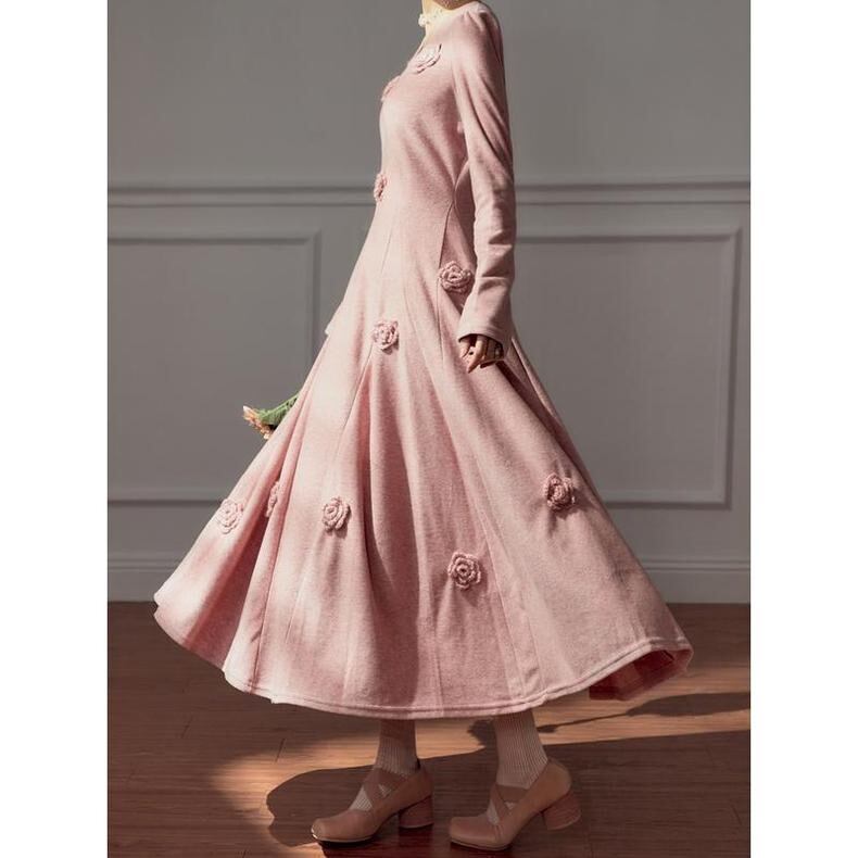 ワンピース ピンク マキシ カメリア デコレーション 薔薇 フラワー