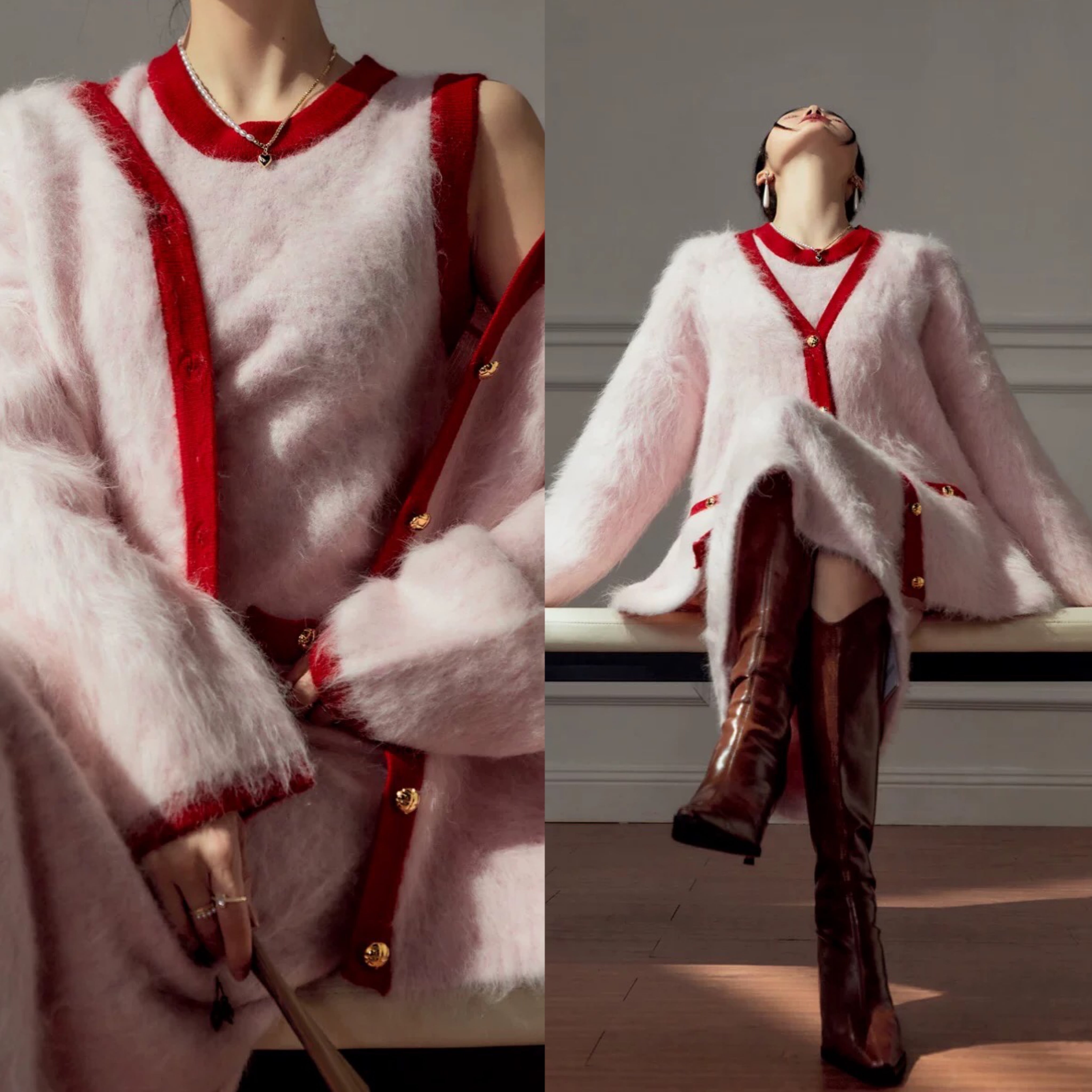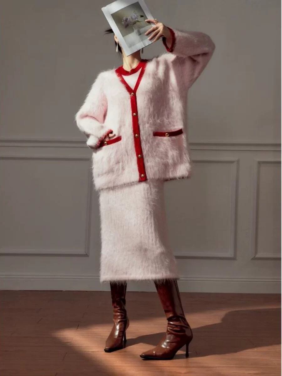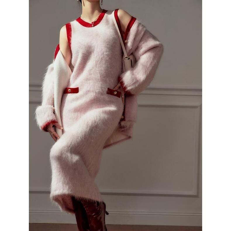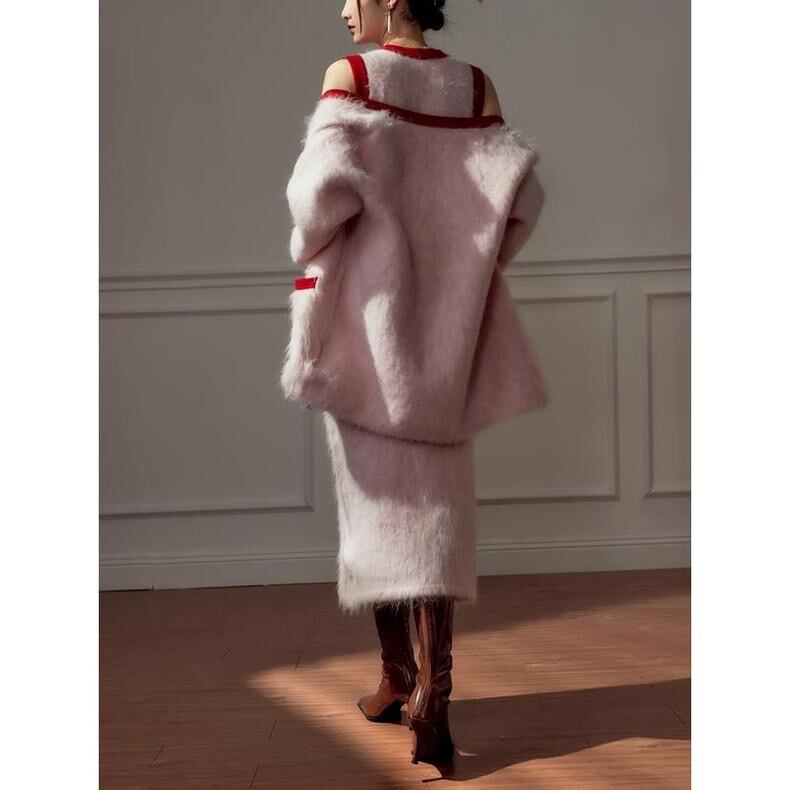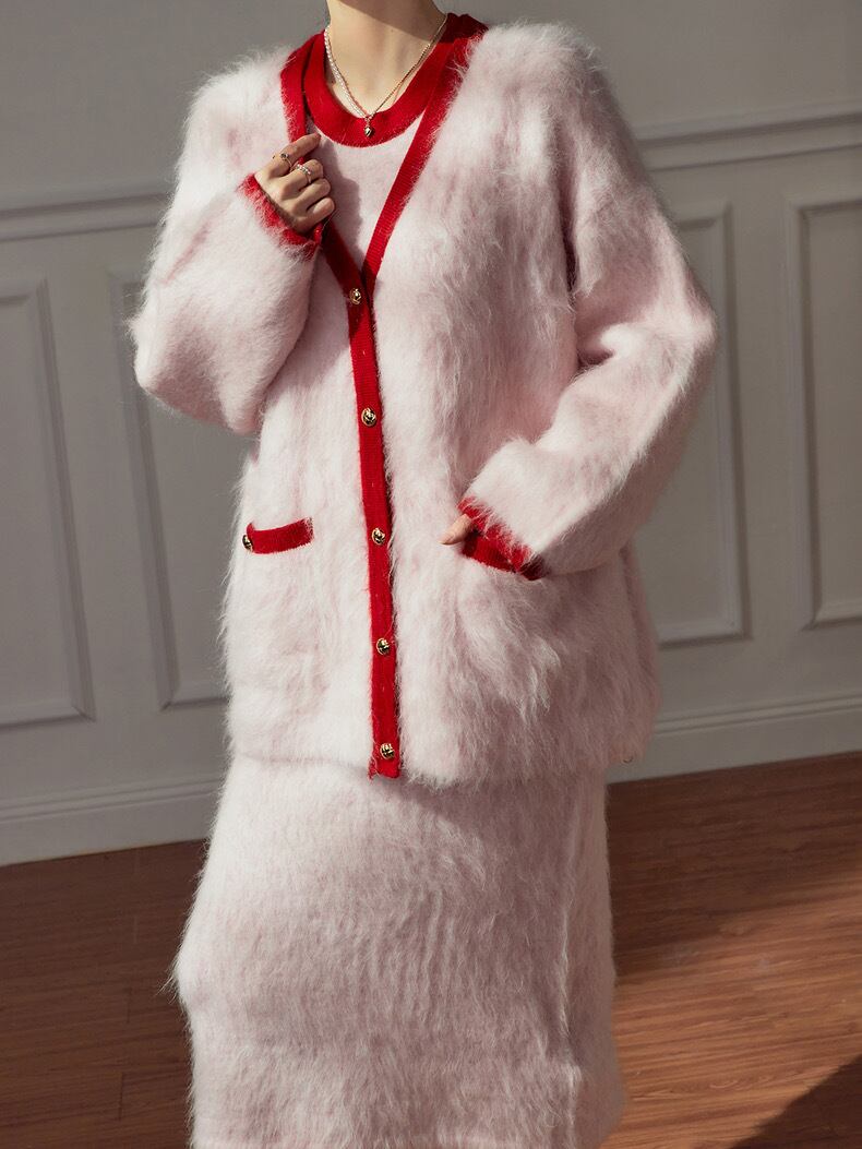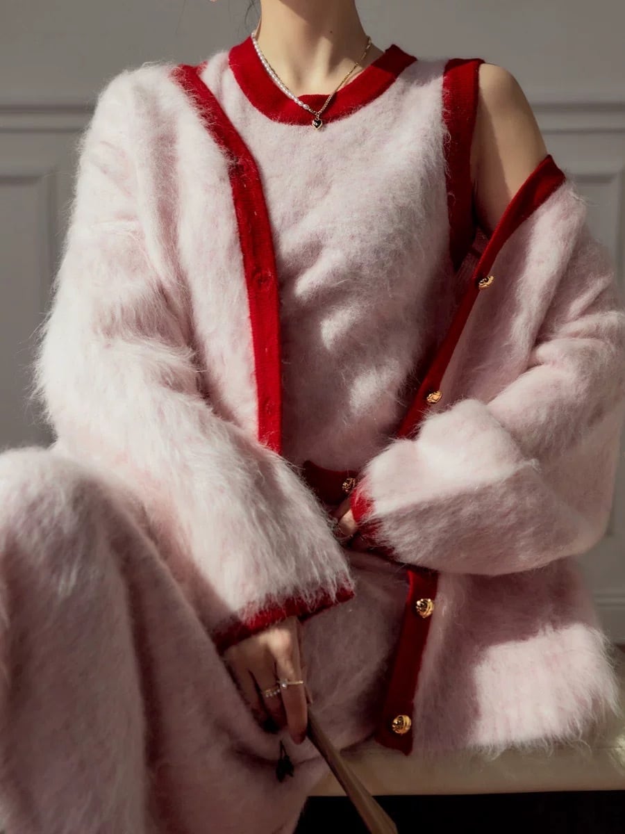 【カーディガン】赤 ピンク ロング アウター セーター モヘア ゆったり