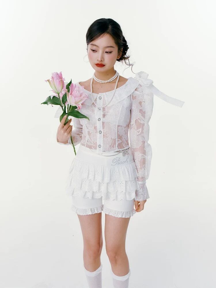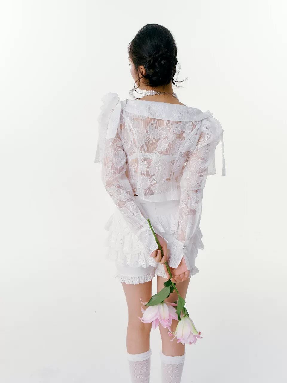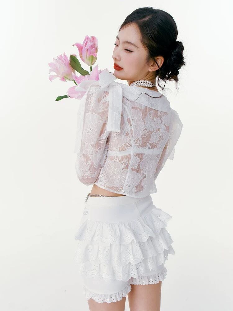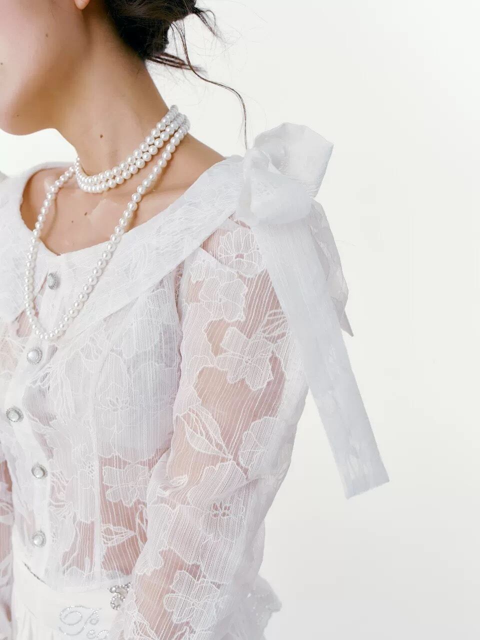 ブラウス 白 ホワイト リボン トップス 花柄 フラワー