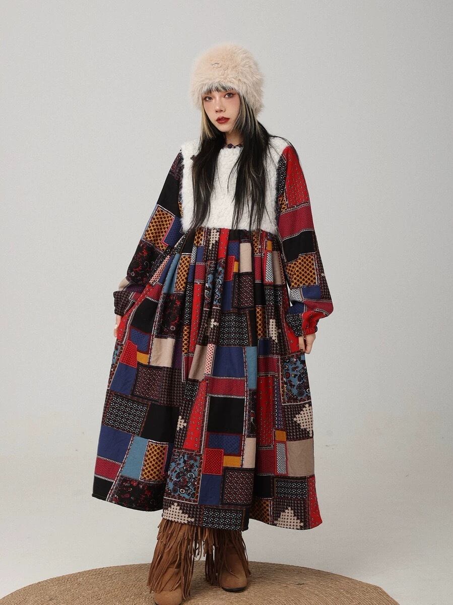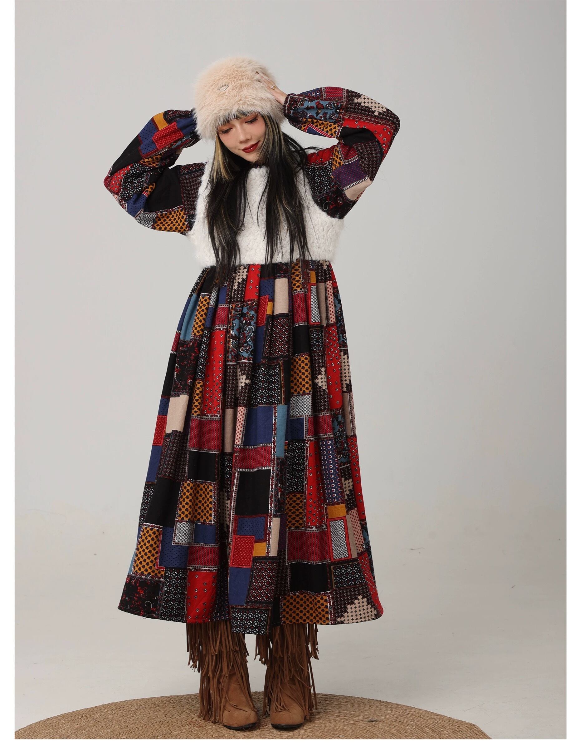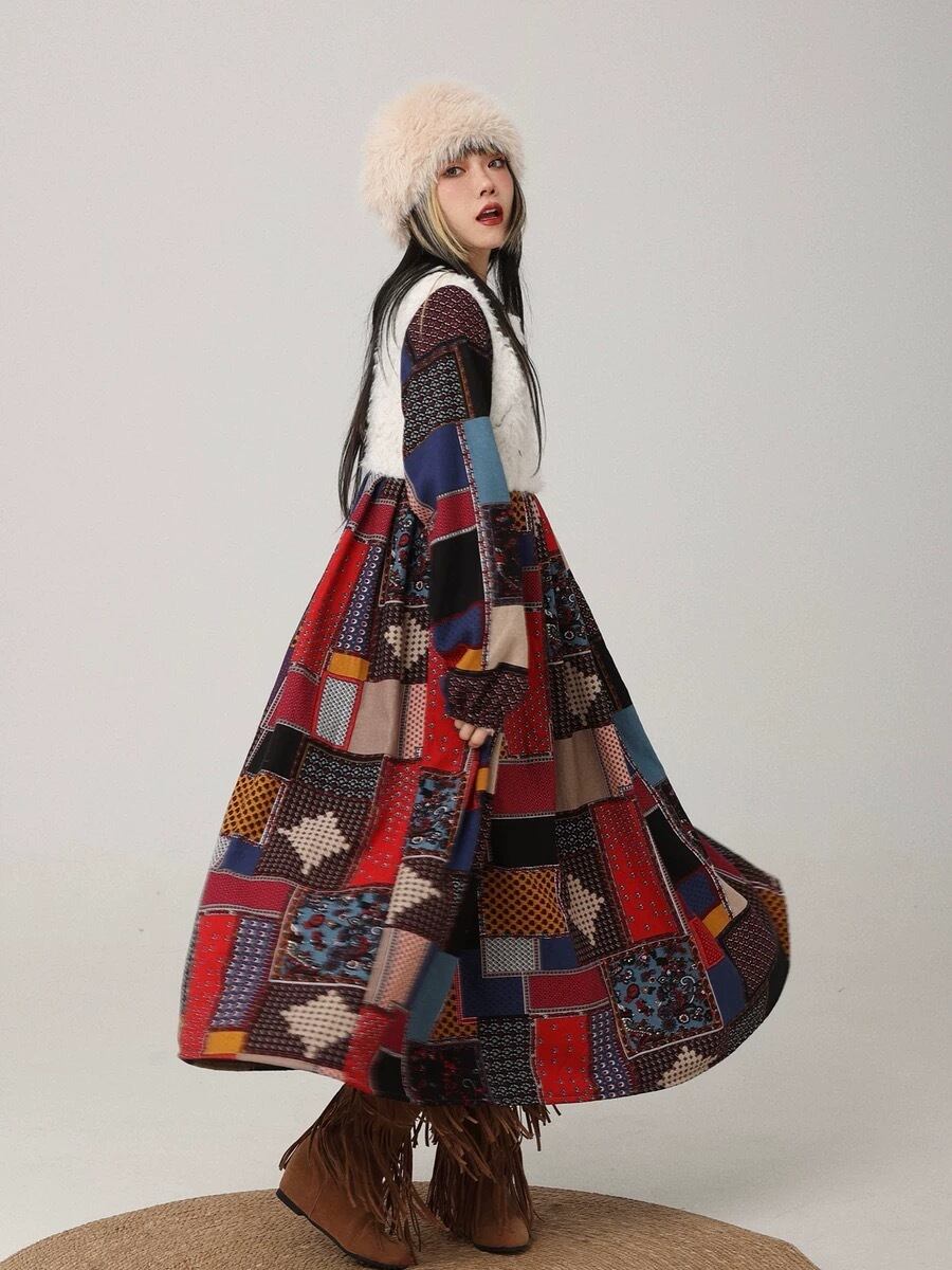 パッチワーク カラフル チェック ワンピース ゆったり XL ファー ベスト マキシ スカート ブラウス 原宿 古着