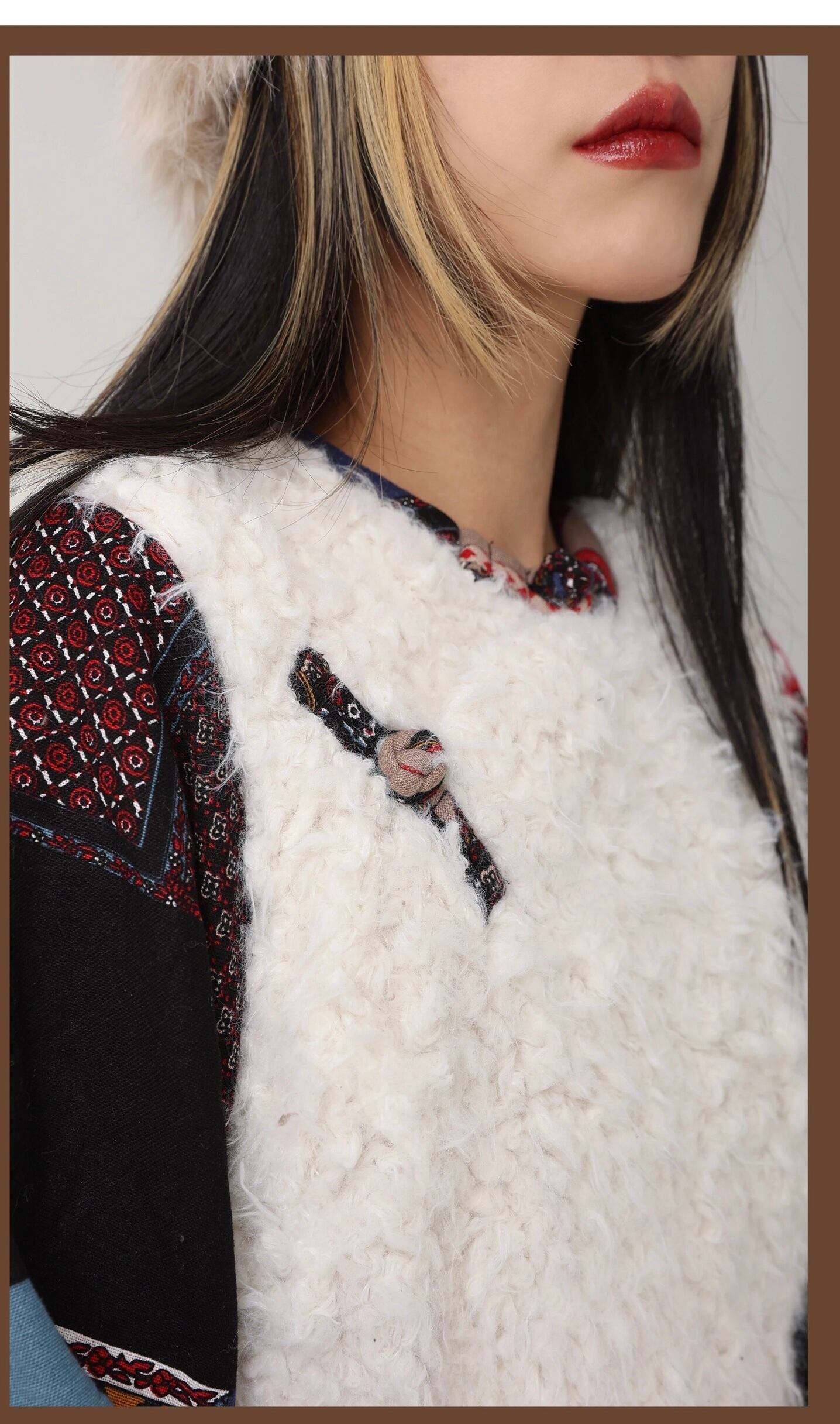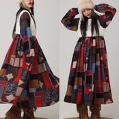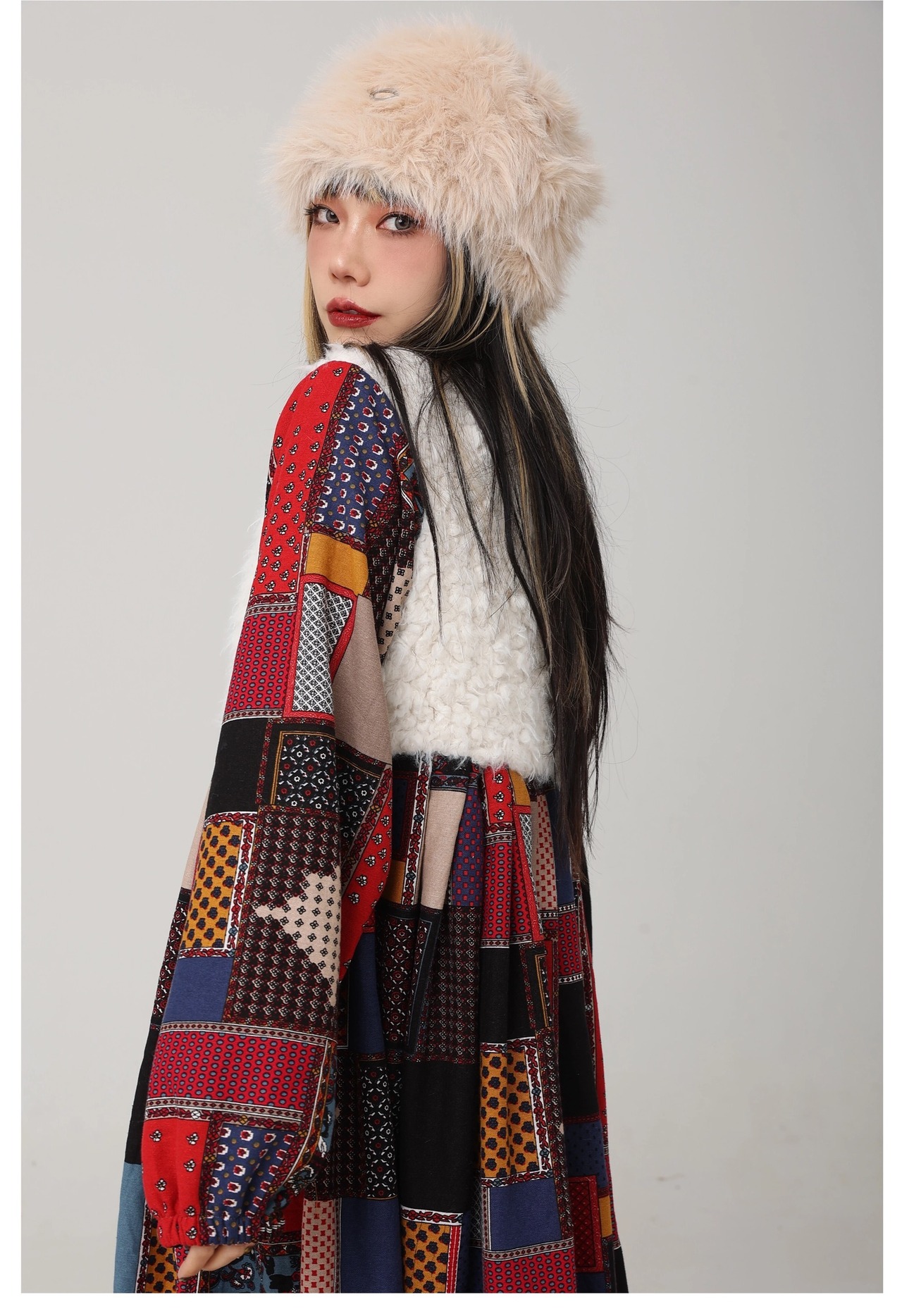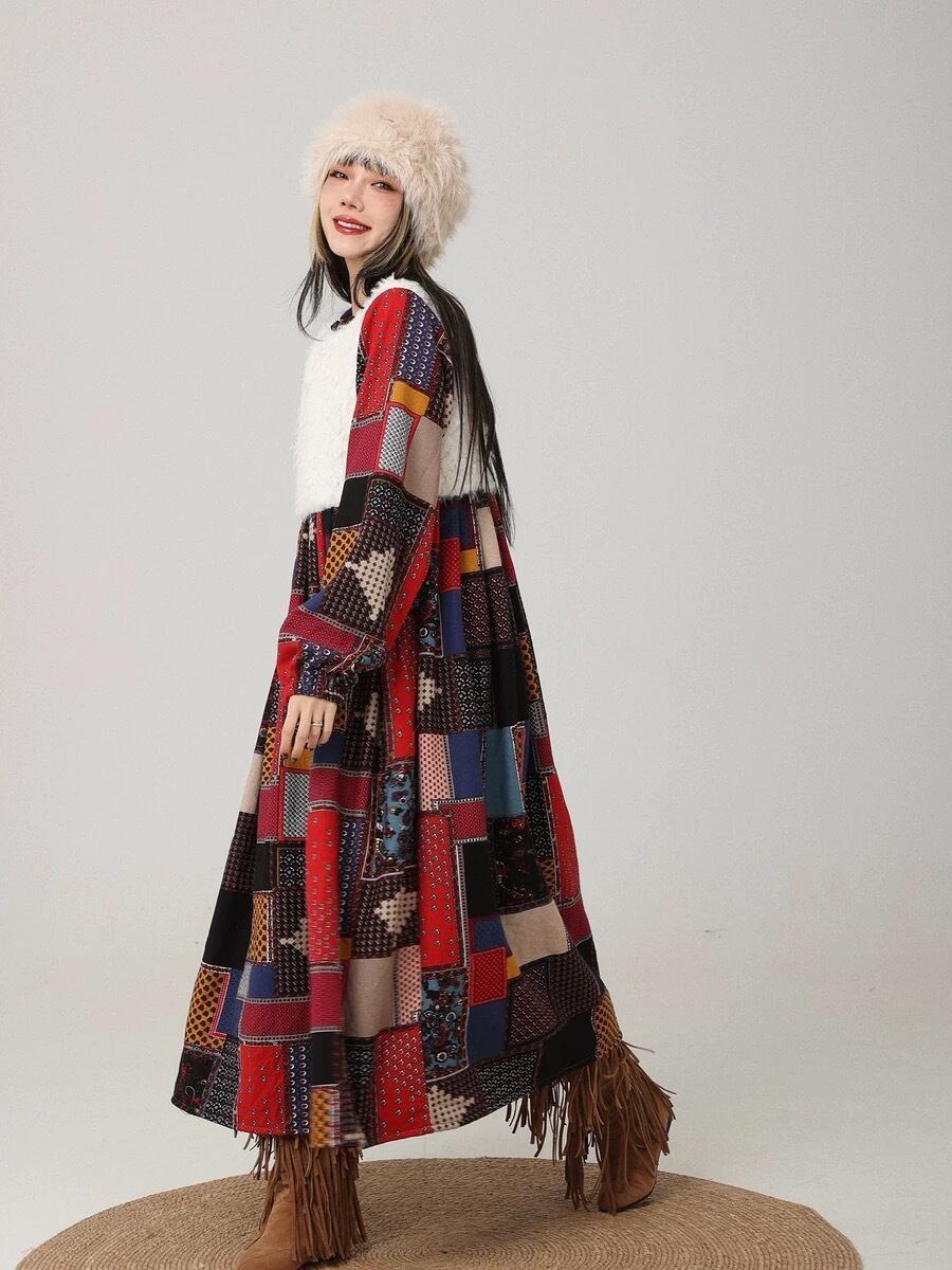 パッチワーク カラフル チェック ワンピース ゆったり XL ファー ベスト マキシ スカート ブラウス 原宿 古着