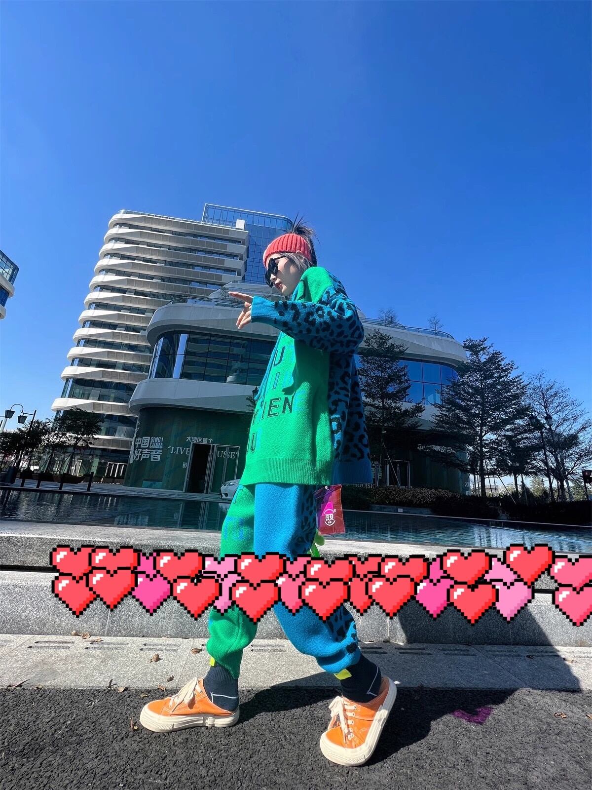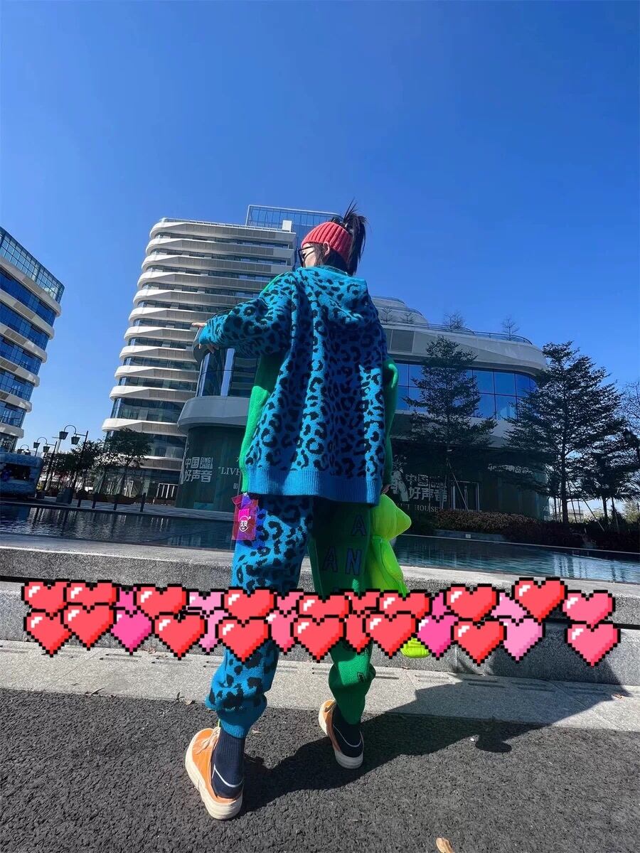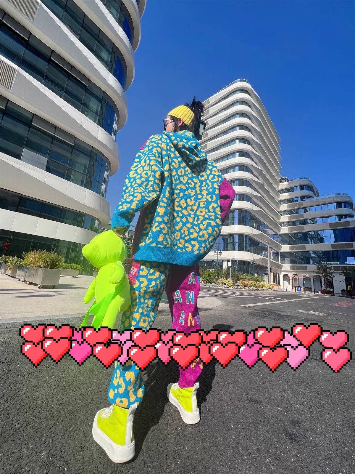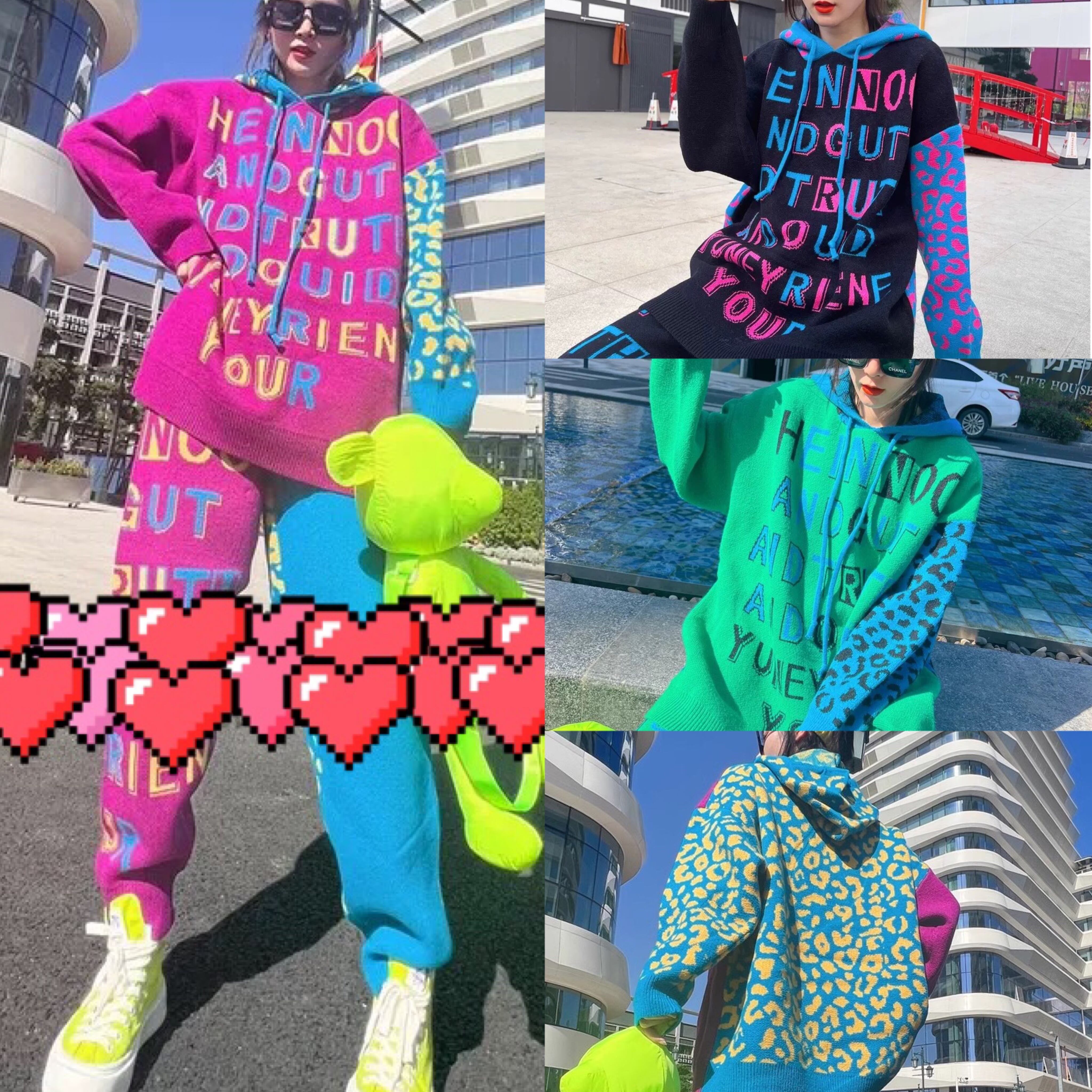 【セットアップ】ヒョウ柄 レオパード セーター トレーナー カジュアル パンツ 水色 緑 ピンク 紫 黒 パーカー スウェット