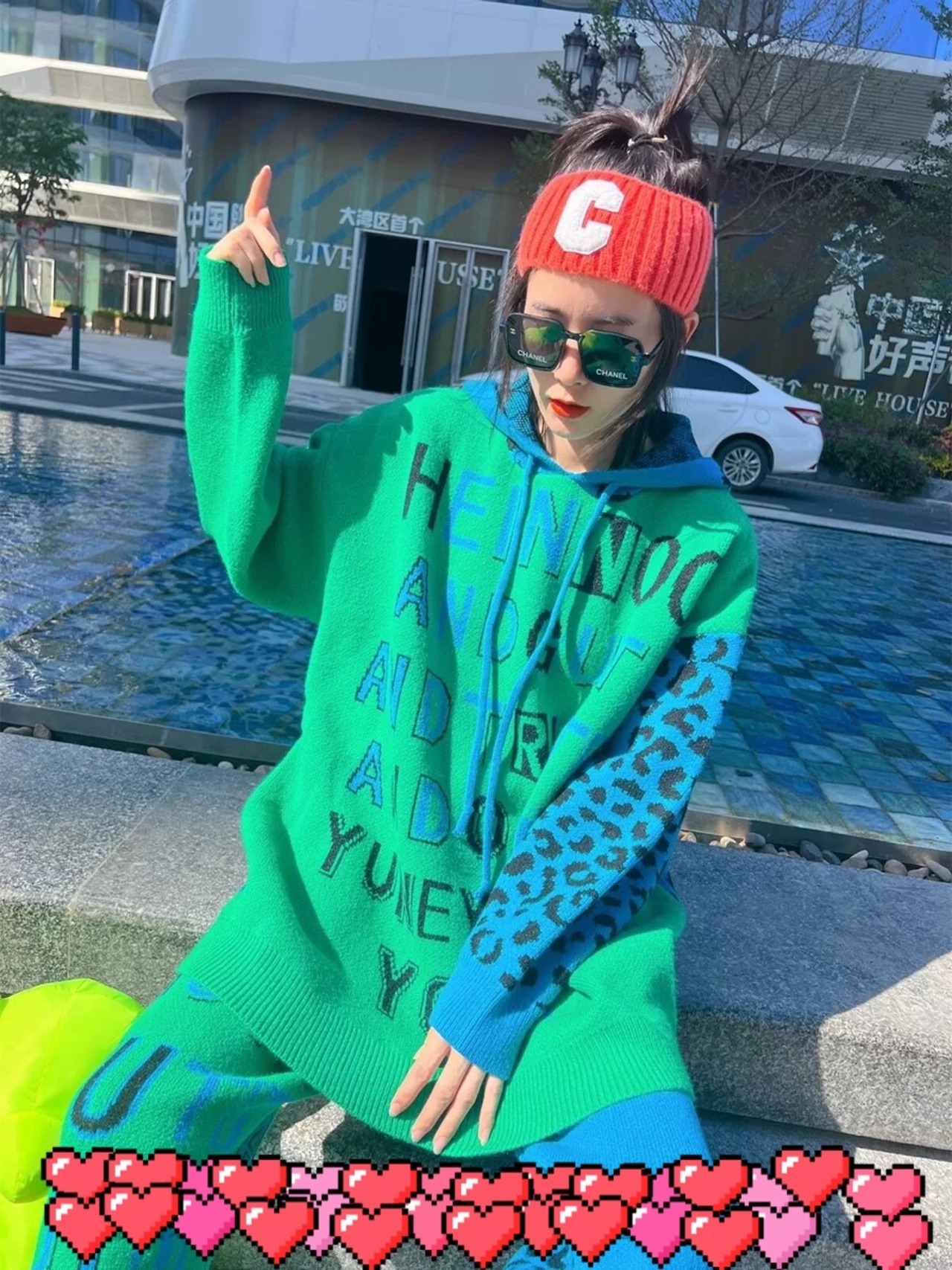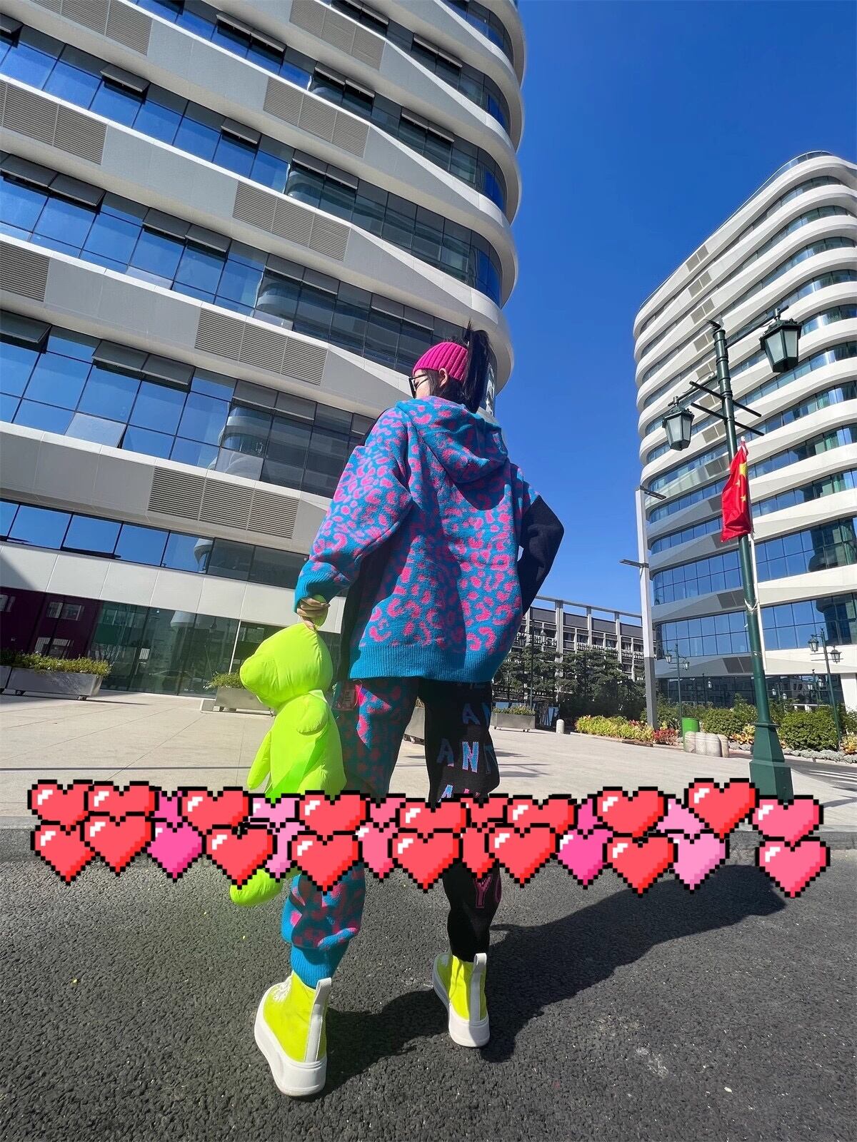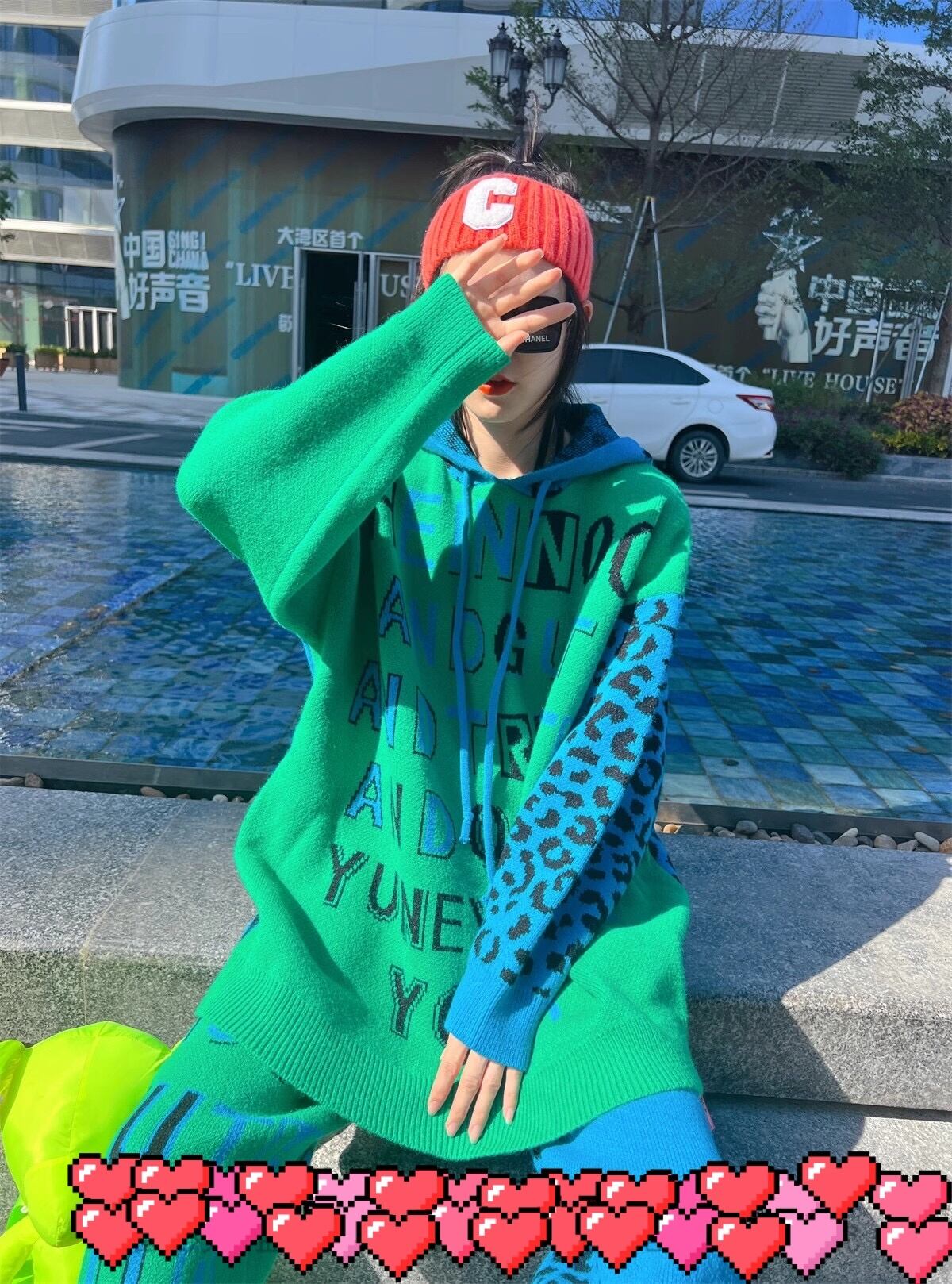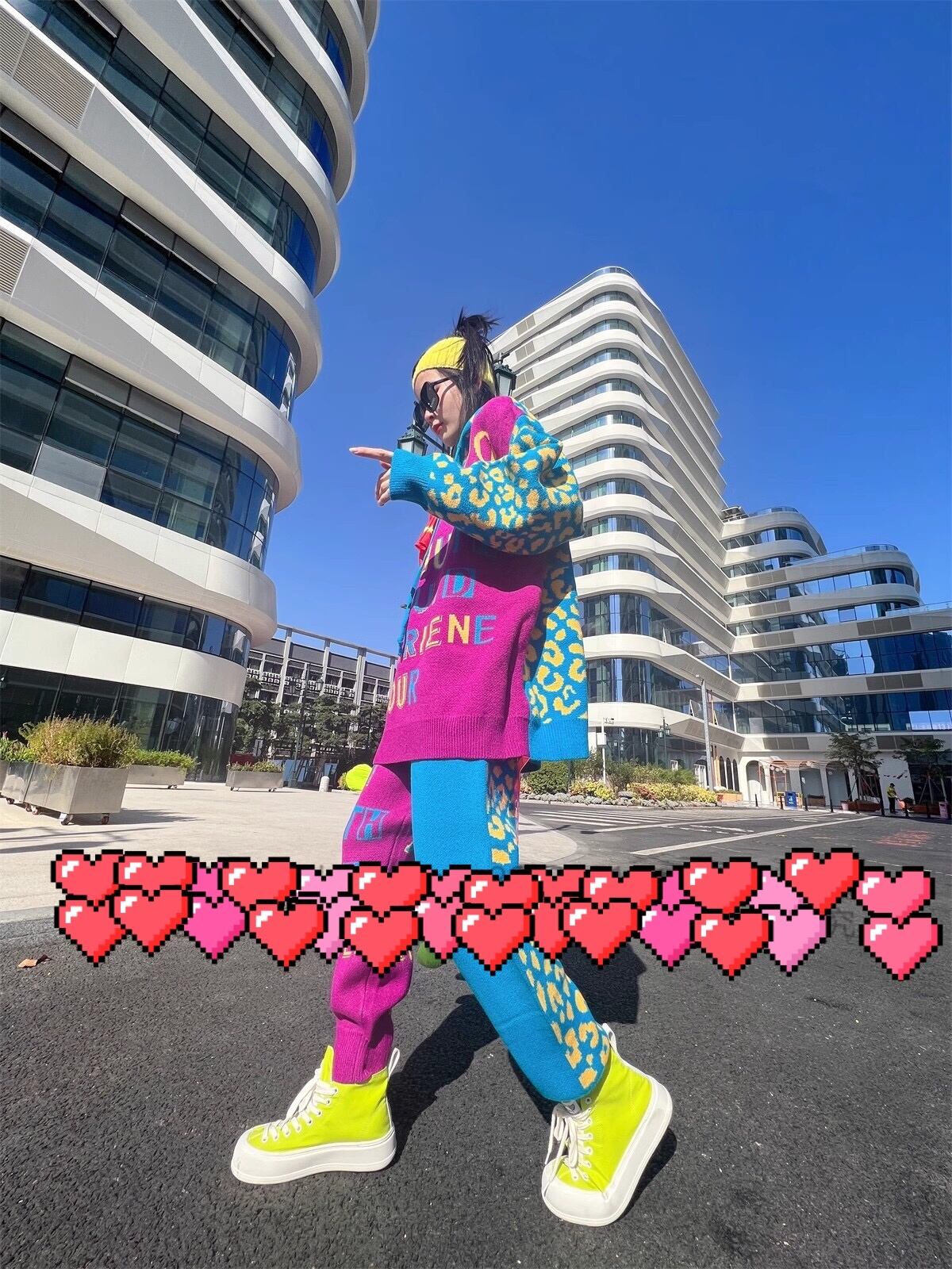 【セットアップ】ヒョウ柄 レオパード セーター トレーナー カジュアル パンツ 水色 緑 ピンク 紫 黒 パーカー スウェット
