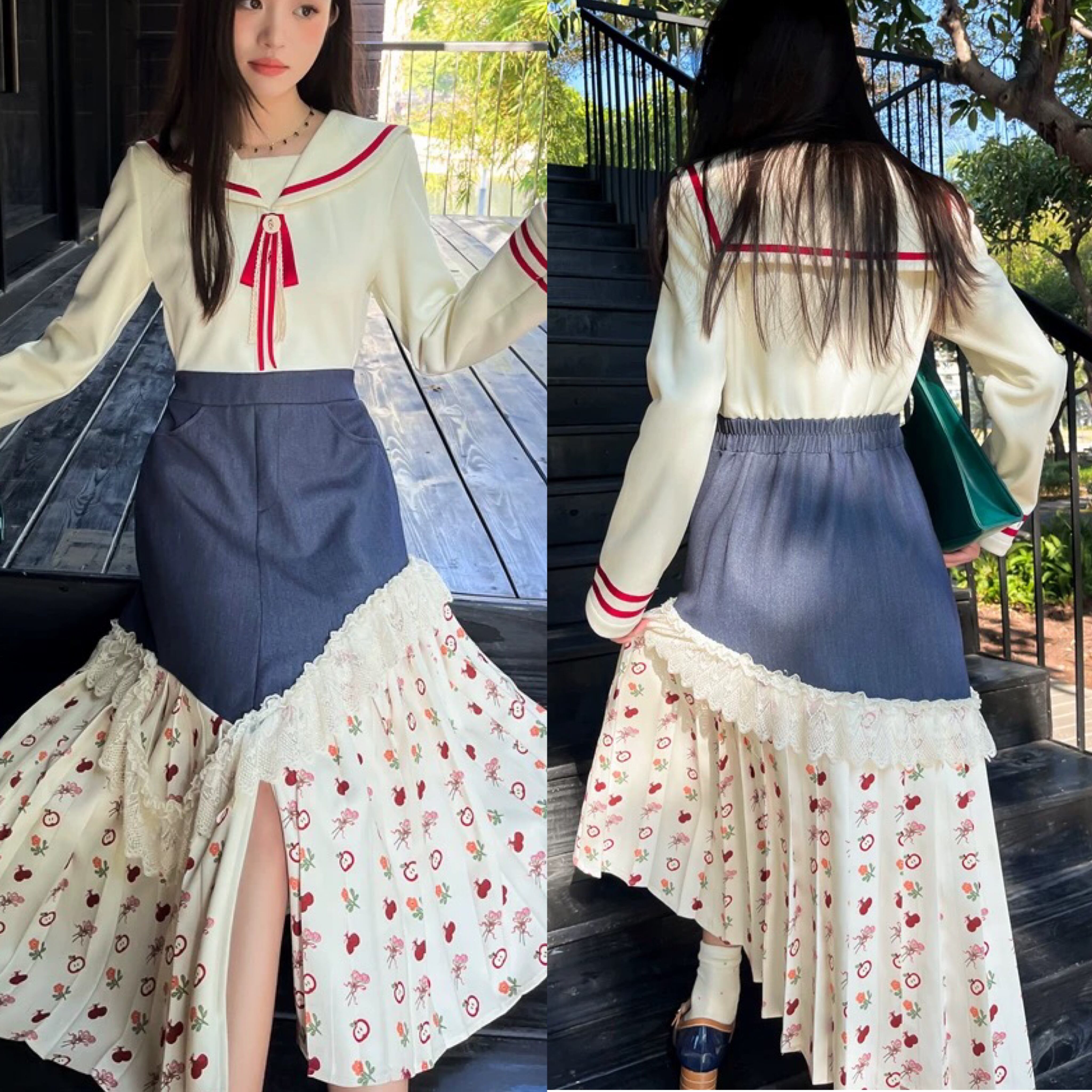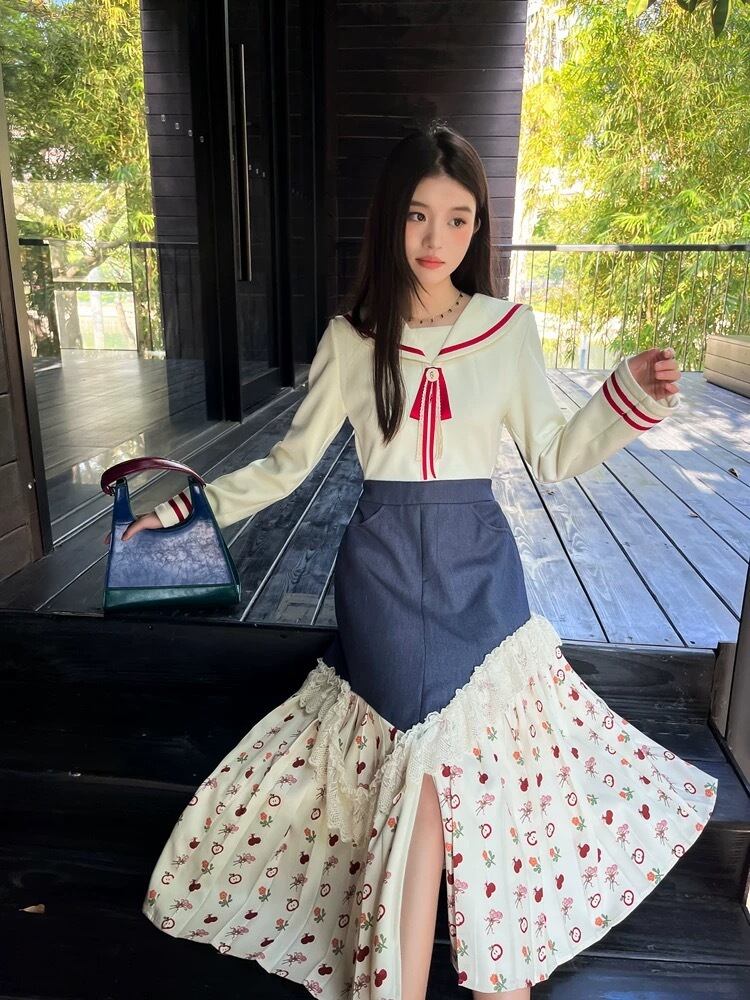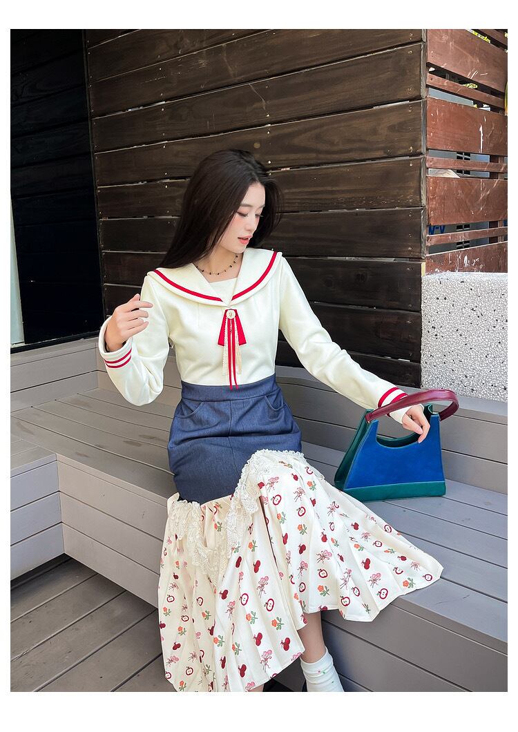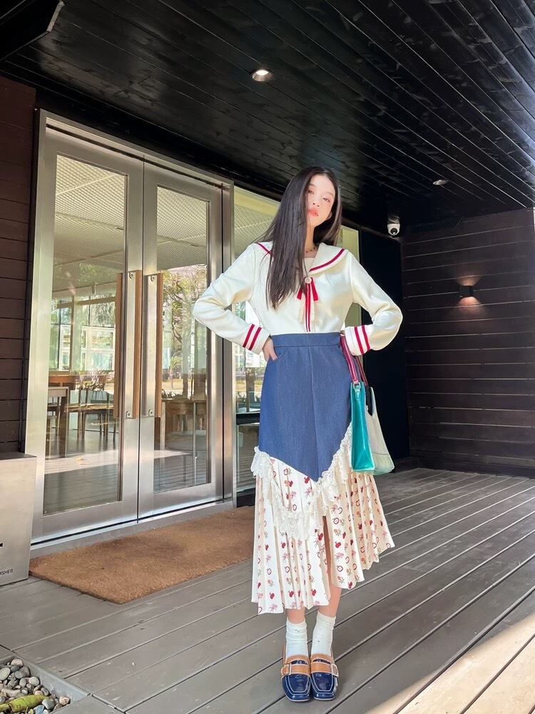 マリン セーラー ワンピース XL プリーツスカート デニム リボン 赤 花柄 ハート 可愛い 原宿