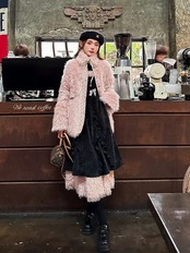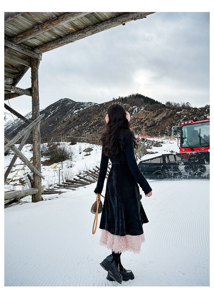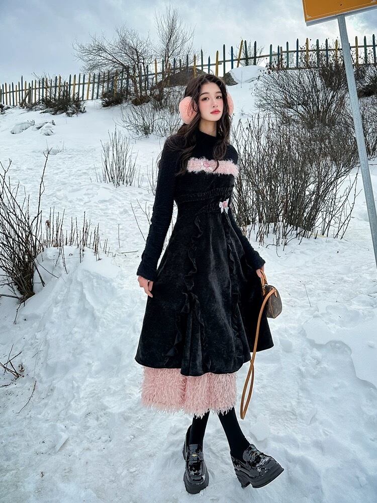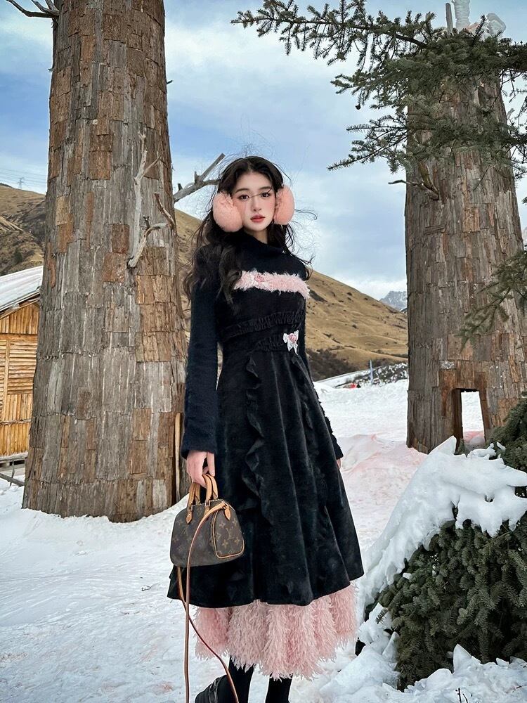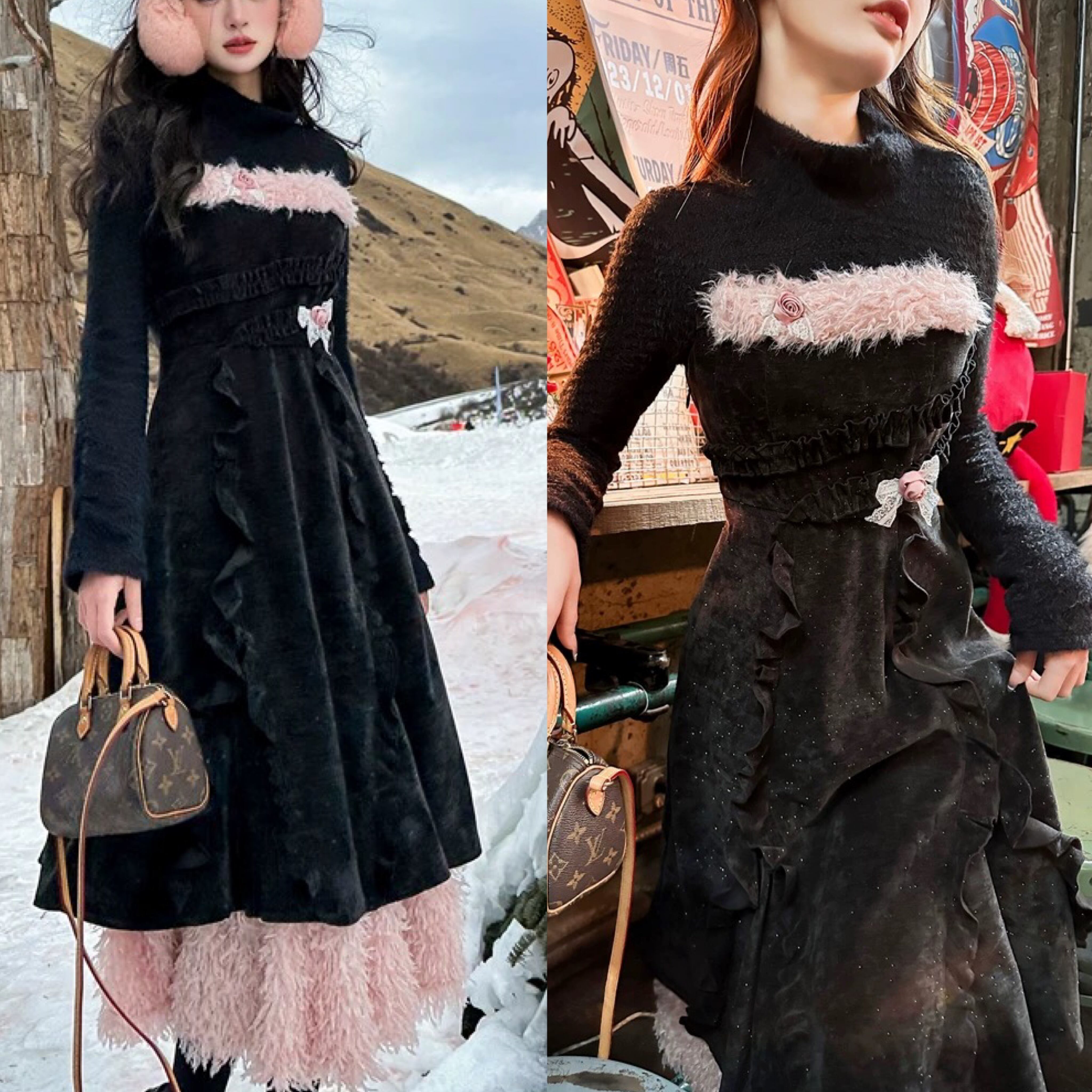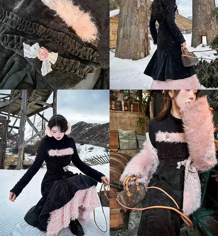 黒 ピンク ベルベット ラメ 可愛い ワンピース ファー ゆったり 原宿 ガーリー 可愛い