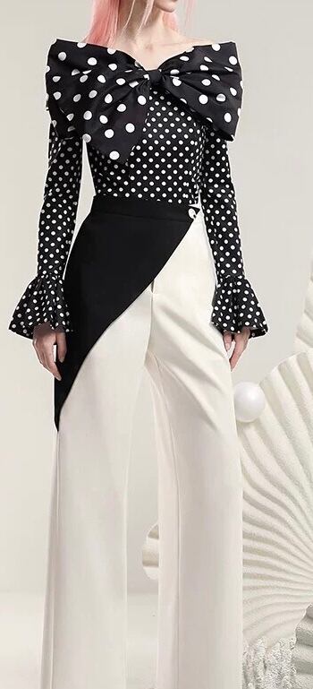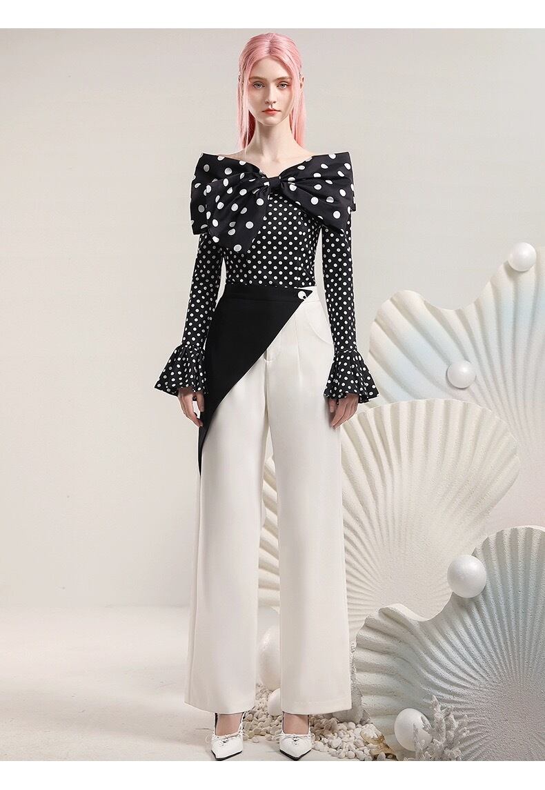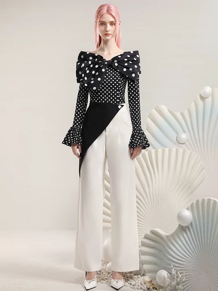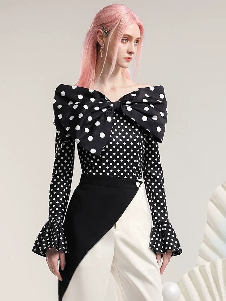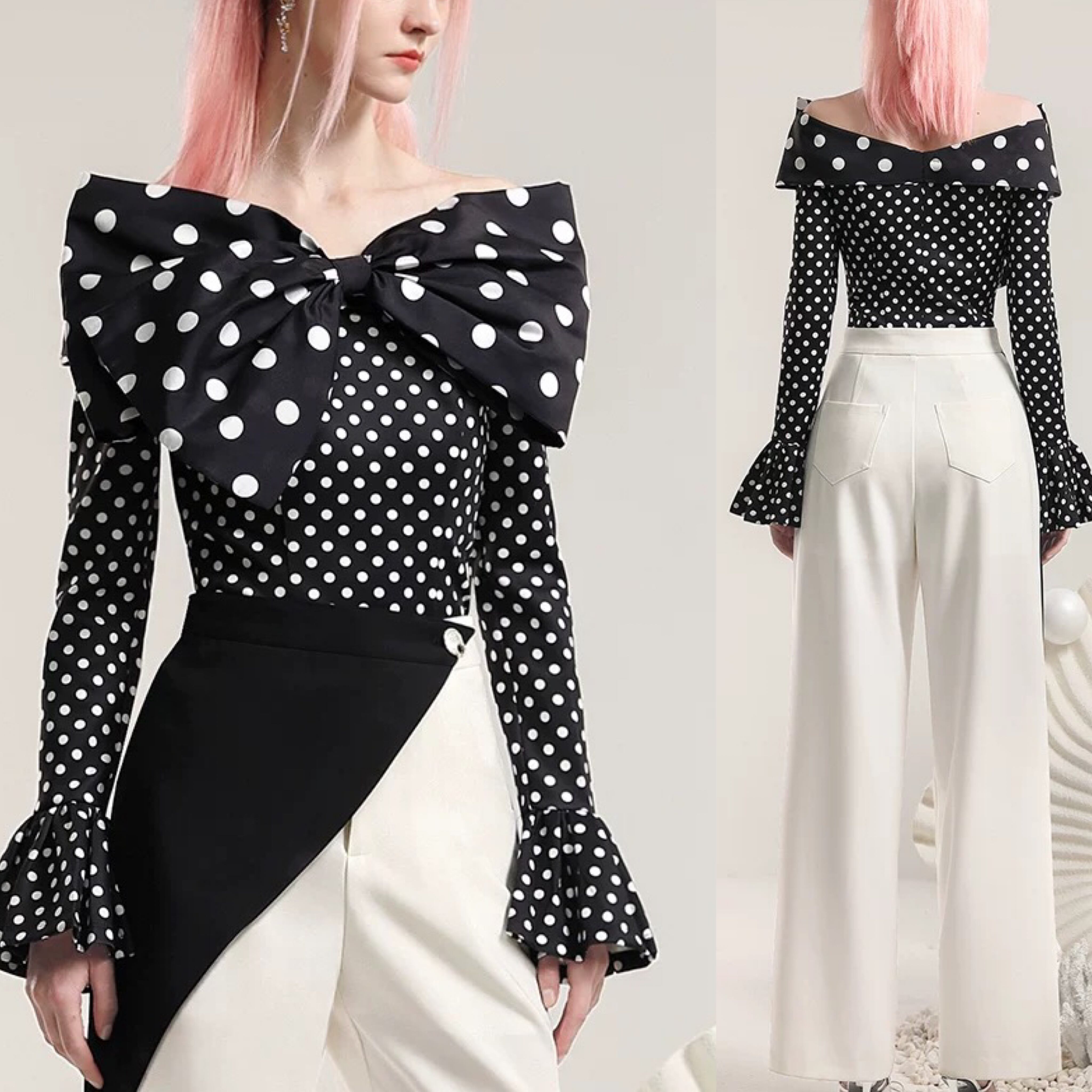 水玉 ドット ブラウス トップス オフショルダー リボン 黒 白 シャツ ドレス