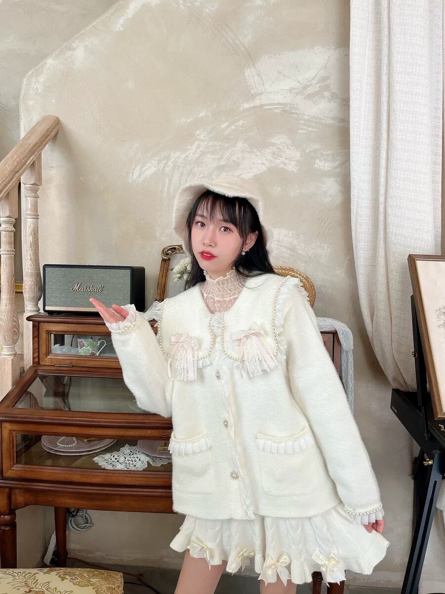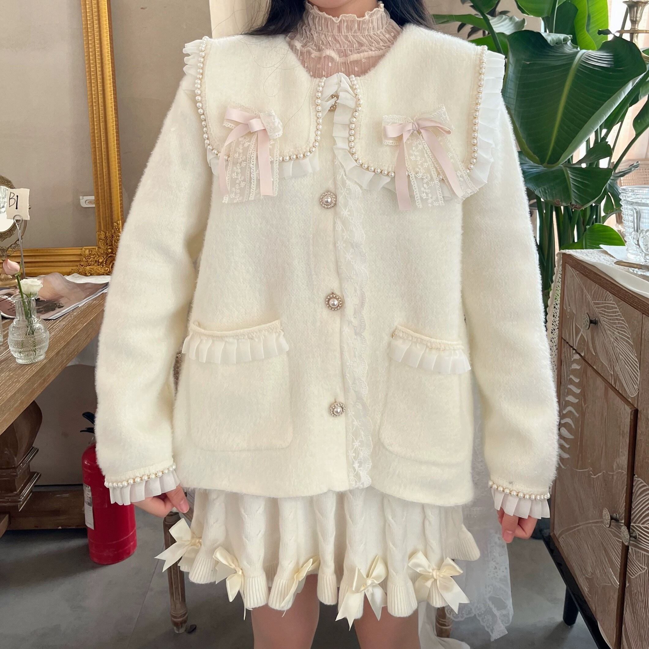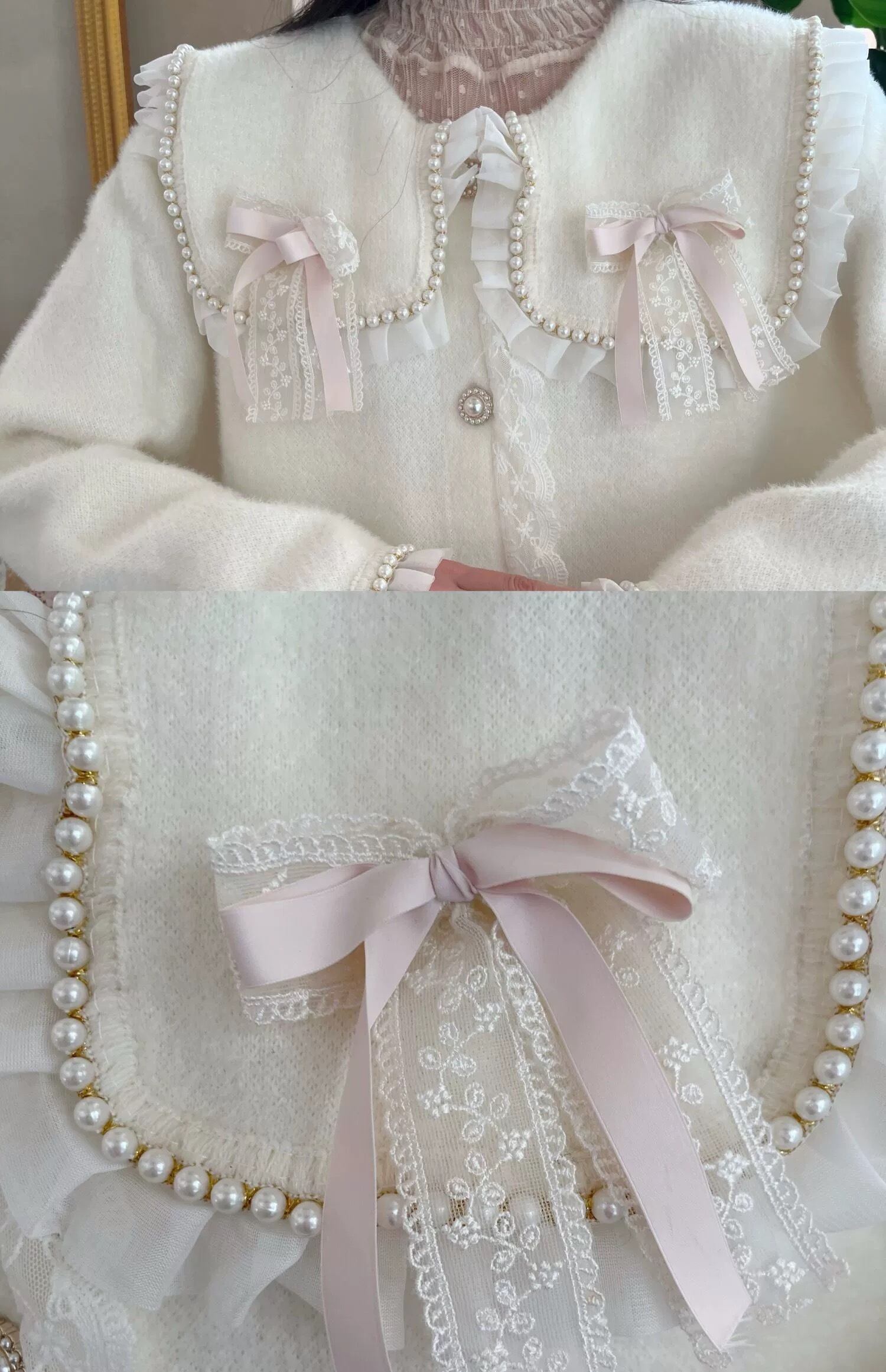 セーター アウター ジャケット コート 丸襟 デコレーション カーディガン パール リボン ガーリー 原宿 可愛い 姫 リボン