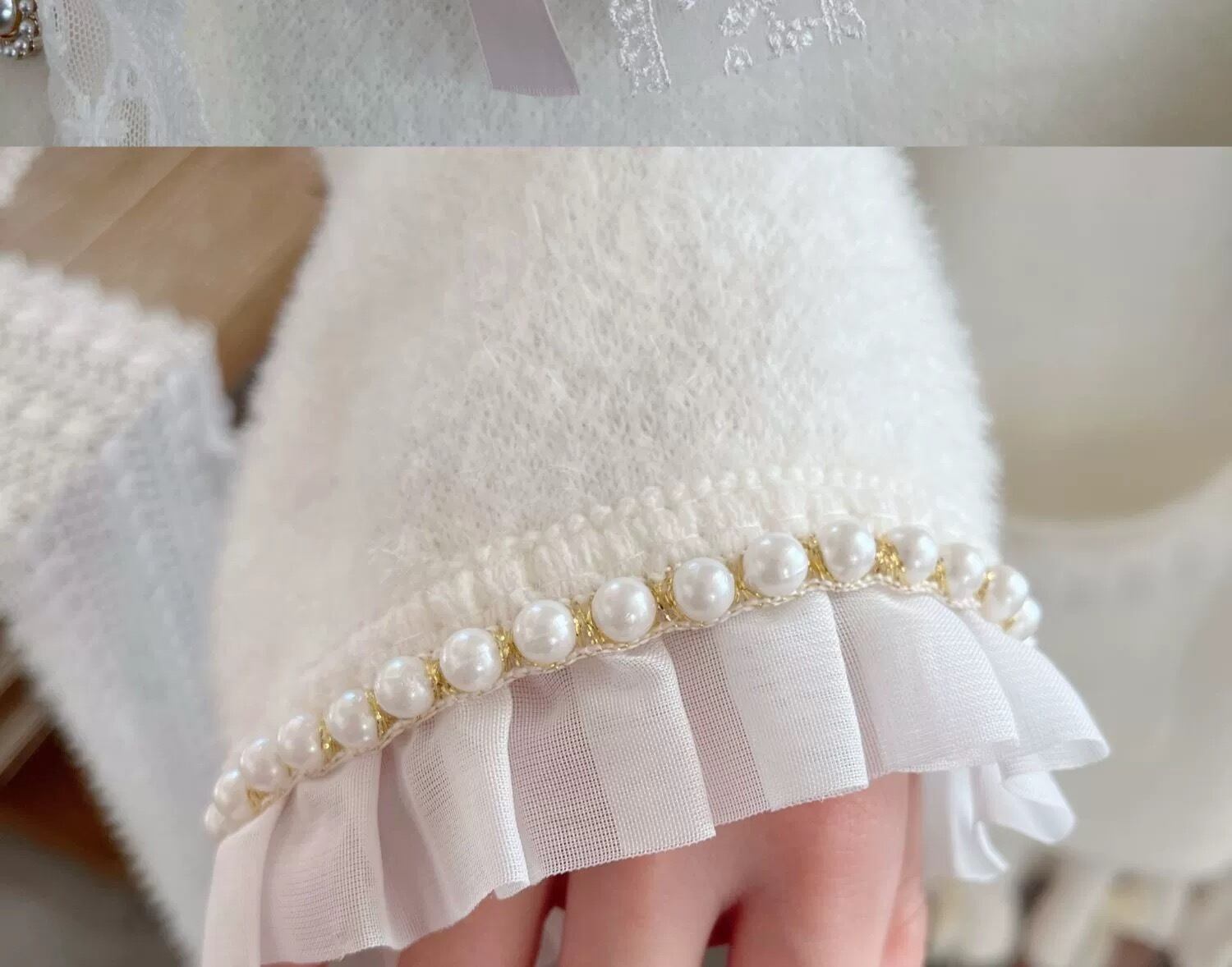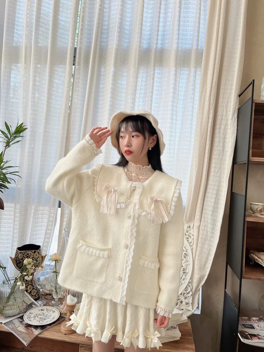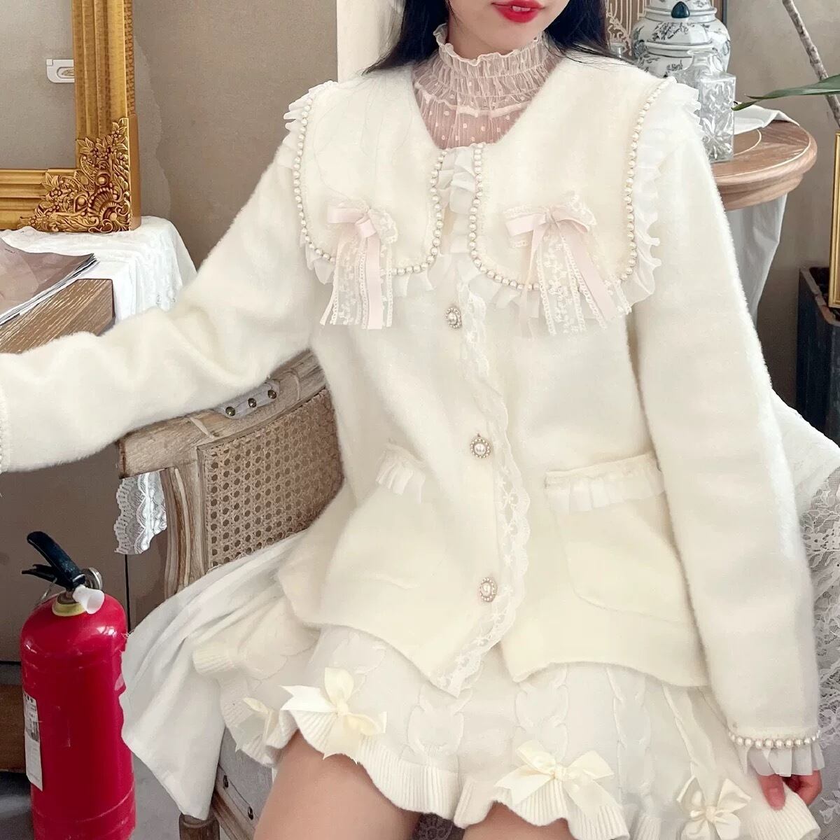セーター アウター ジャケット コート 丸襟 デコレーション カーディガン パール リボン ガーリー 原宿 可愛い 姫 リボン