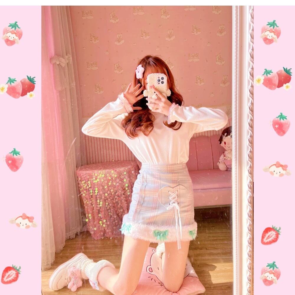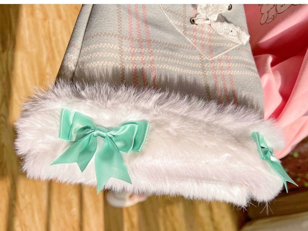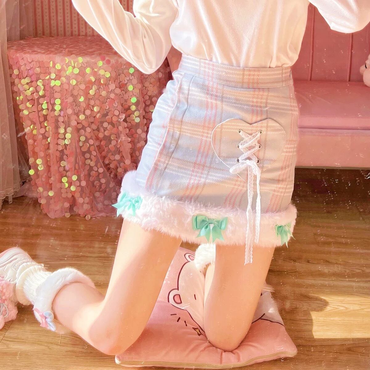 ファー チェック 緑 ピンク ハート ボトムス ガーリー
