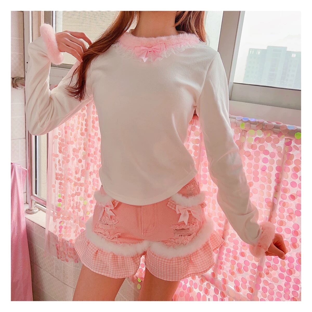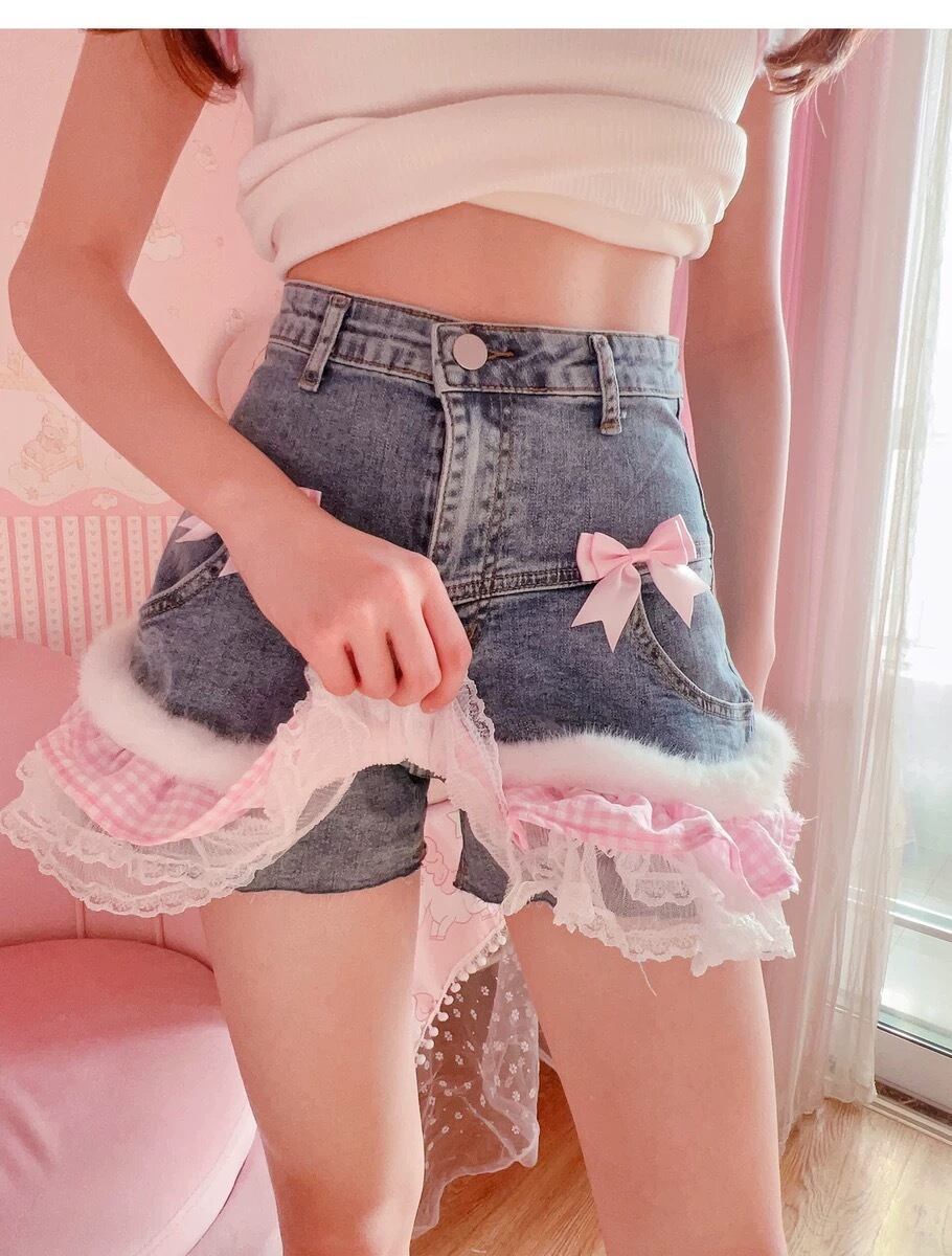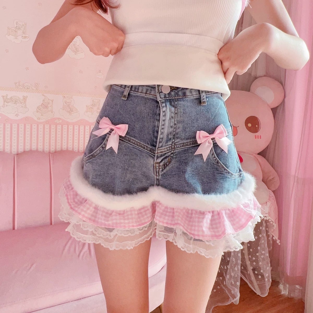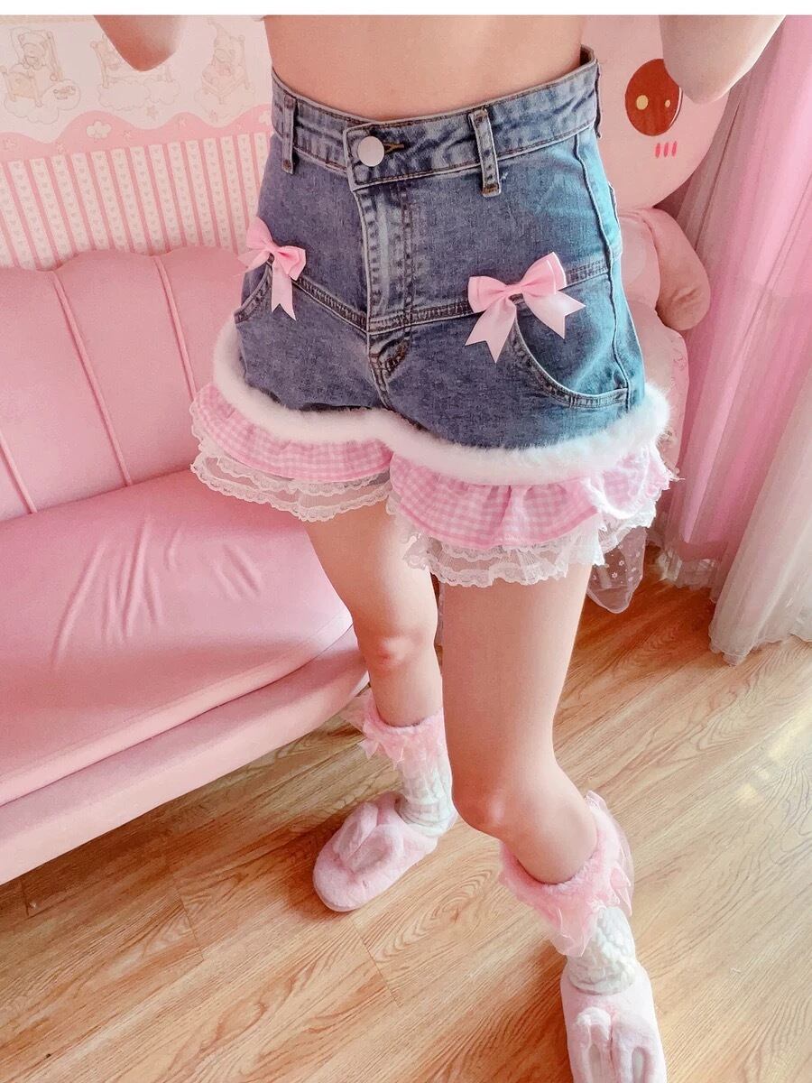 ショートパンツ ホットパンツ ファー デニム 水色 チェック