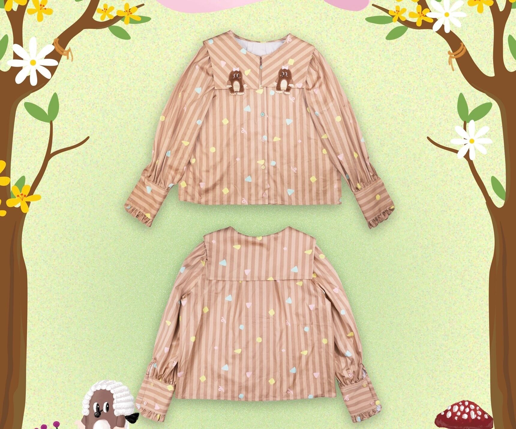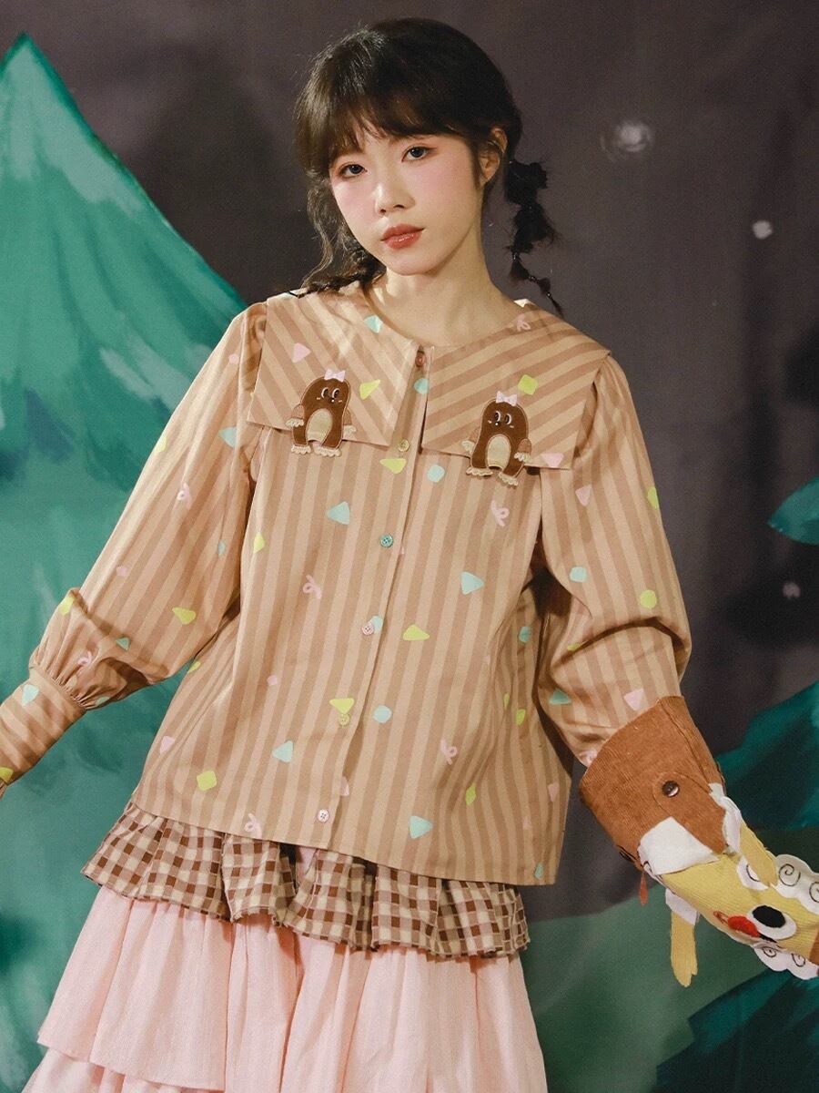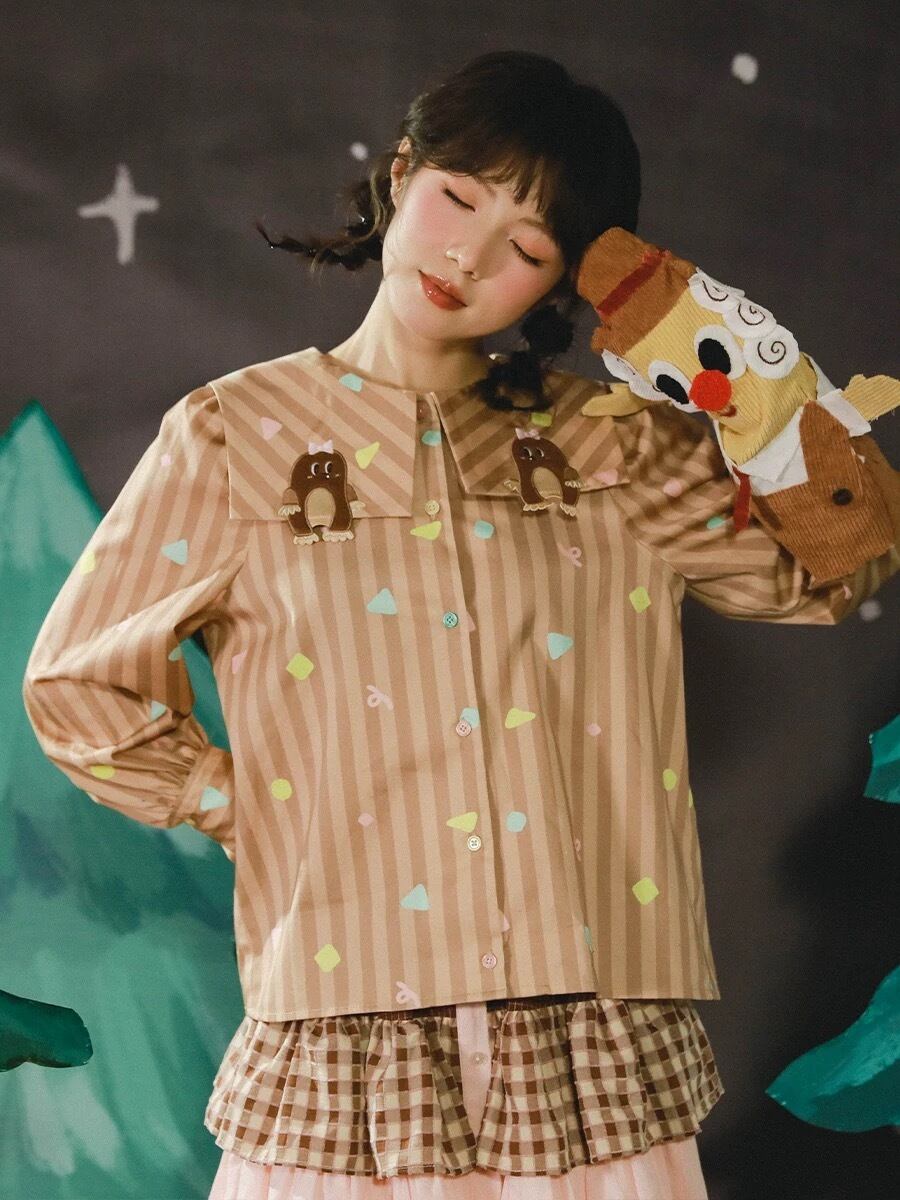 茶色 ボーダー チェック ブラウス シャツ もぐら ガーリー 原宿 ゆったり セーラー