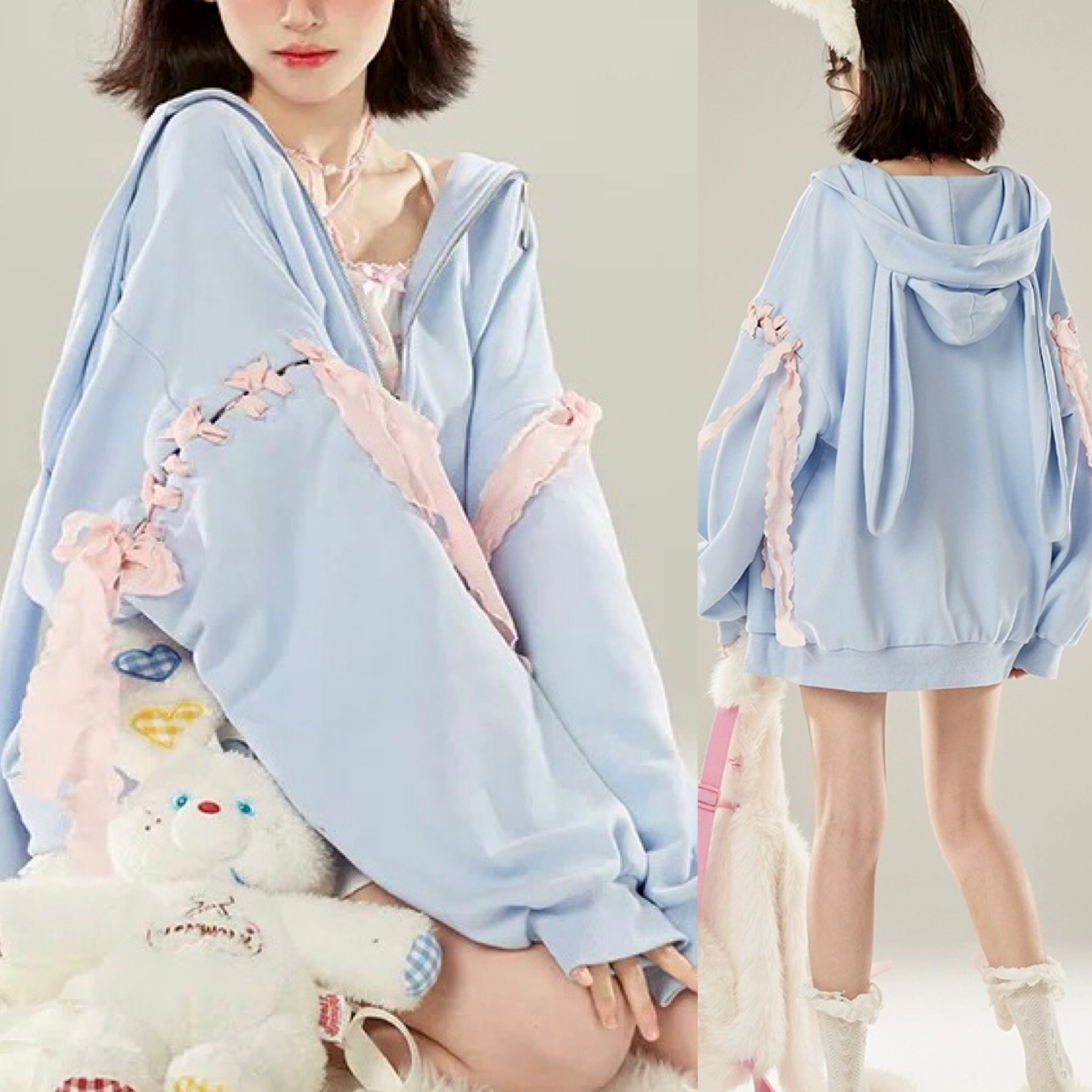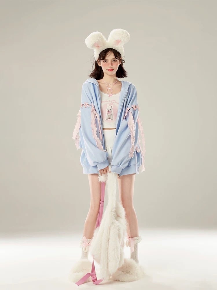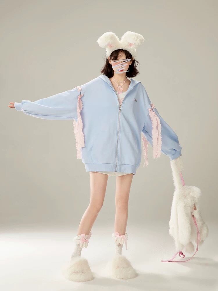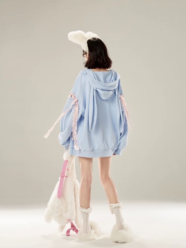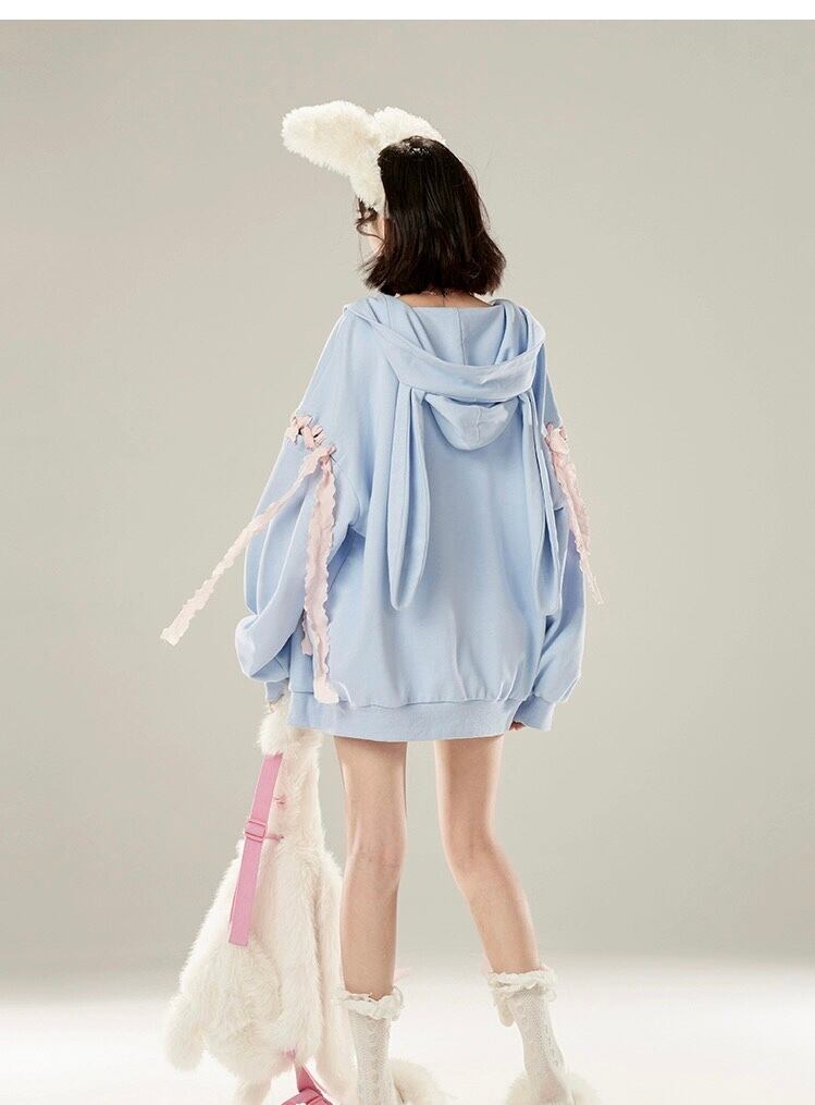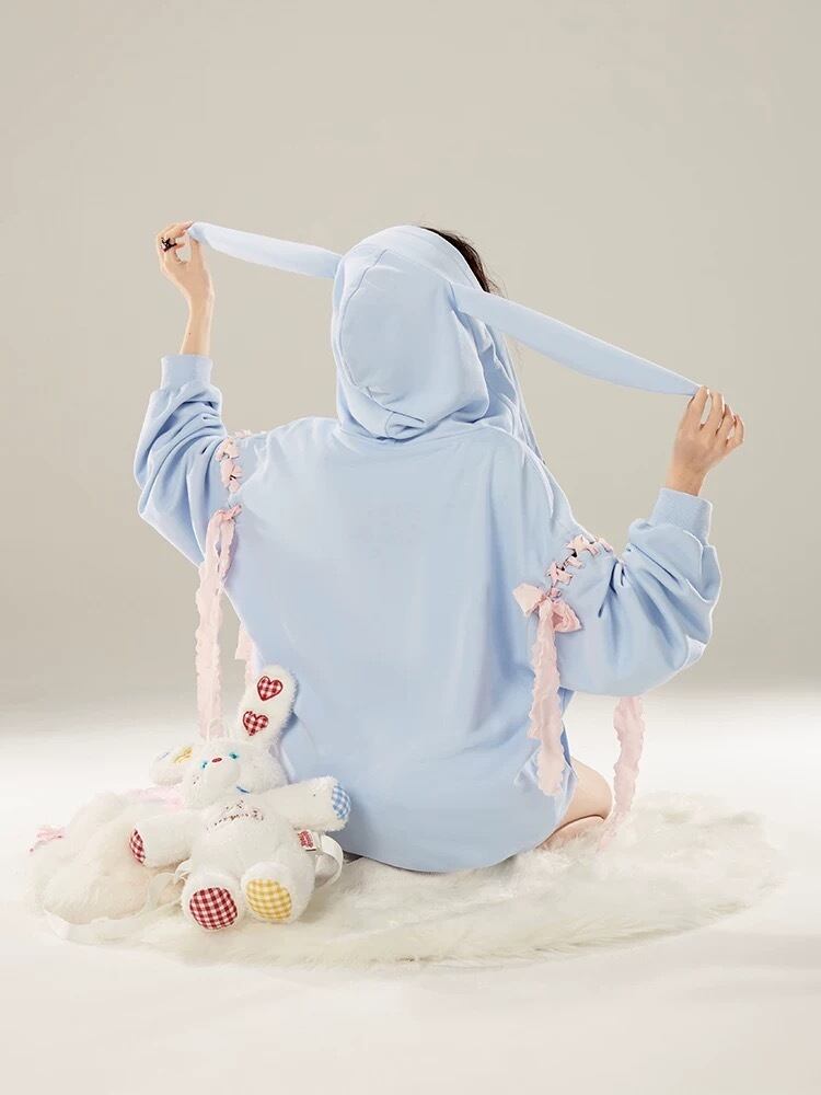 水色 パーカー スウェット トレーナー うさぎ ガーリー ゆったり アウター