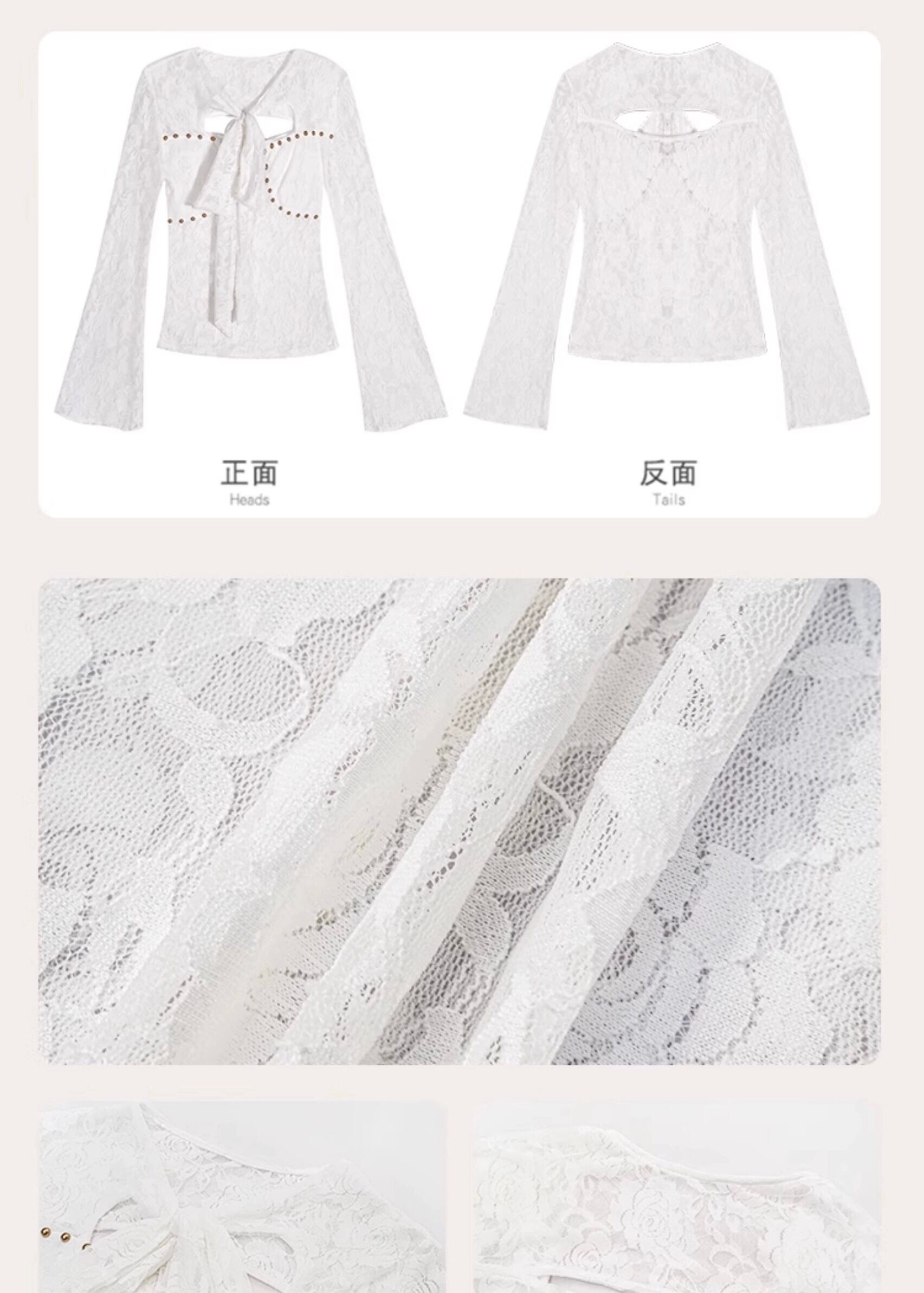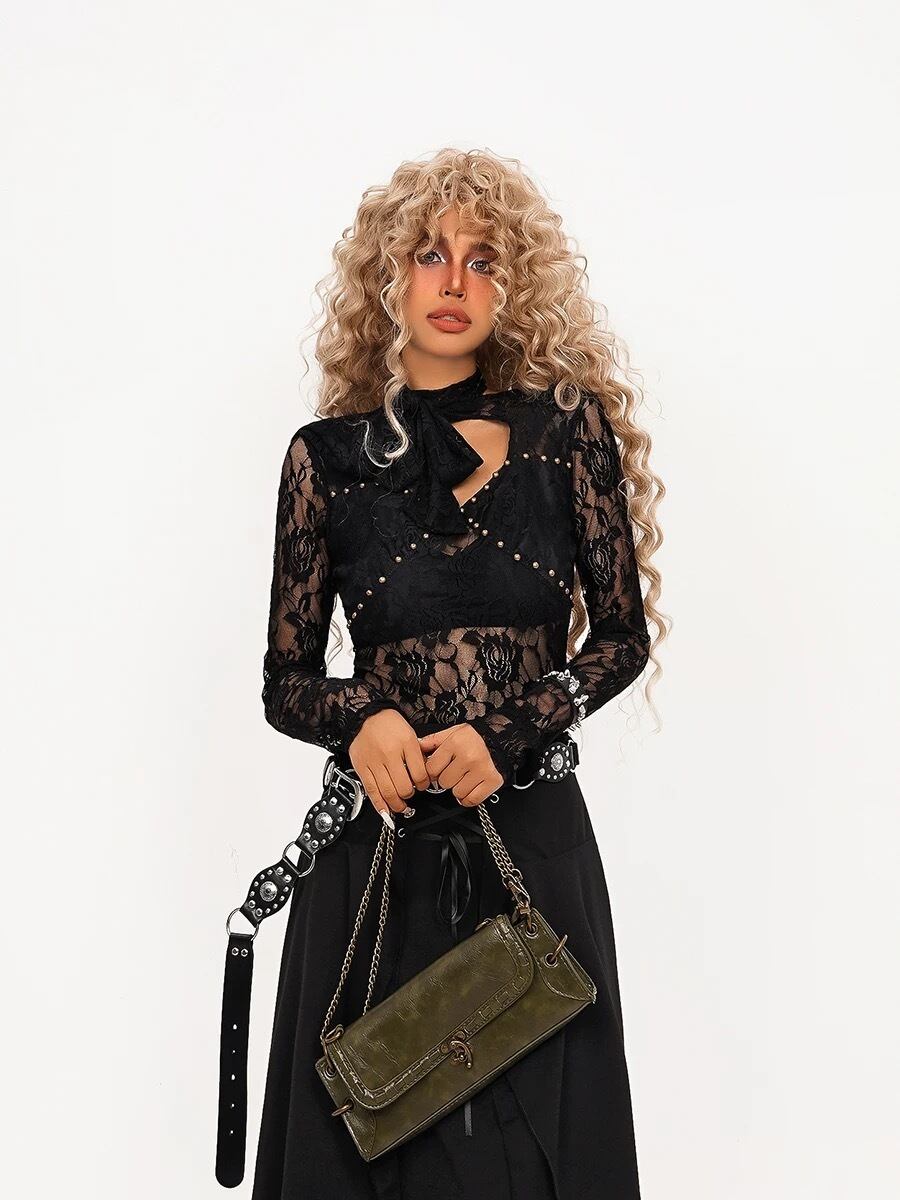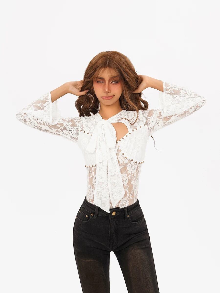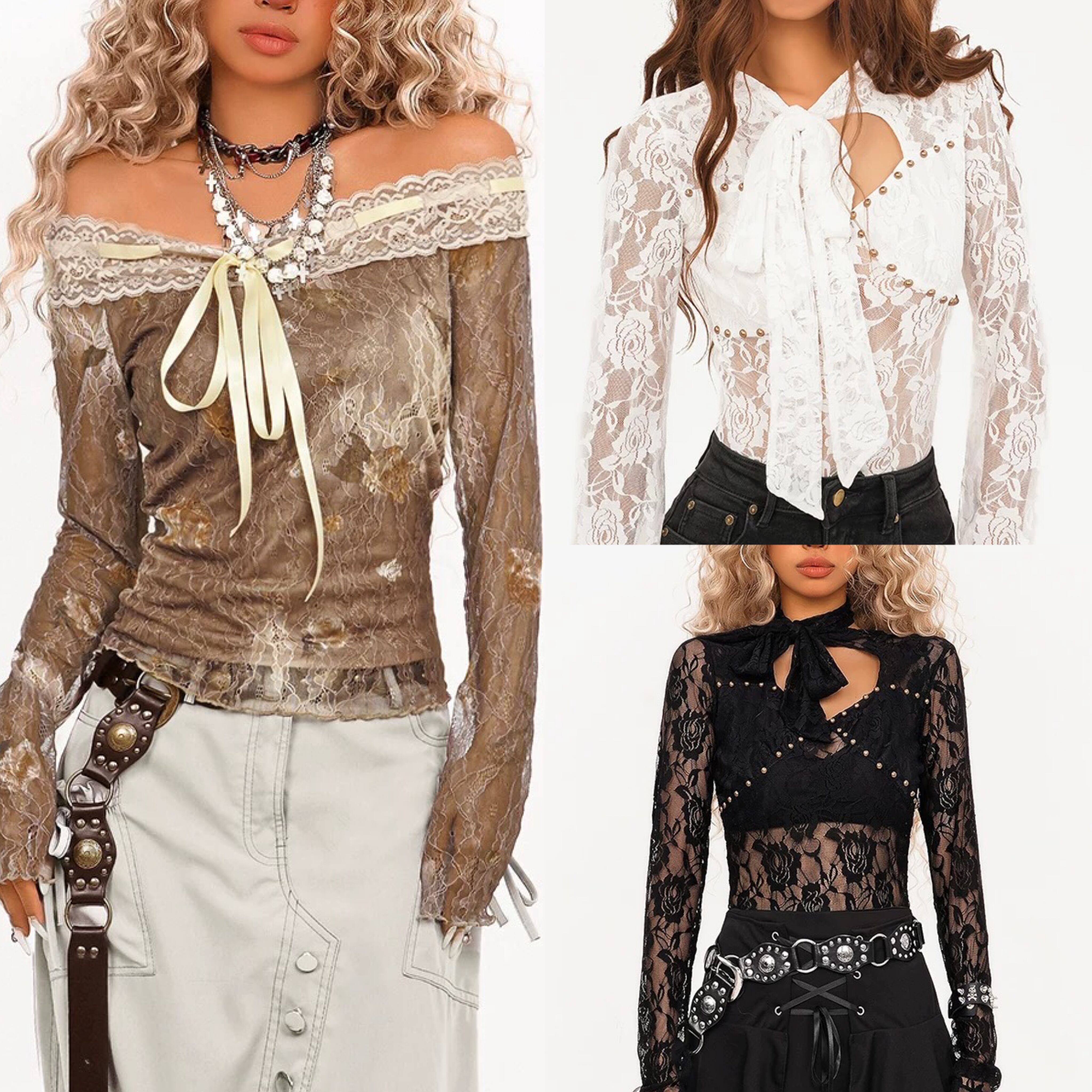 トップス ブラウス オフショルダー ベージュ 黒 リボン レース