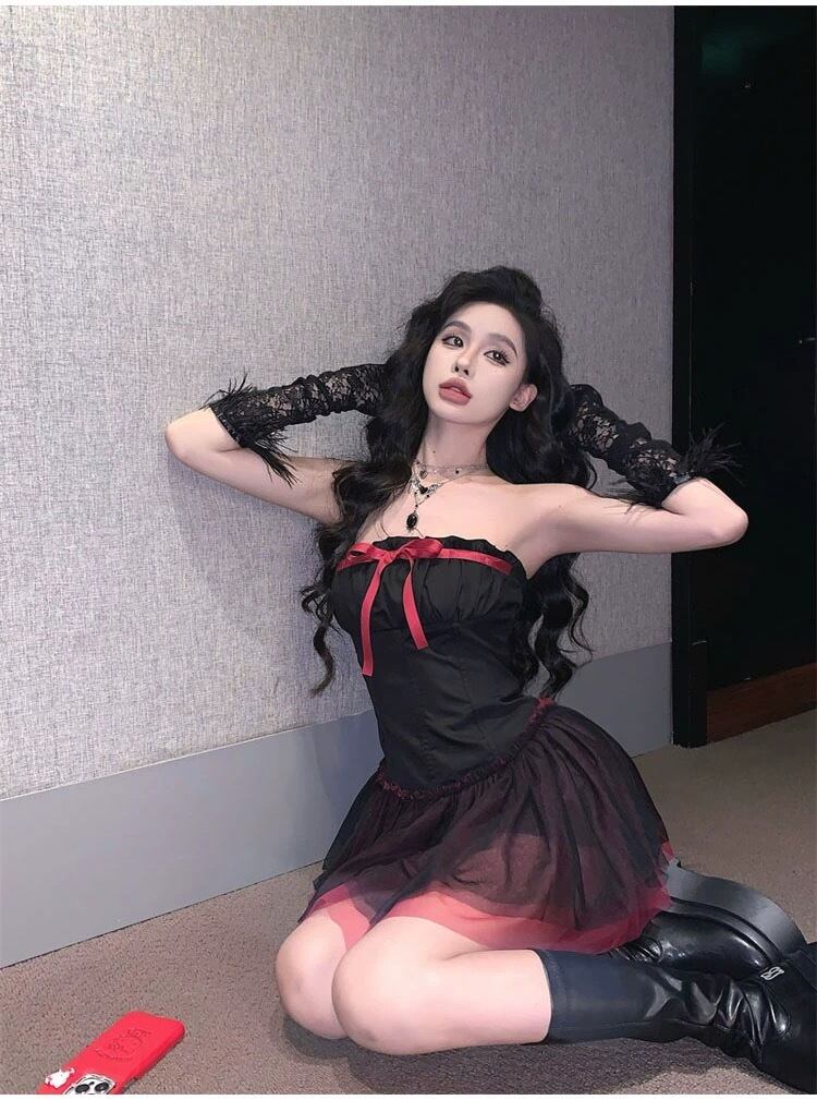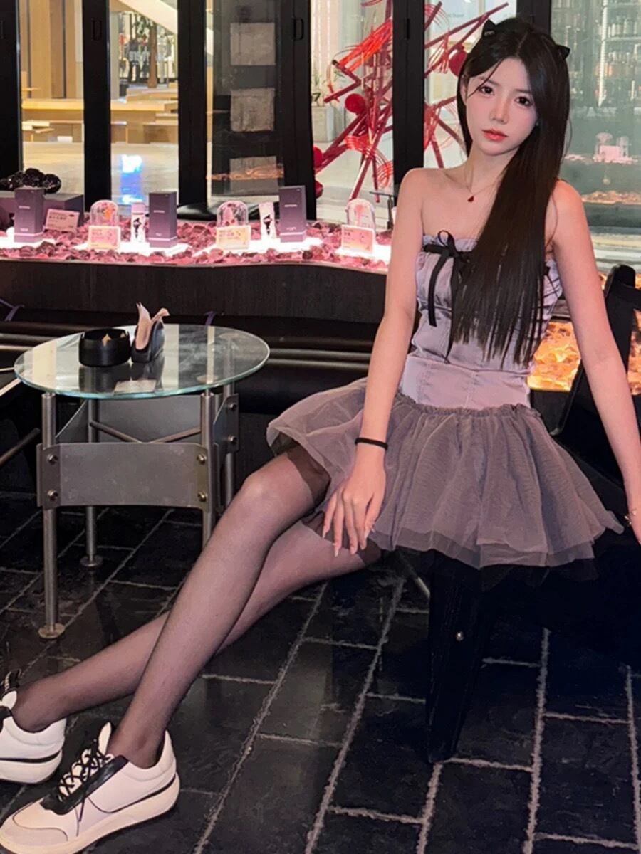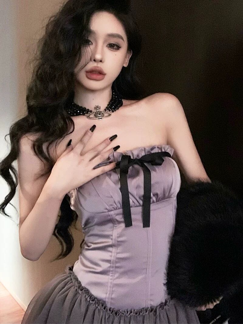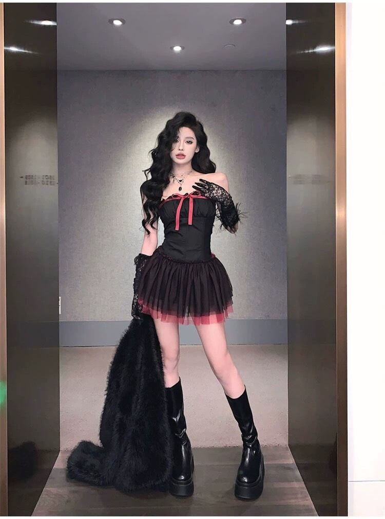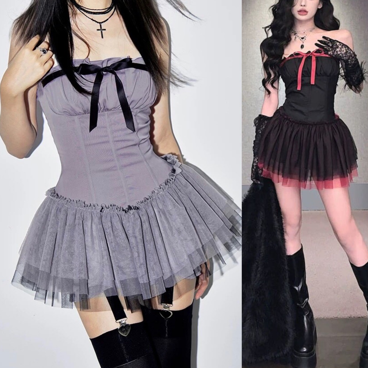 グレー 黒 リボン ガーリー ワンピース 可愛い スカート