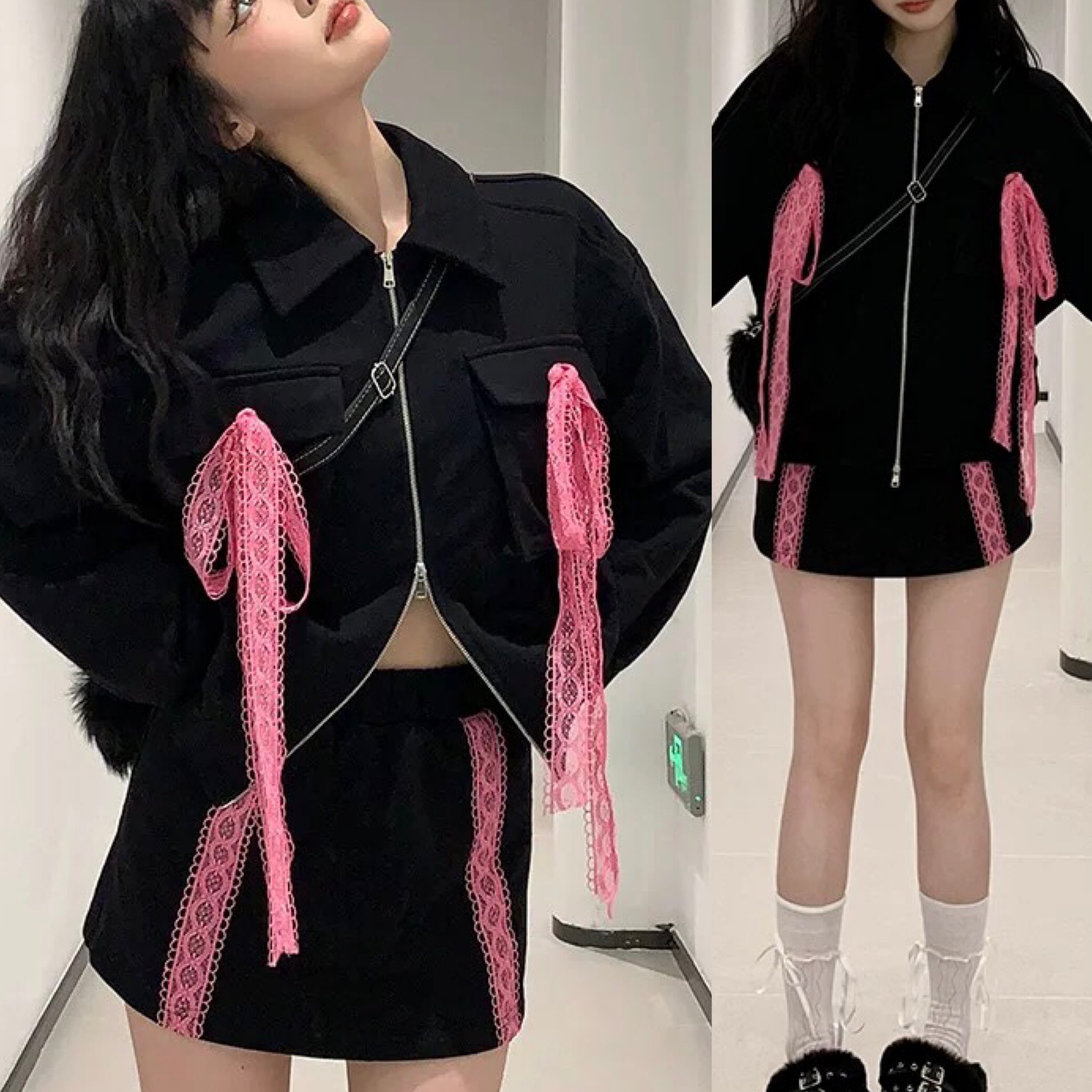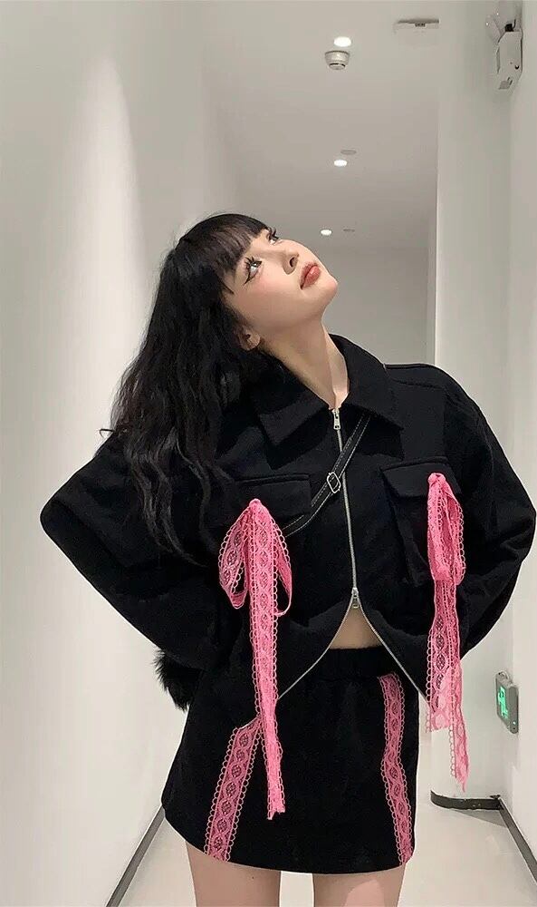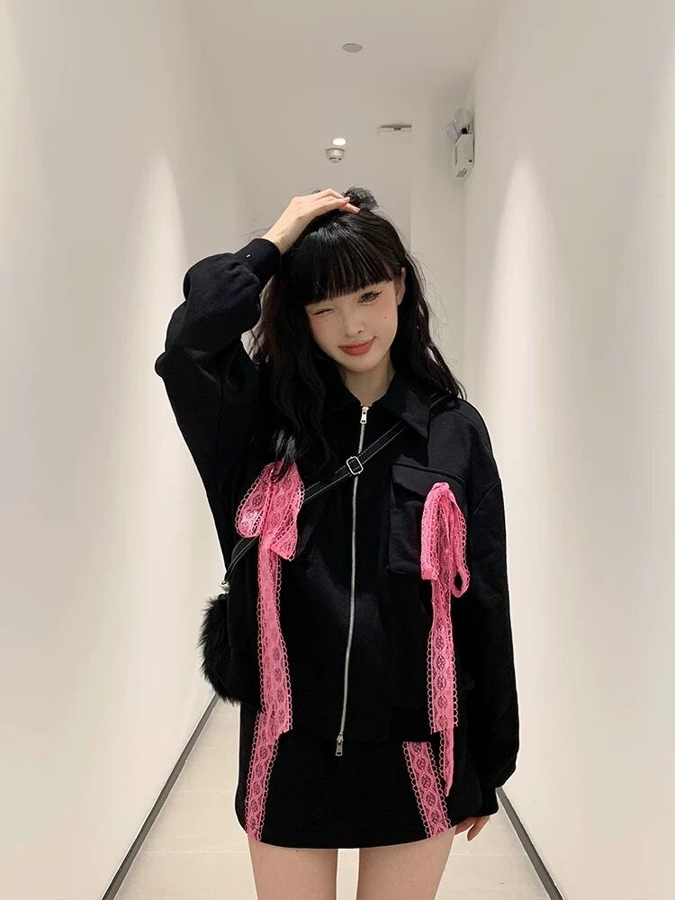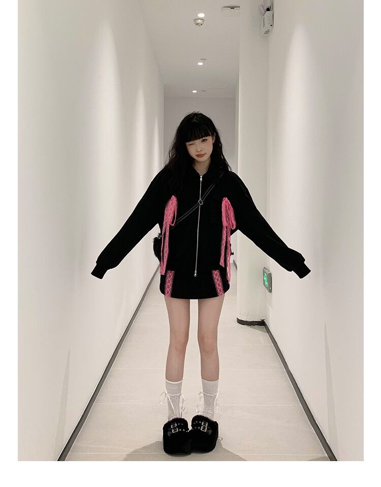 【セットアップ】ジャンパー アウター スカート リボン 黒 カーディガン セット カジュアル スウェット 原宿 可愛い