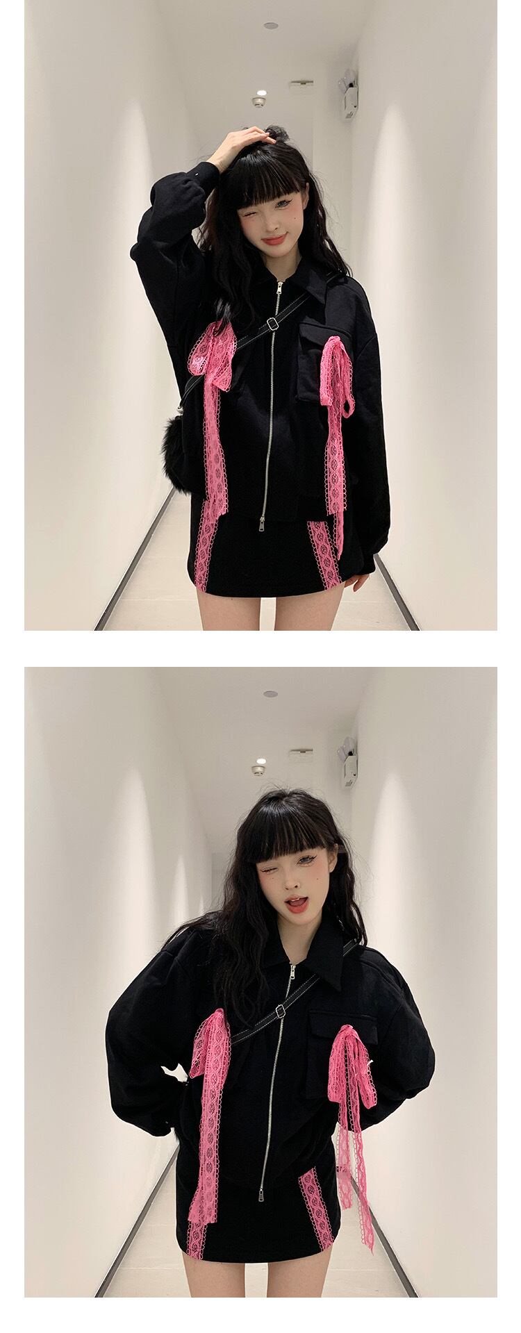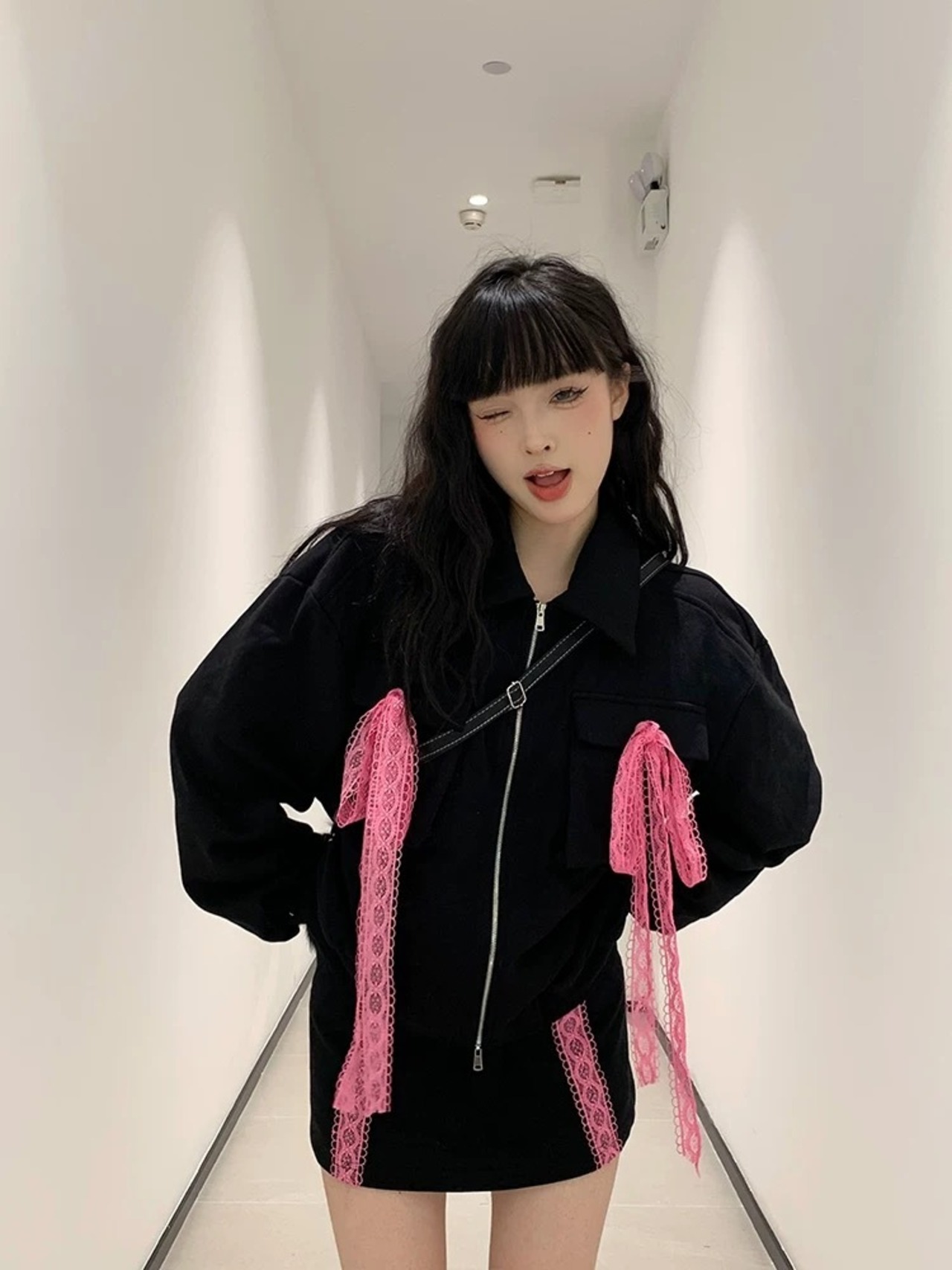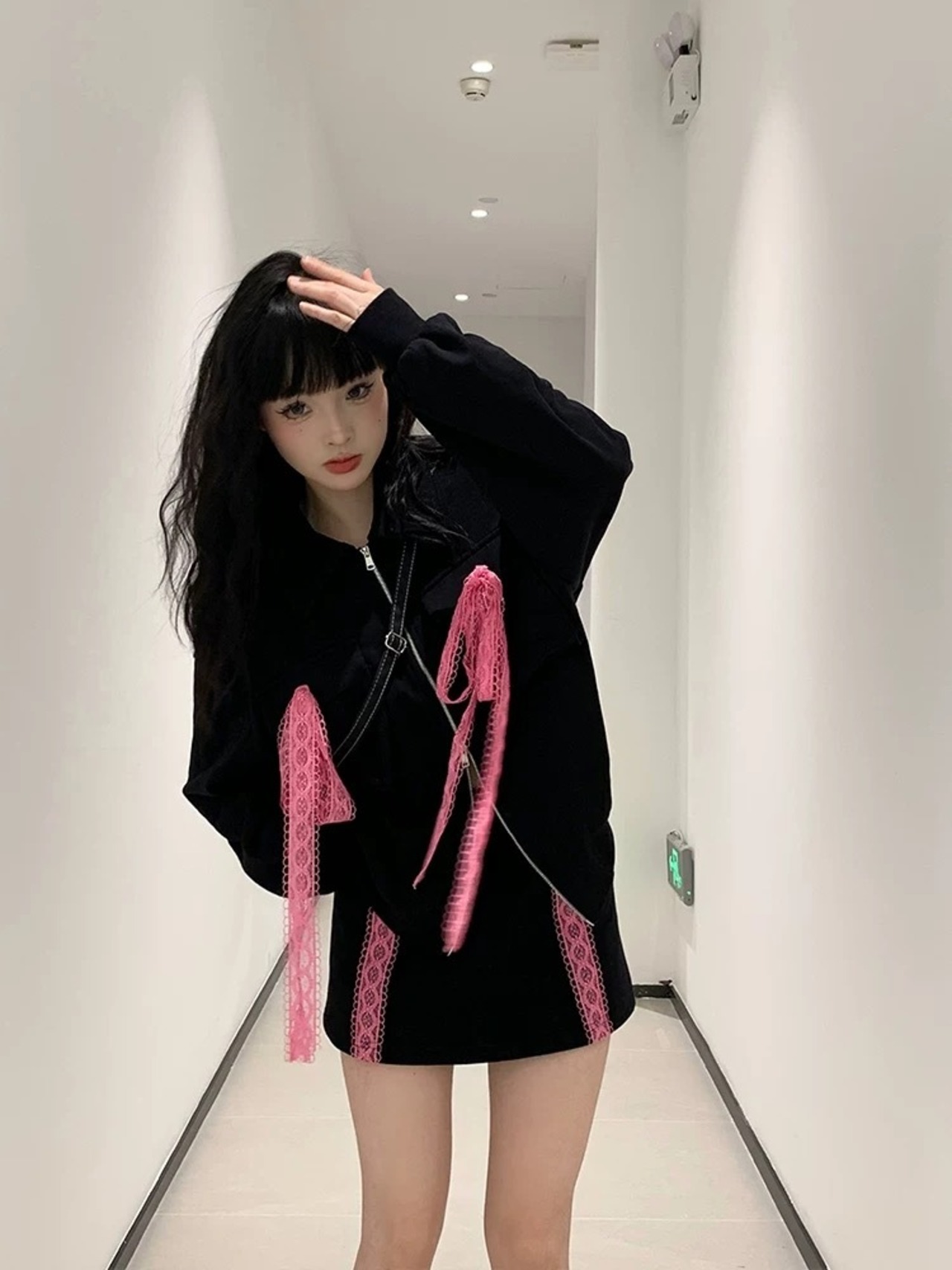 【セットアップ】ジャンパー アウター スカート リボン 黒 カーディガン セット カジュアル スウェット 原宿 可愛い
