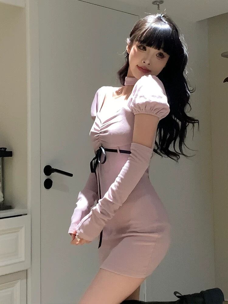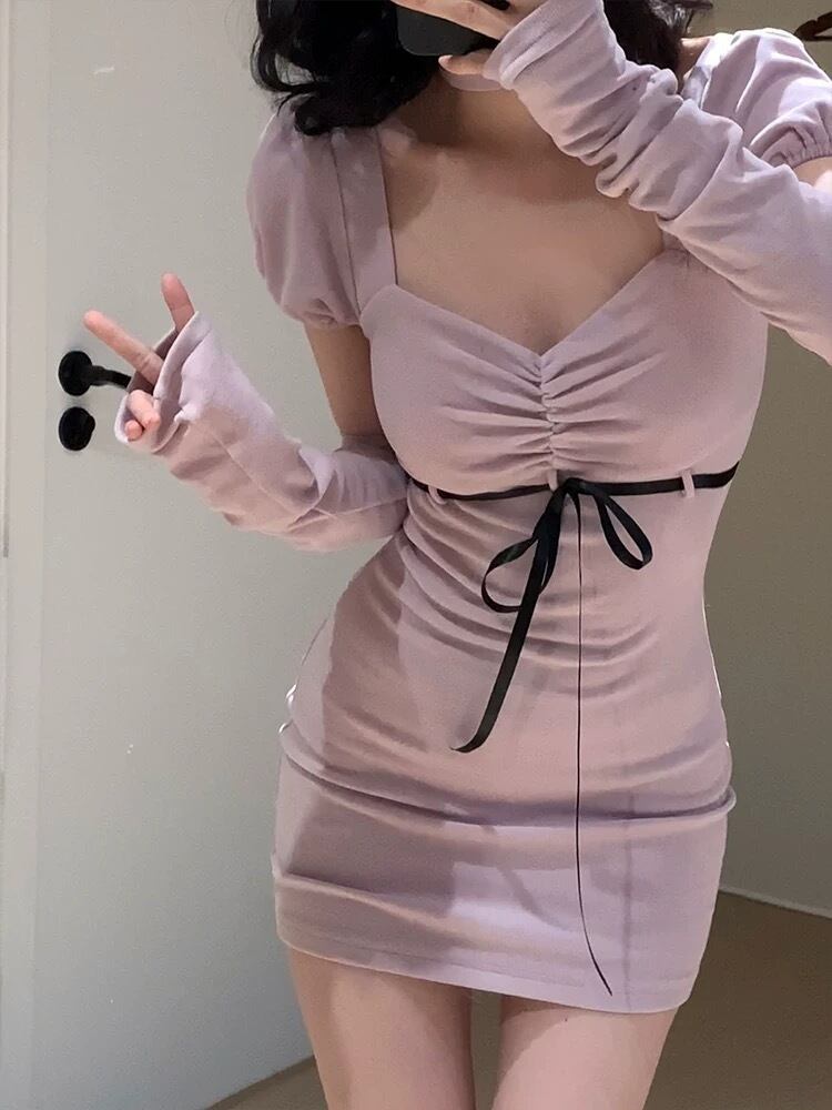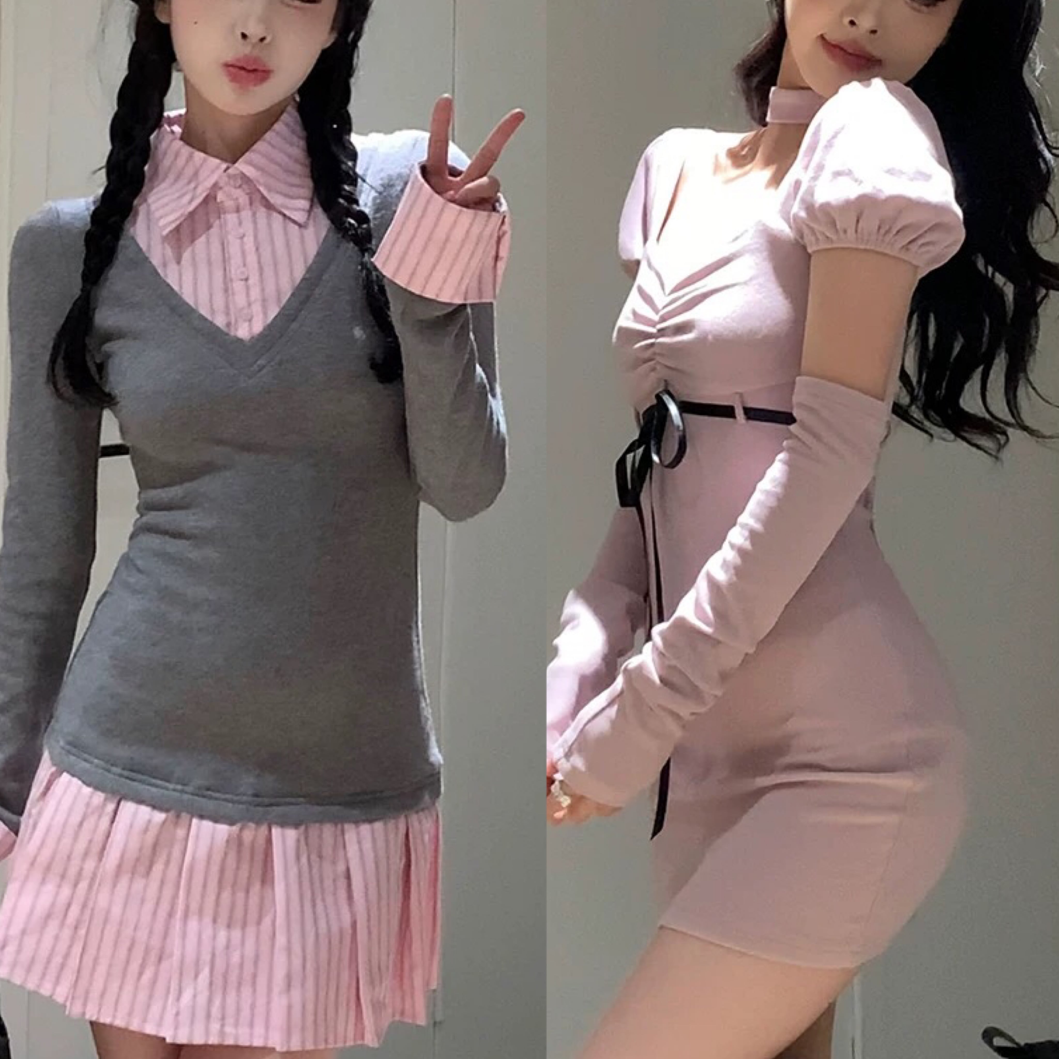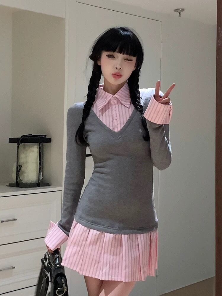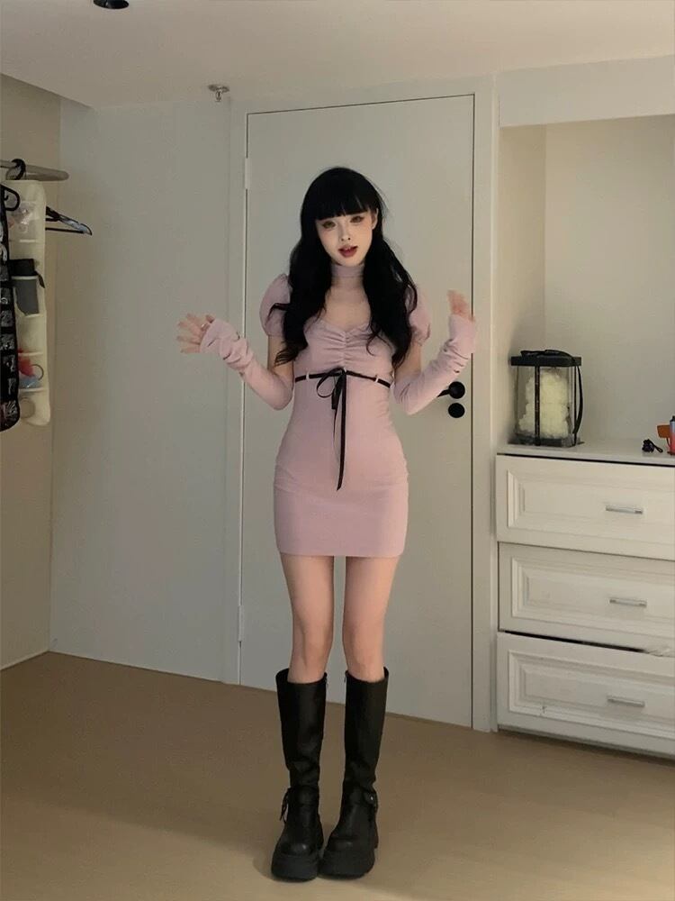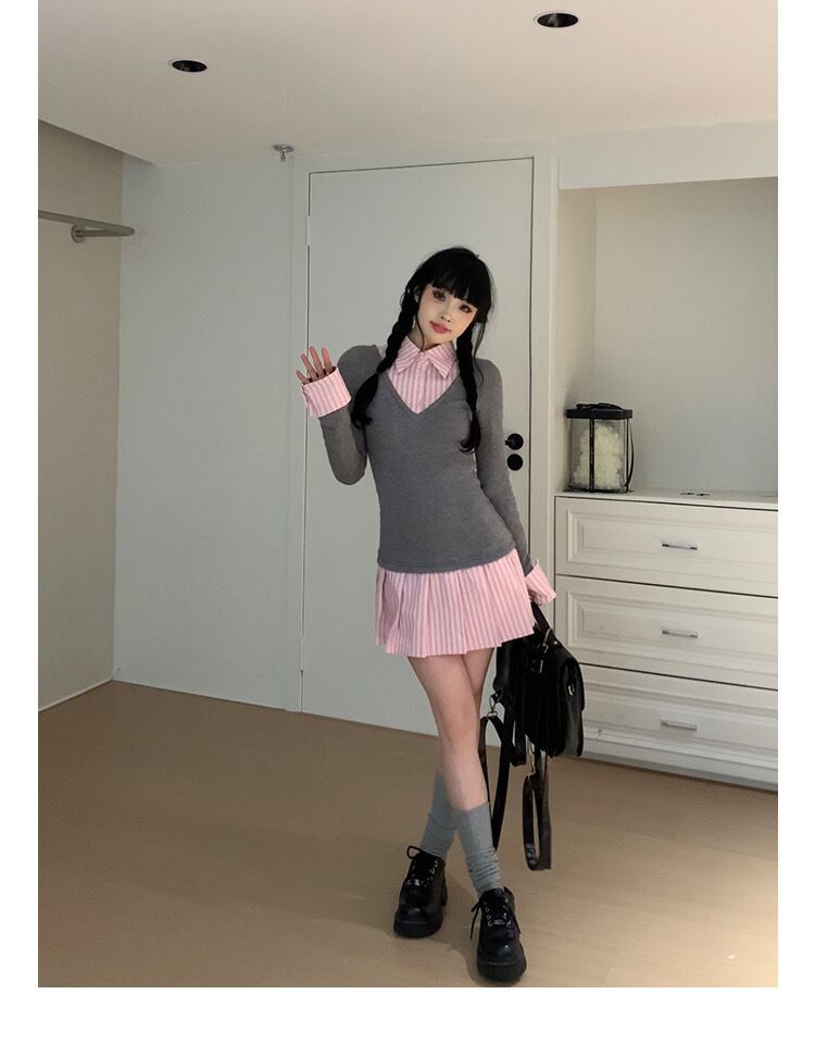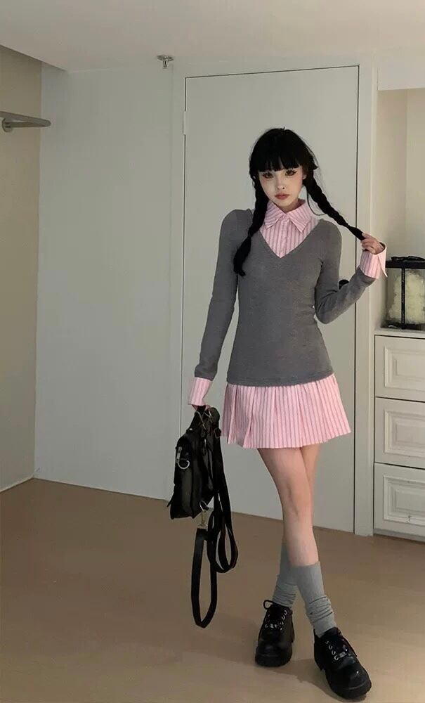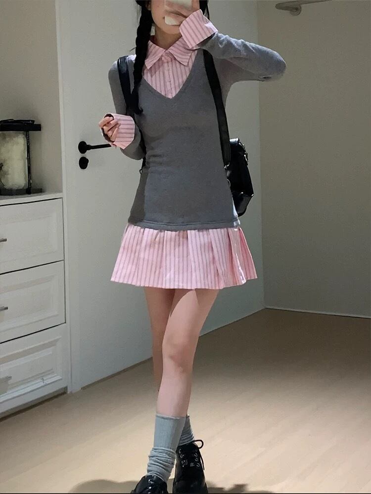 ガーリー ワンピース スクール チェック アームウォーマー リボン チェック グレー セーター 可愛い 原宿