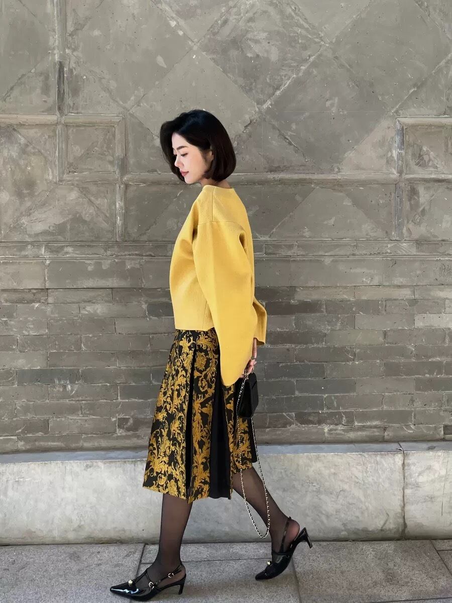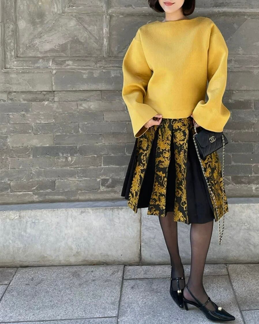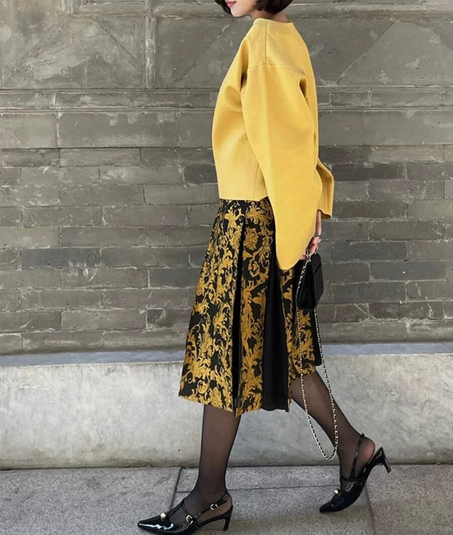 スカート ボトムス エレガント プリーツ 黄色 フラワー 花柄 マダム