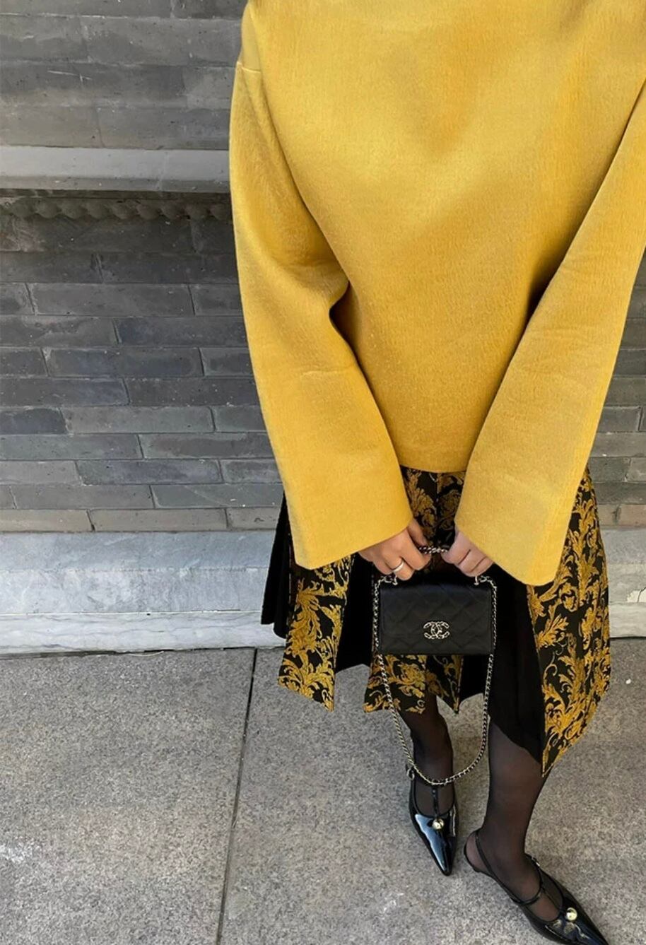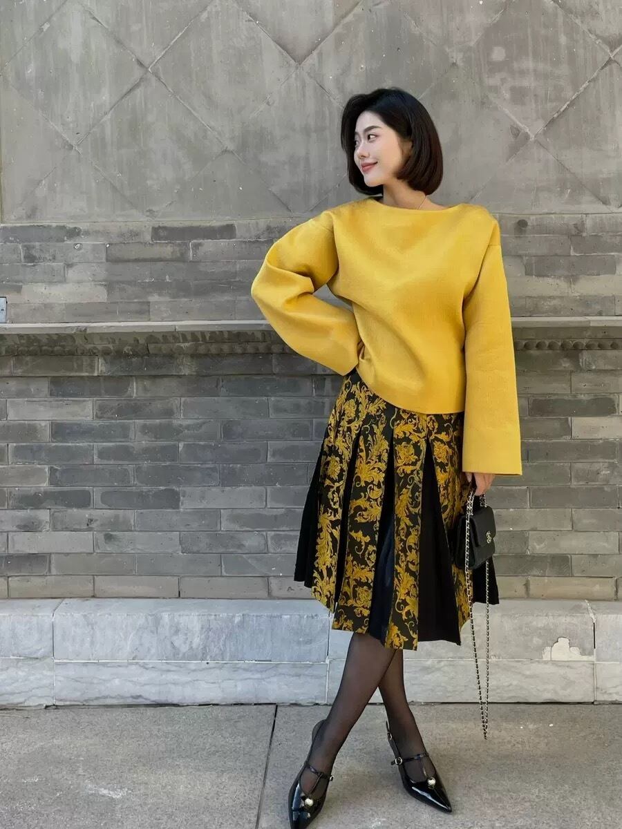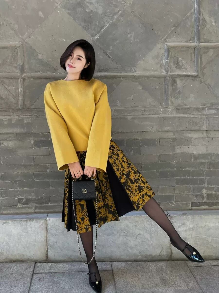 スカート ボトムス エレガント プリーツ 黄色 フラワー 花柄 マダム