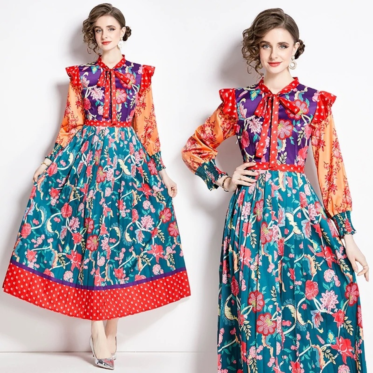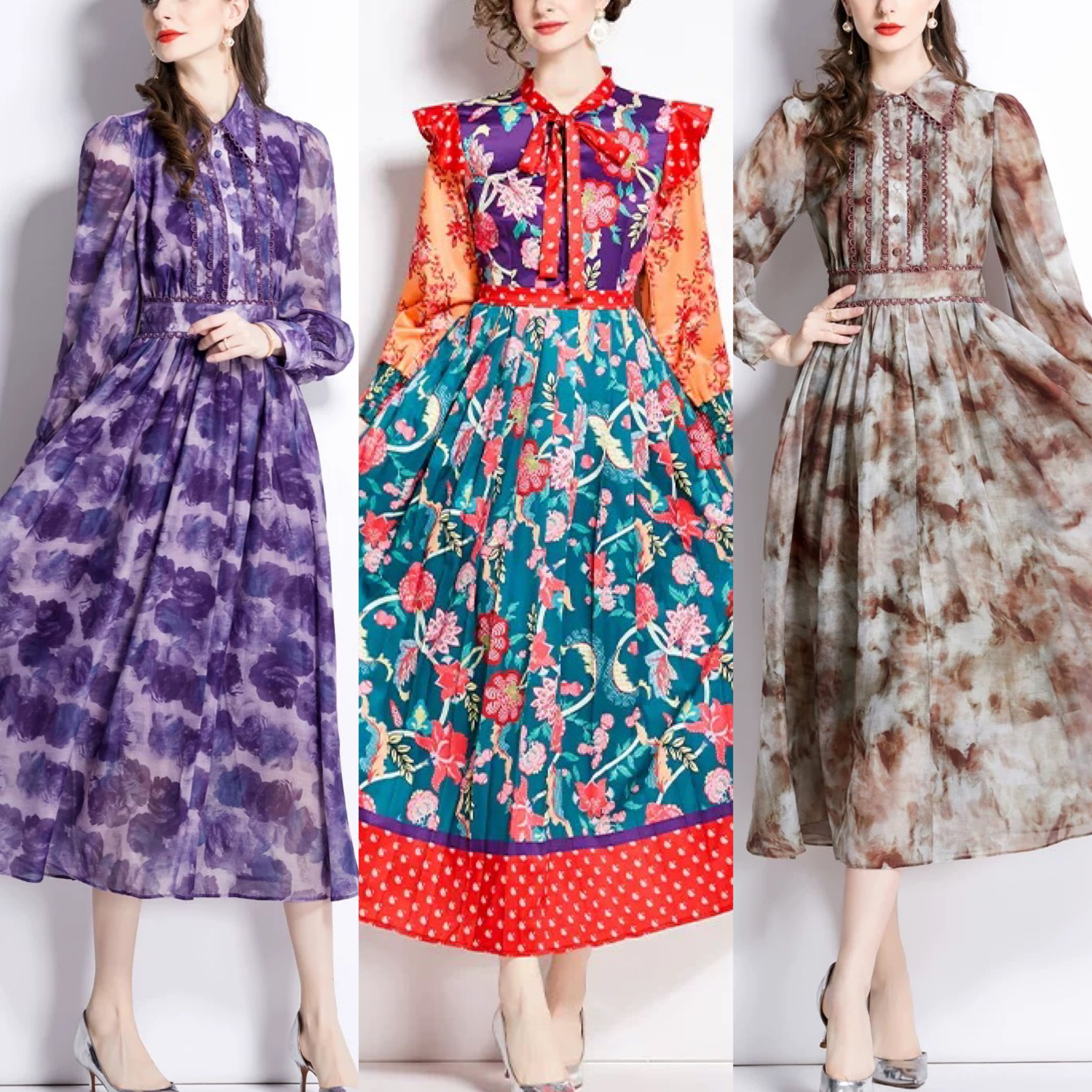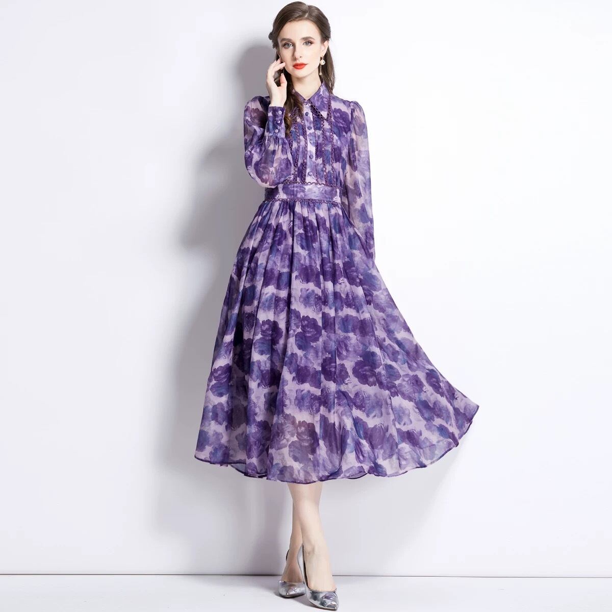 【2XLまで】オレンジ 花柄 グラデーション 茶色 紫 ワンピース
