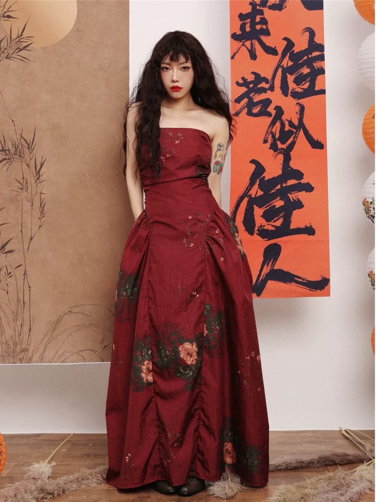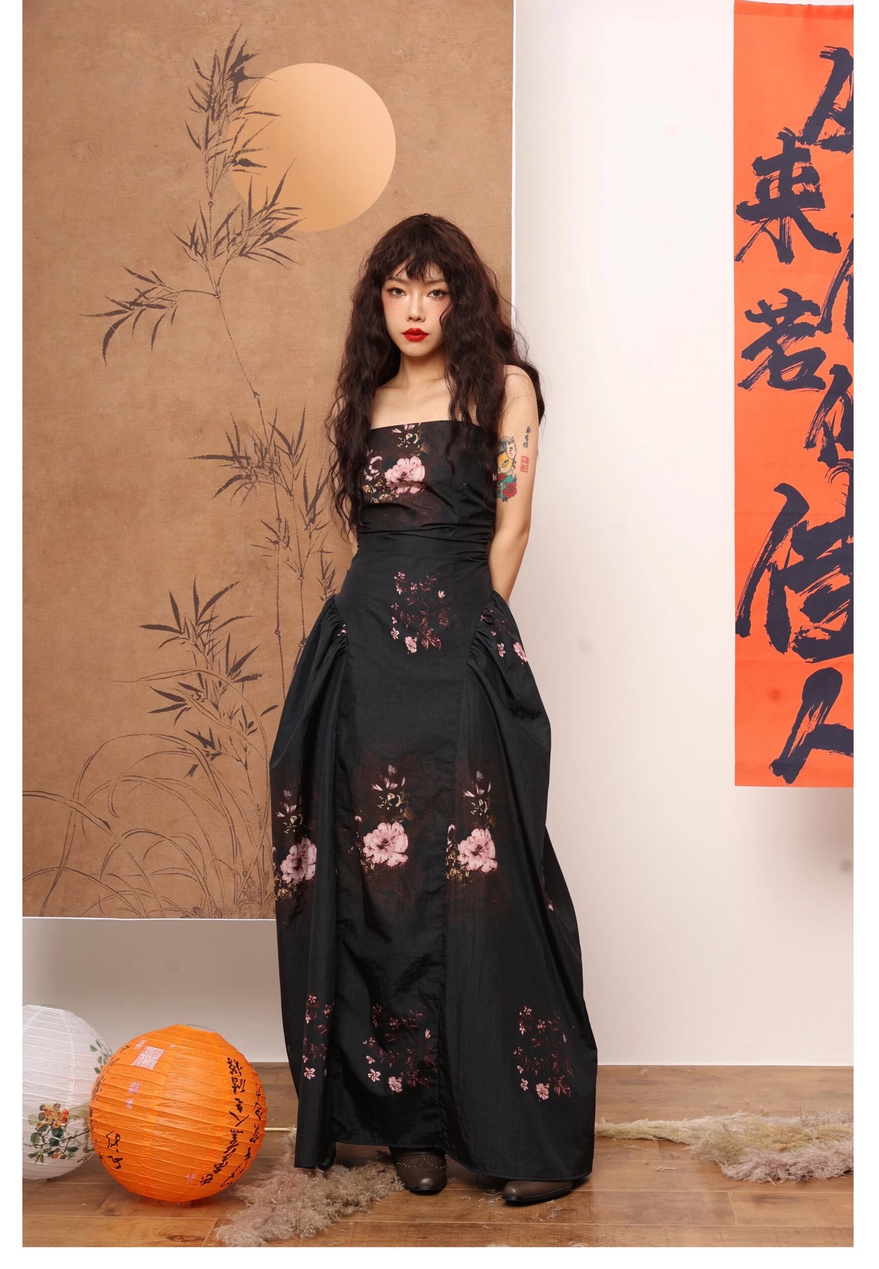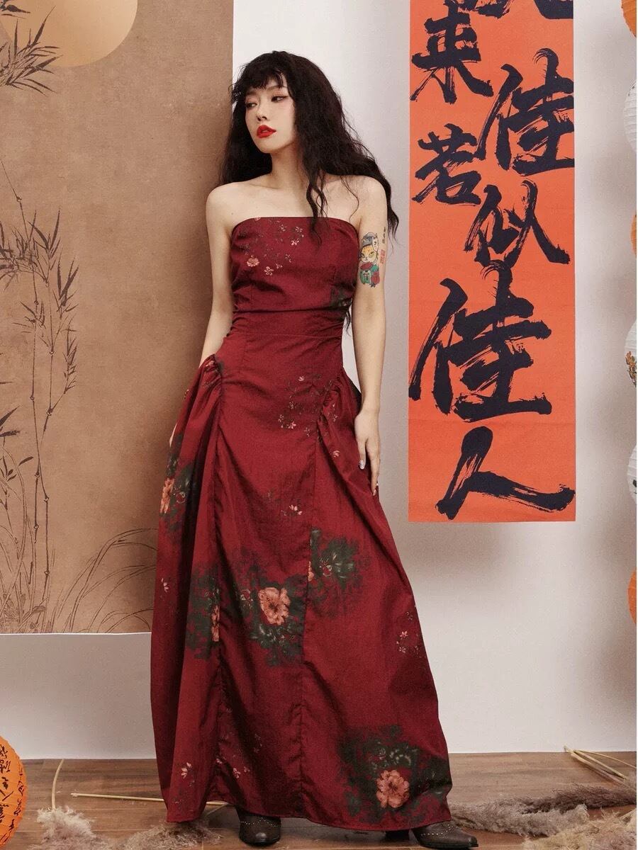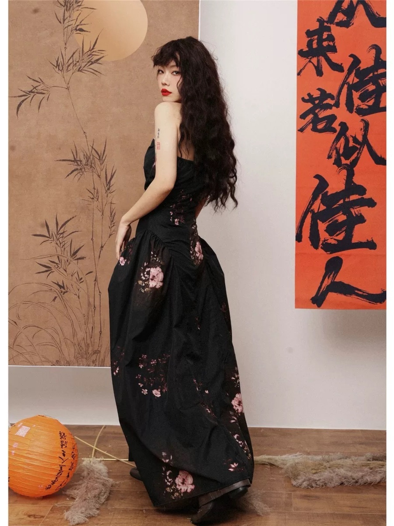 ベアトップ 花柄 フラワー 黒 赤 ドレス 和柄 ワンピース
