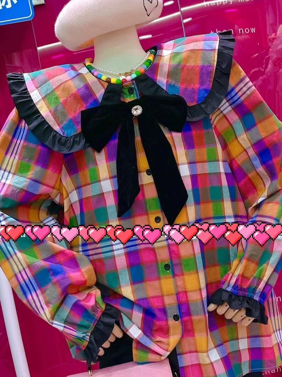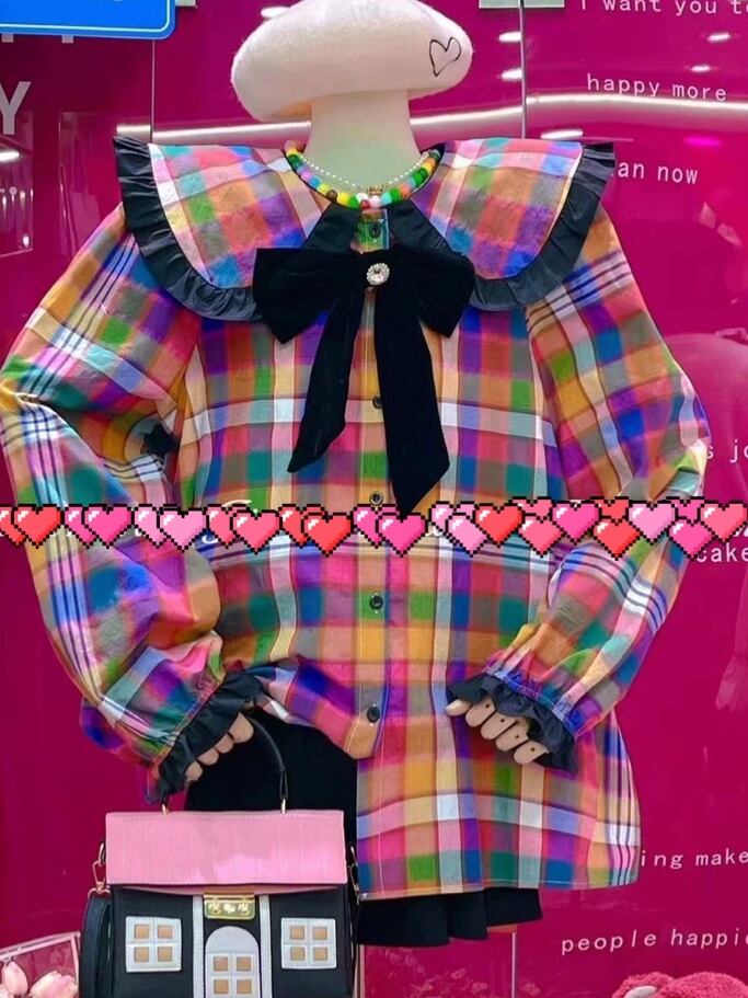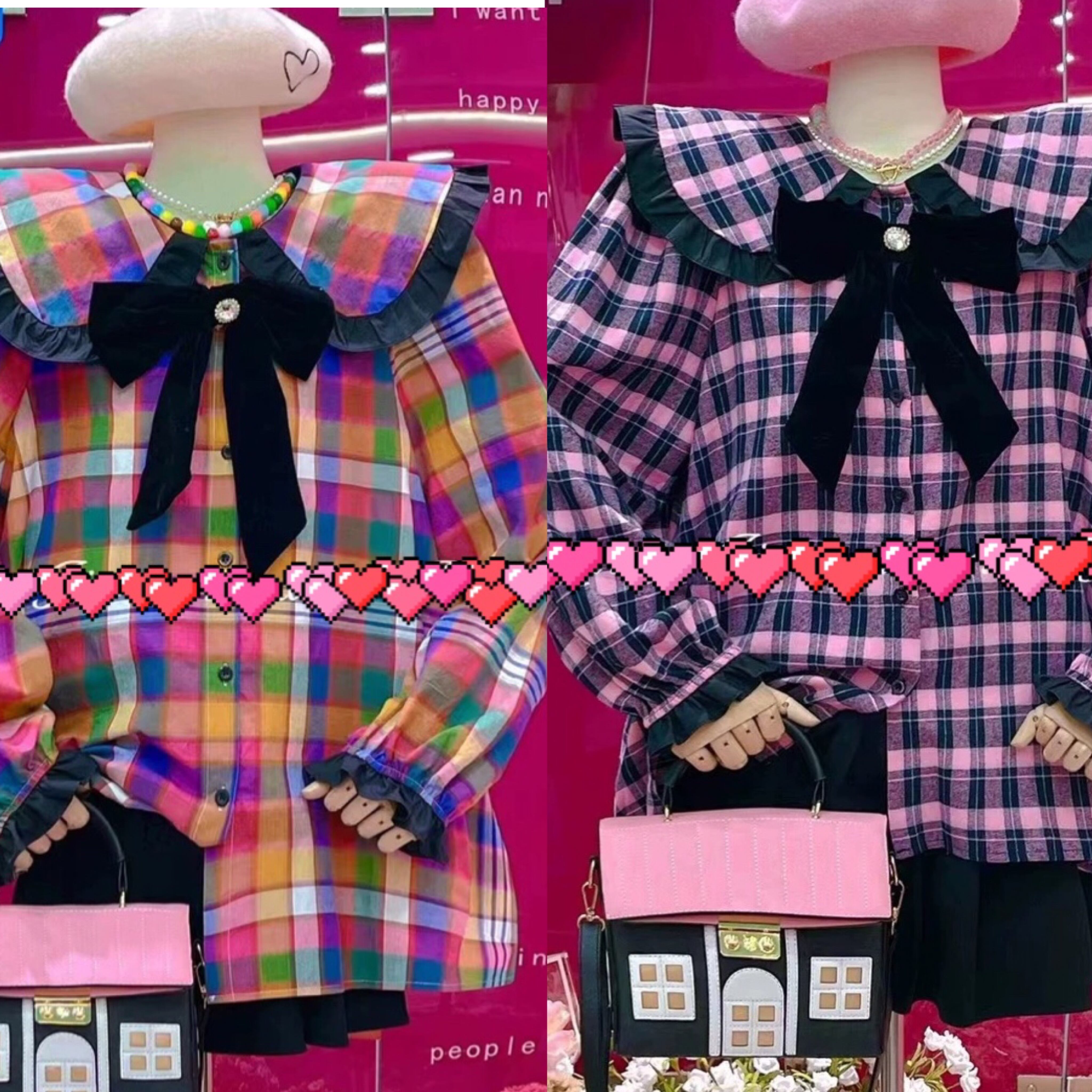 ブラウス 丸襟 リボン チェック オレンジ カジュアル ピンク